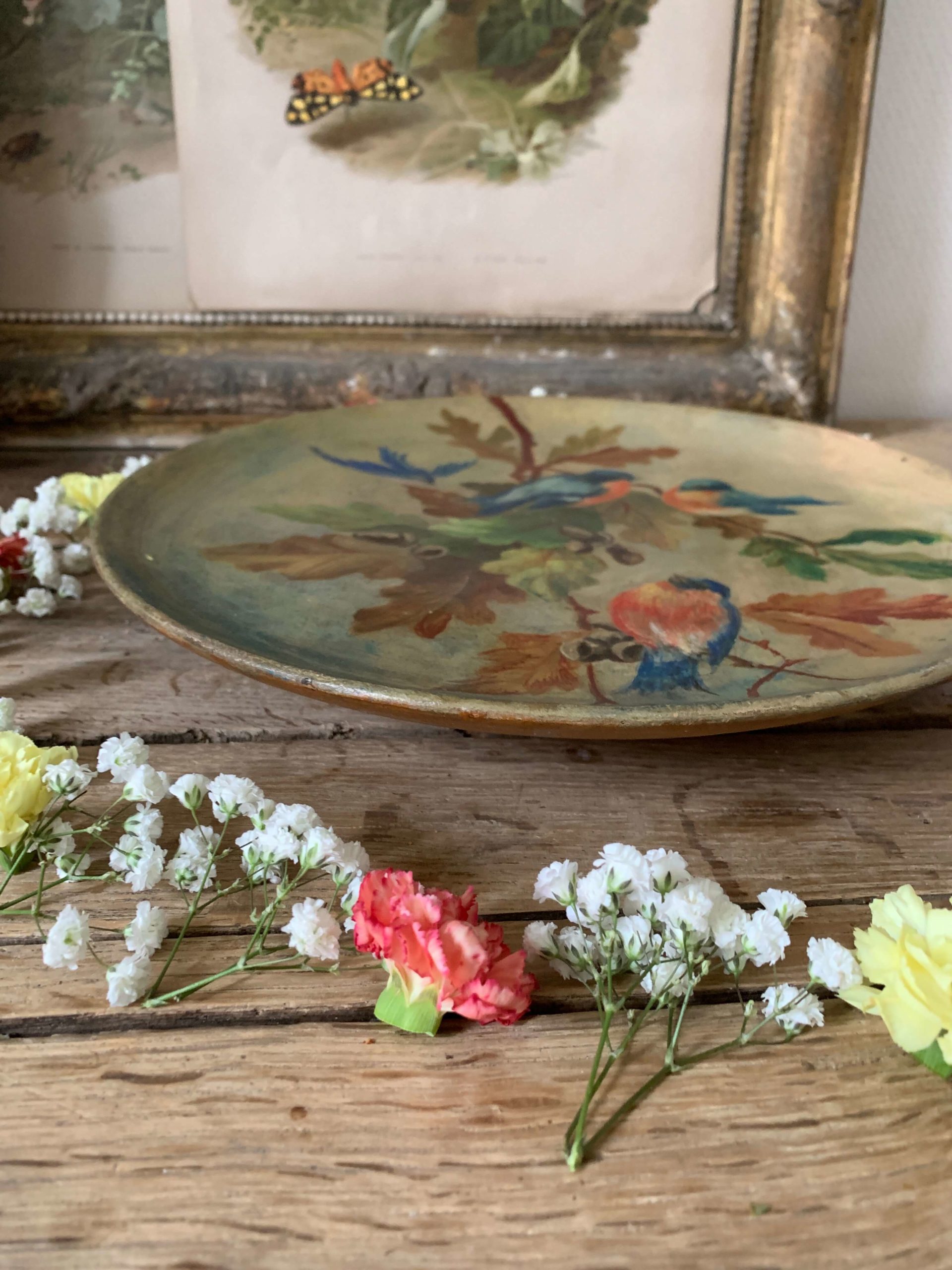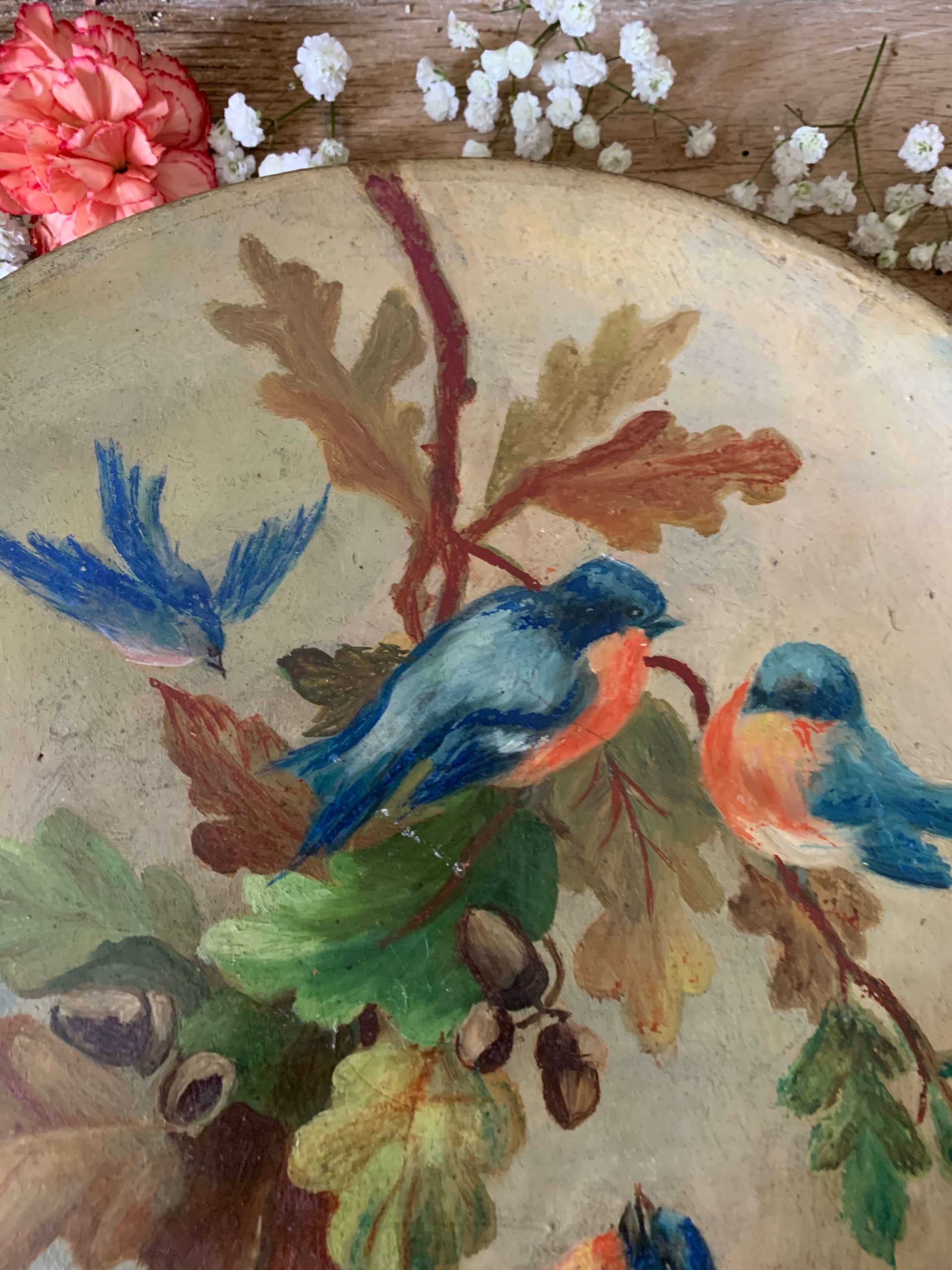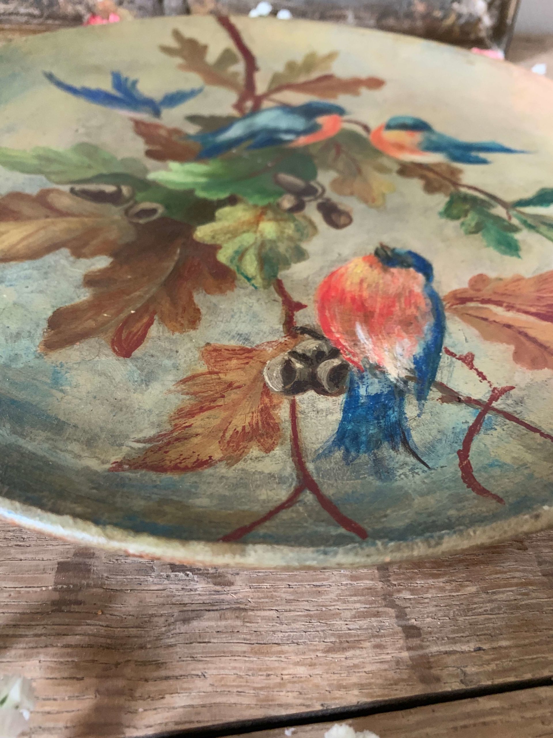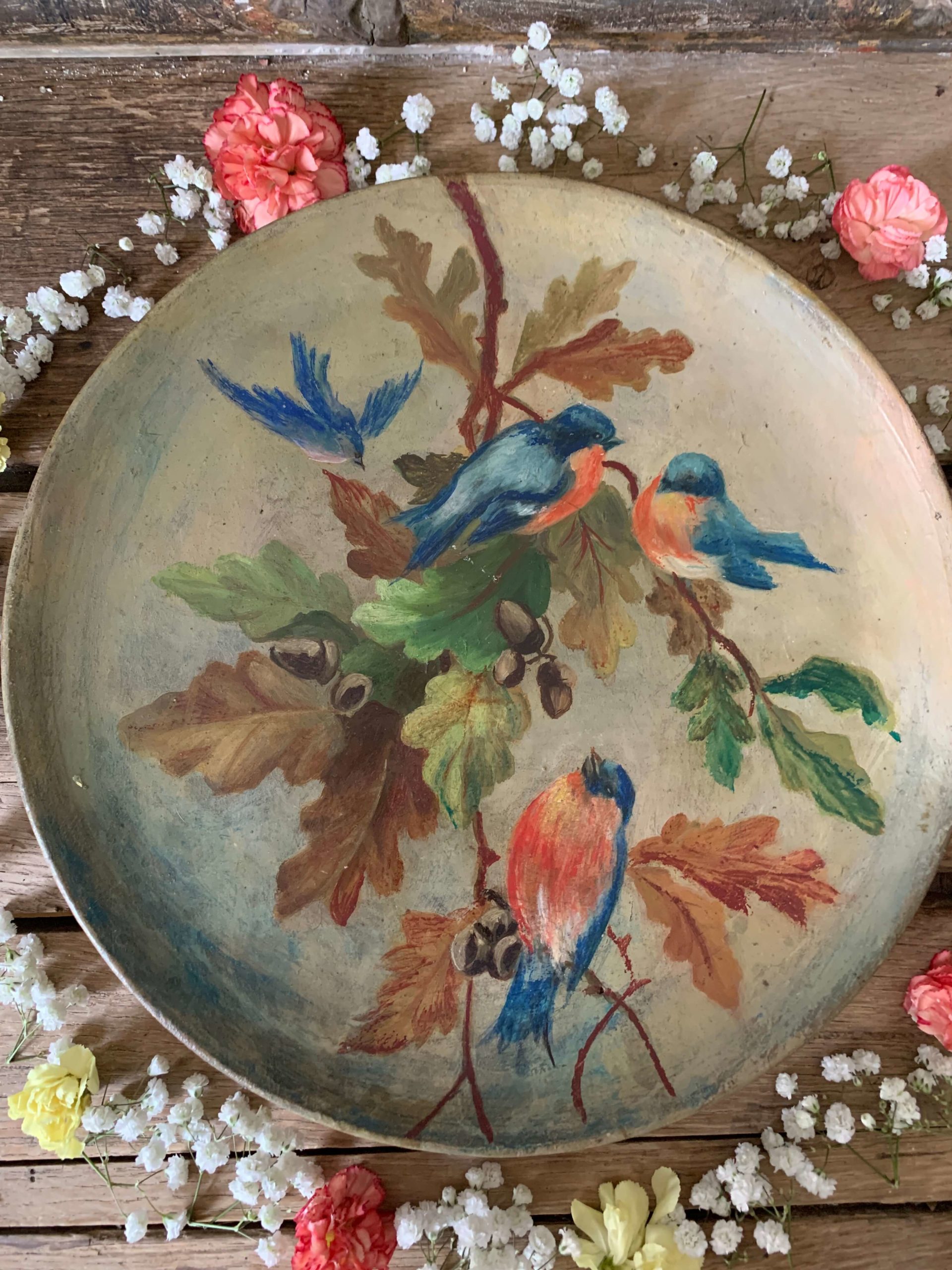 Rupture de stockMagnifique plat peint en terre cuite, représentant de petits oiseaux sur une branche de chêne.