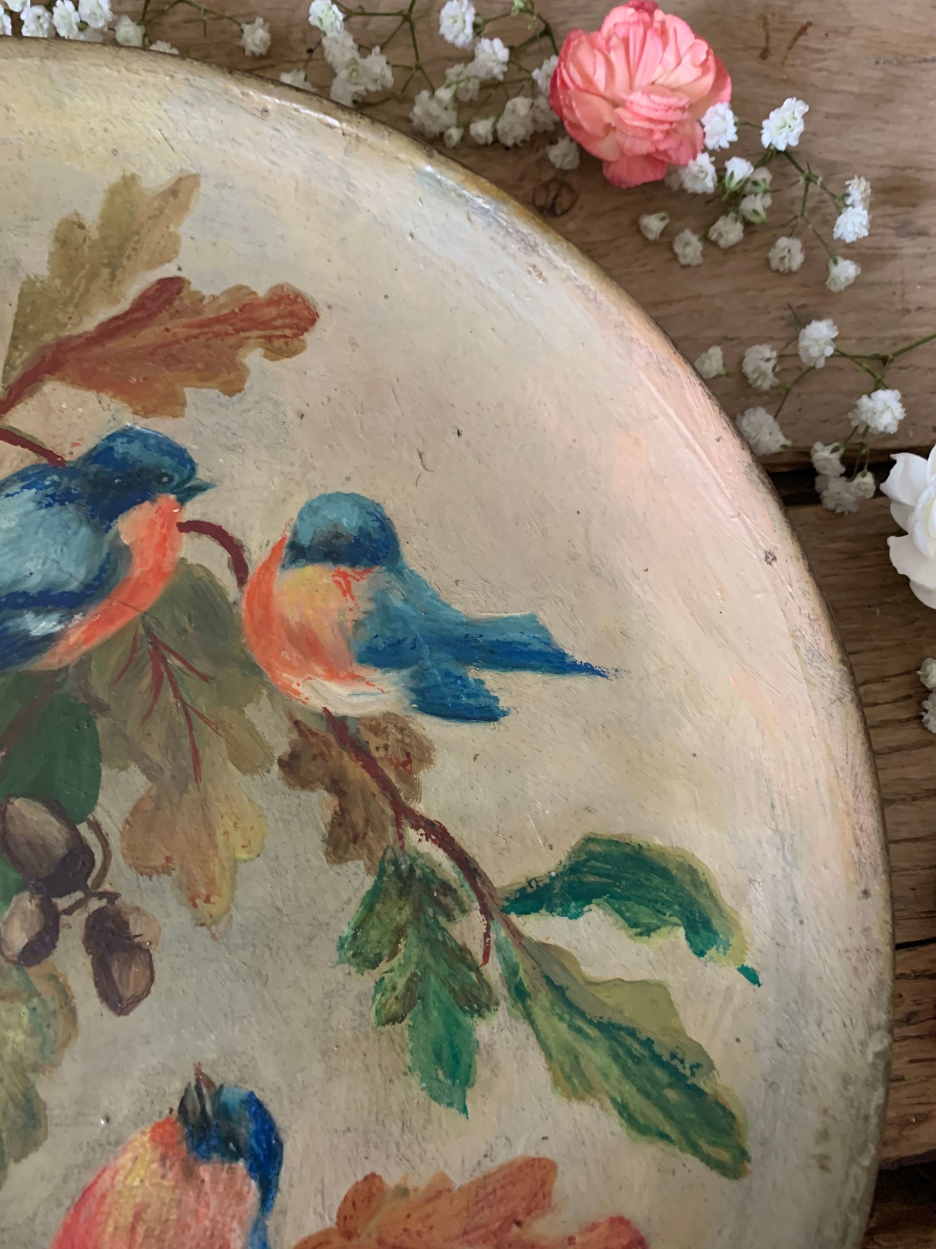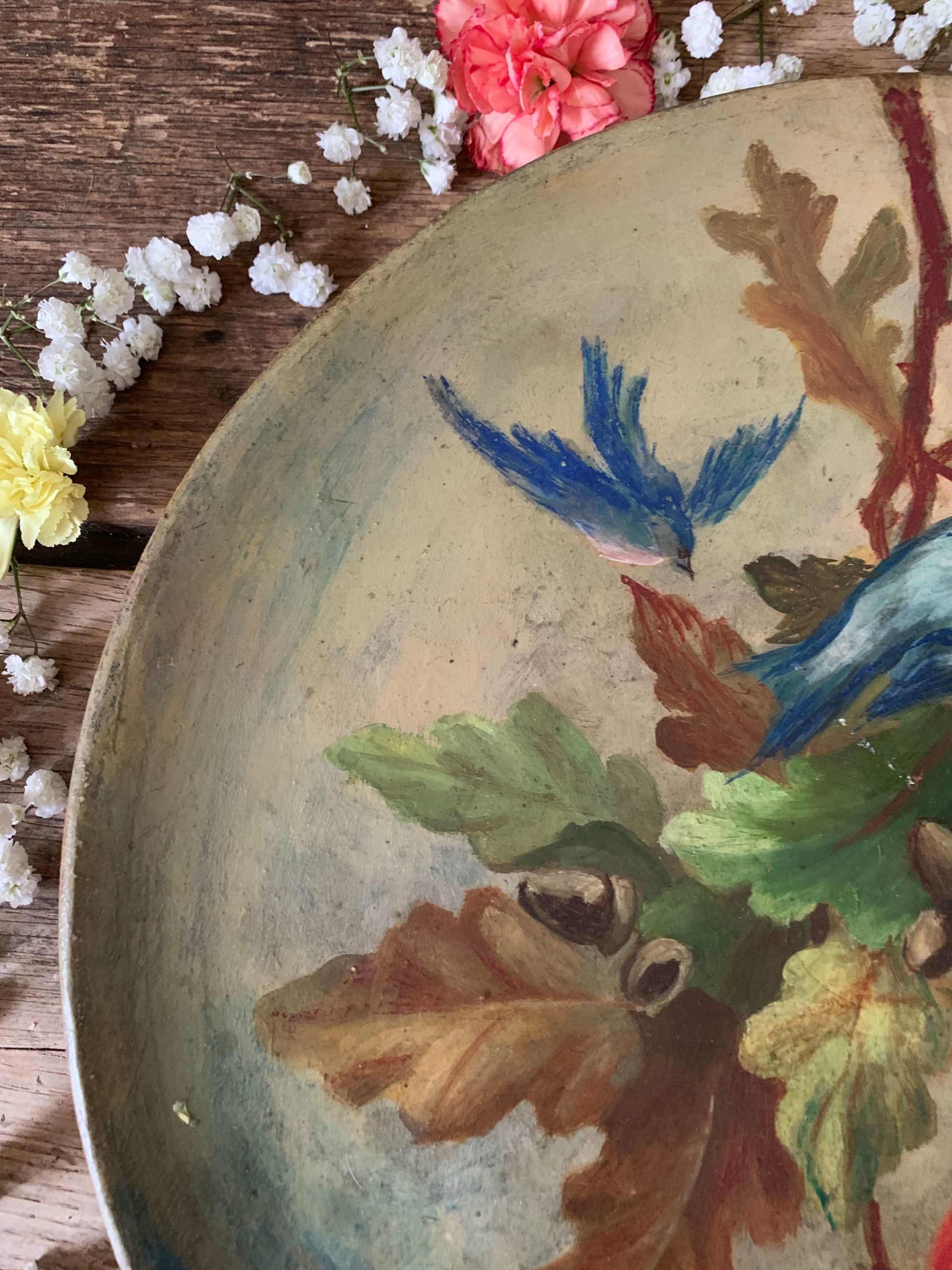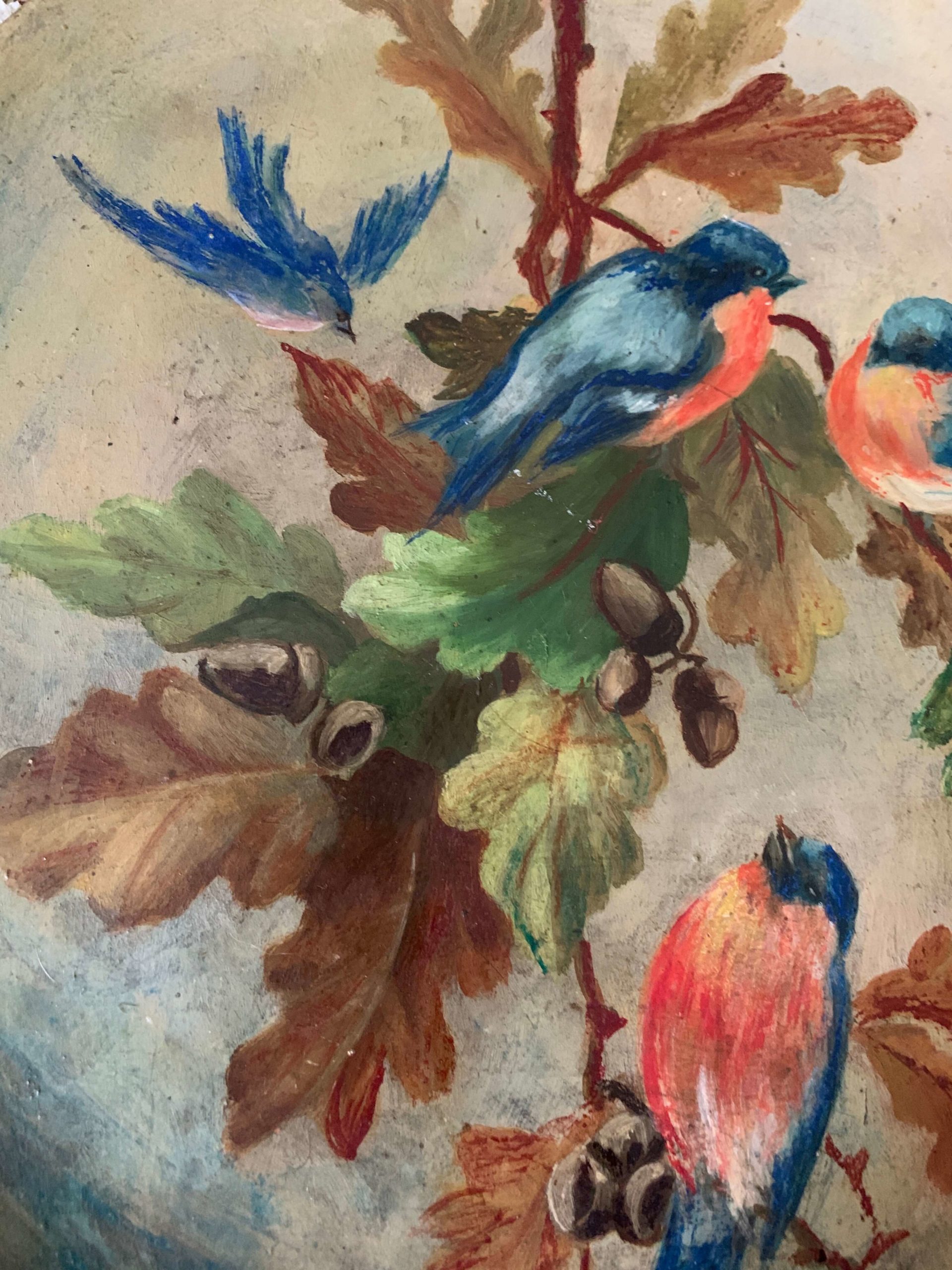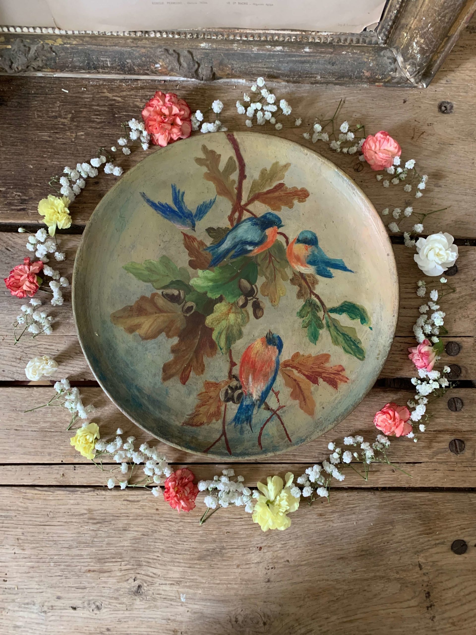 Rupture de stockMagnifique plat peint en terre cuite, représentant de petits oiseaux sur une branche de chêne.