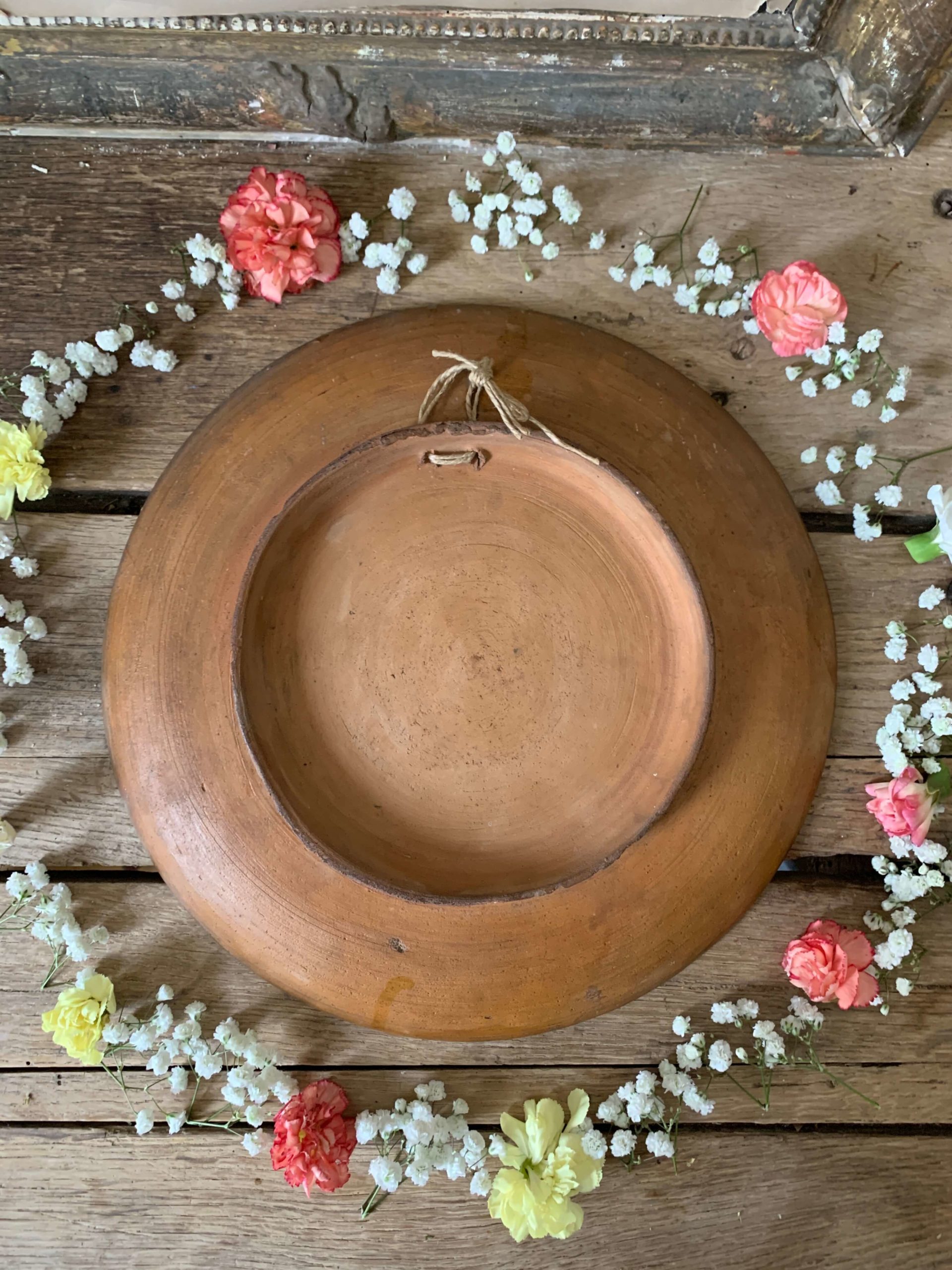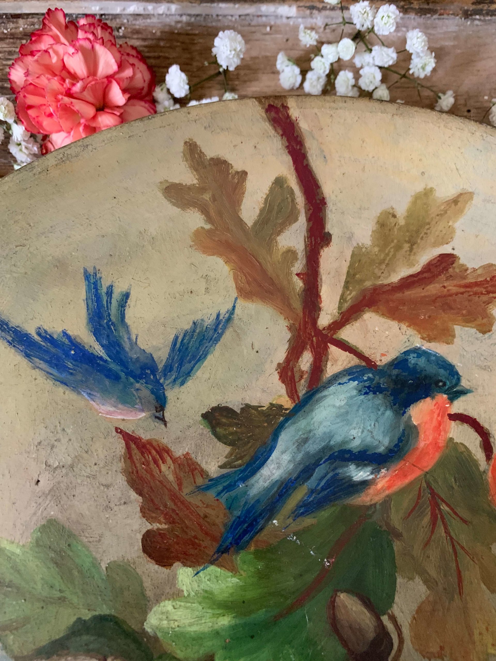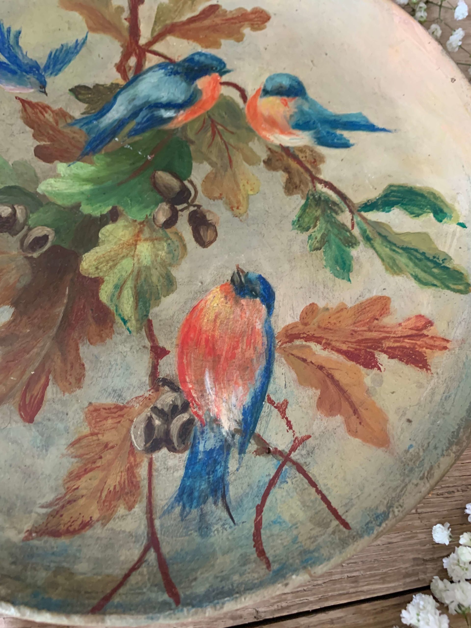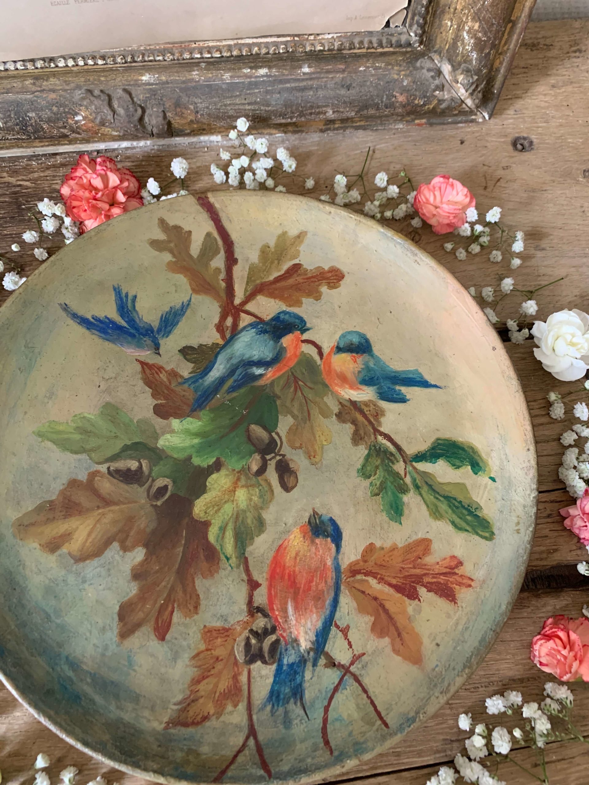 Rupture de stockMagnifique plat peint en terre cuite, représentant de petits oiseaux sur une branche de chêne.