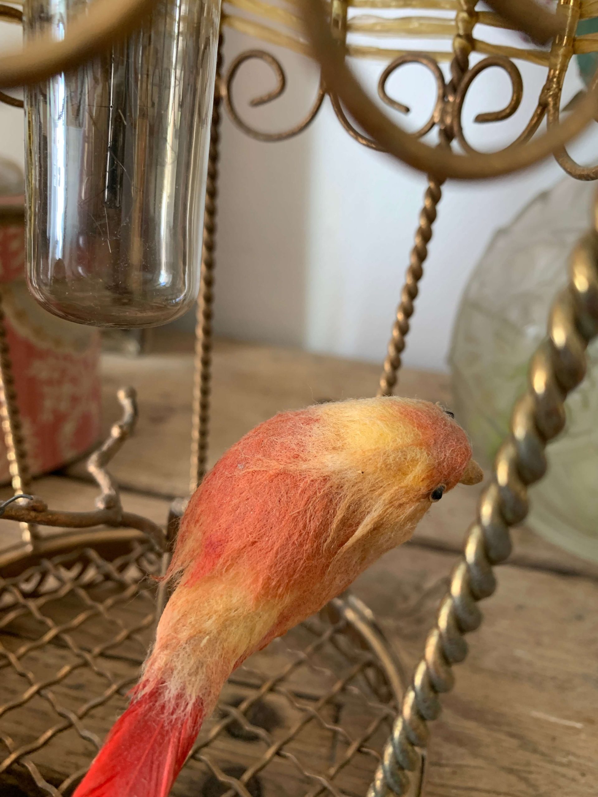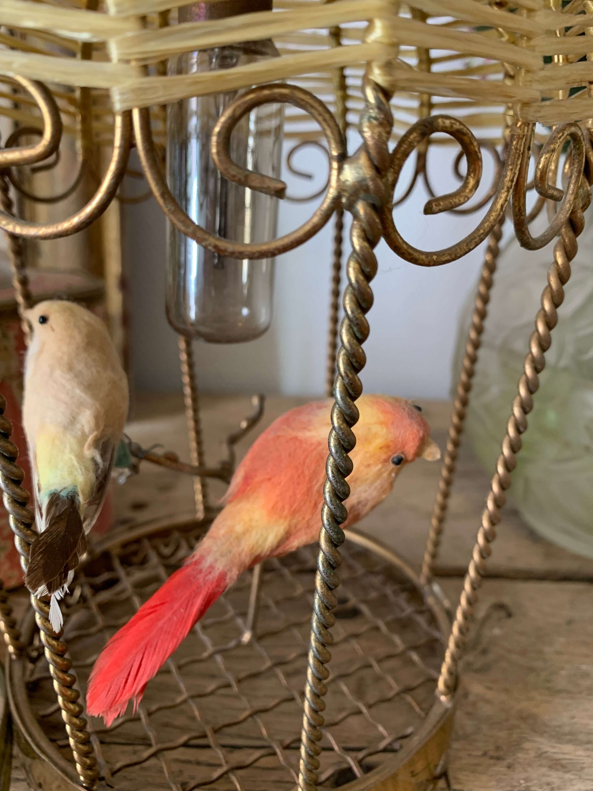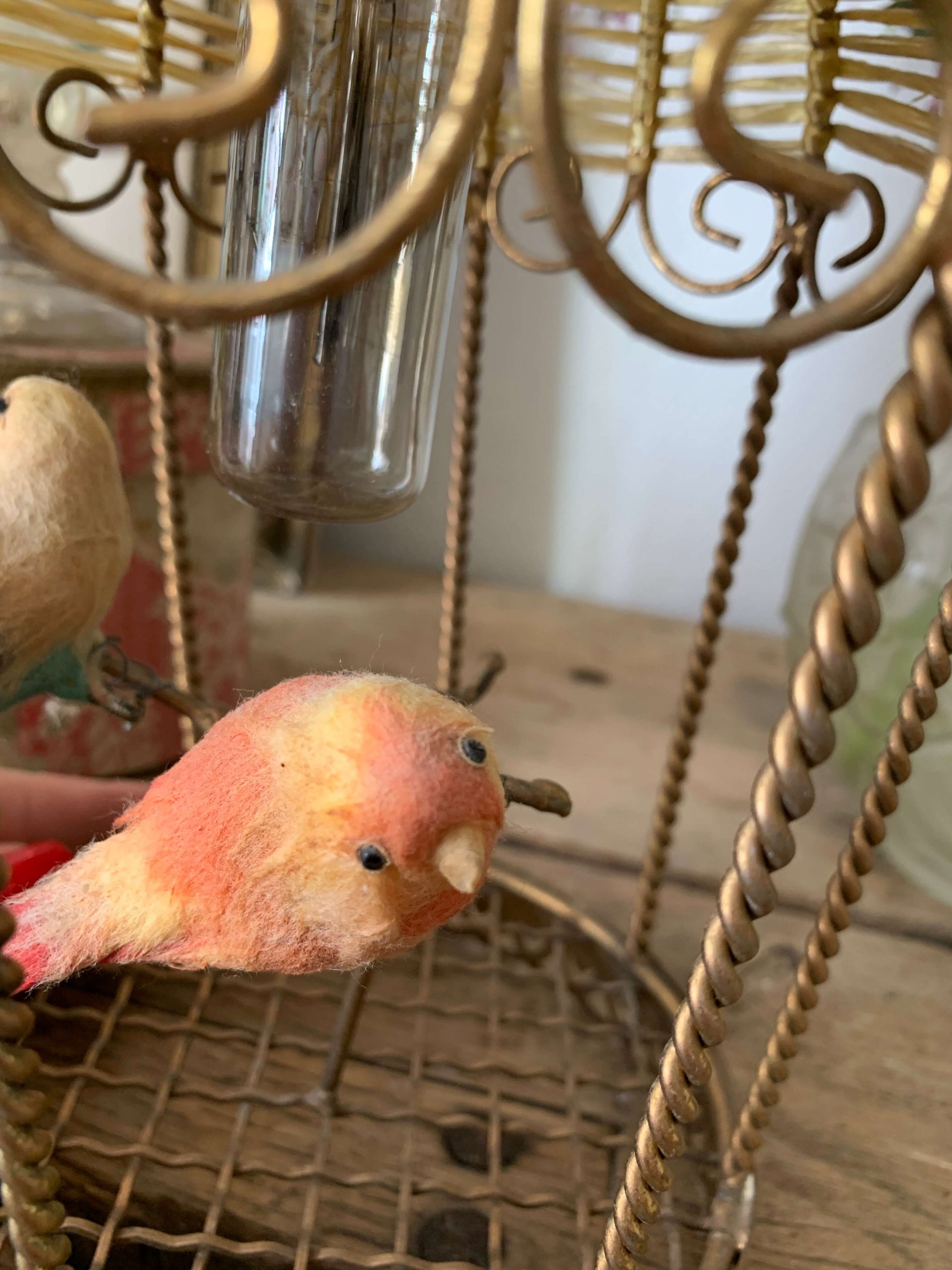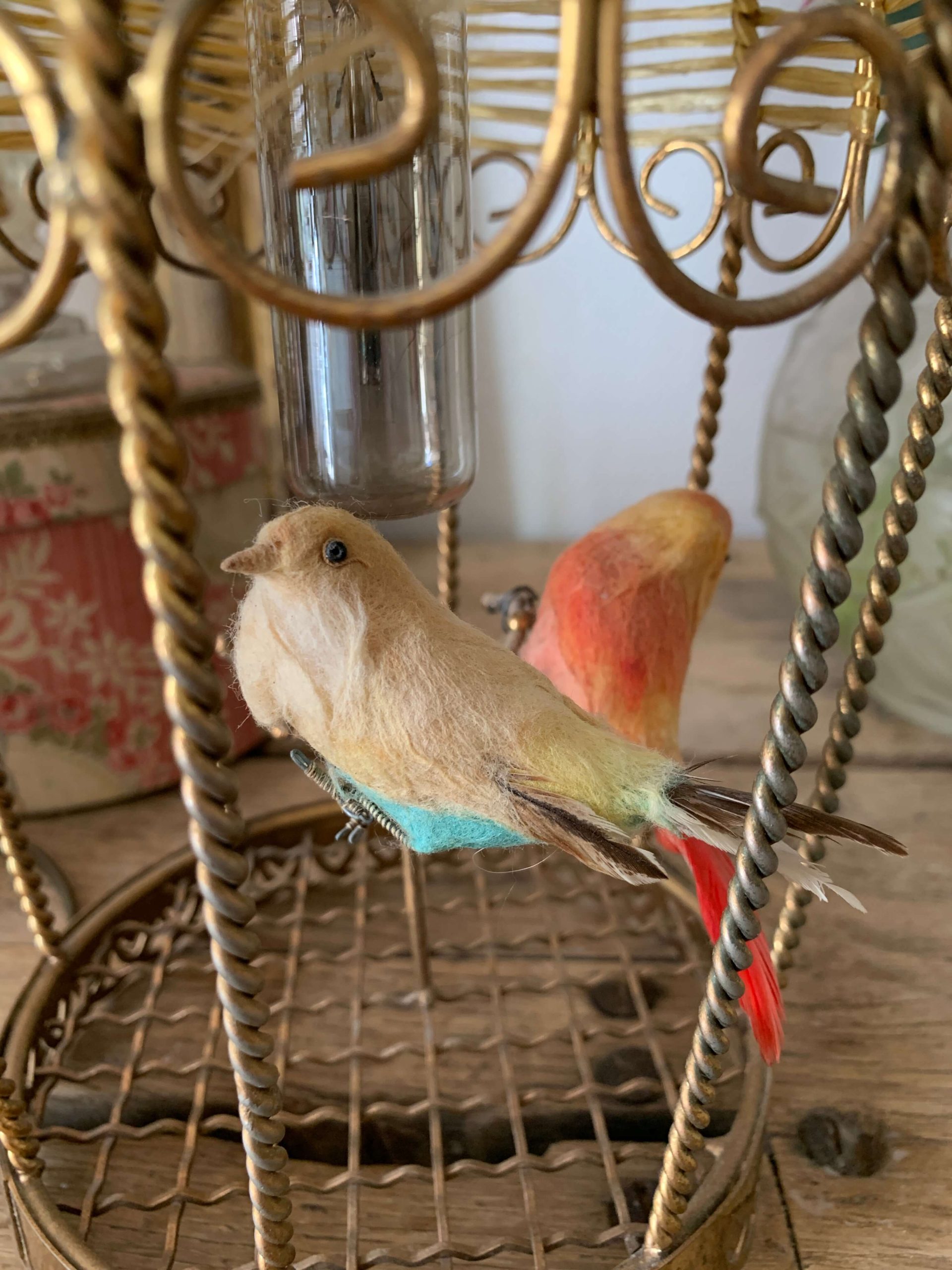 La structure est en métal doré, les petits oiseaux en feutrine, les queues sont en plumes.