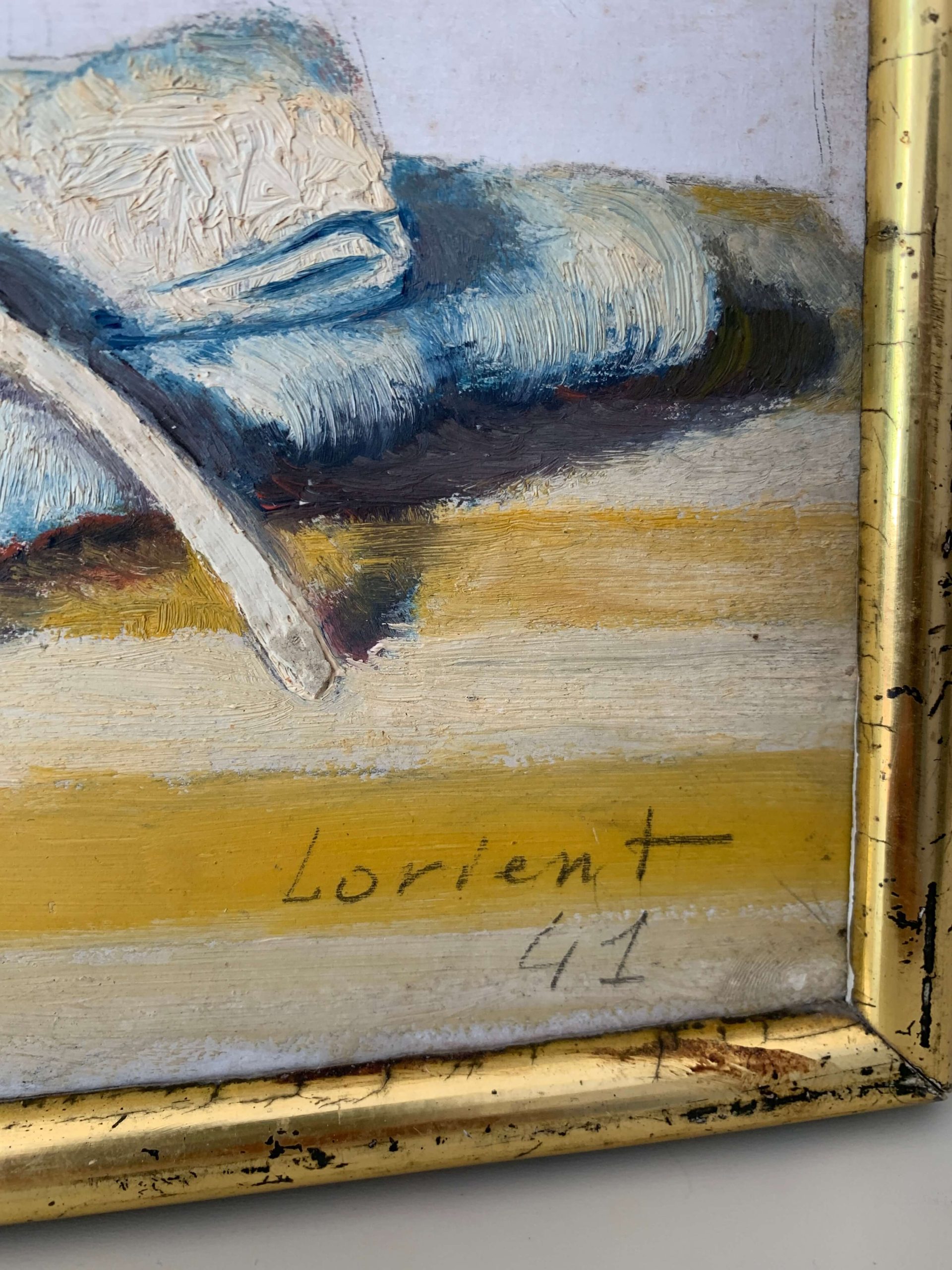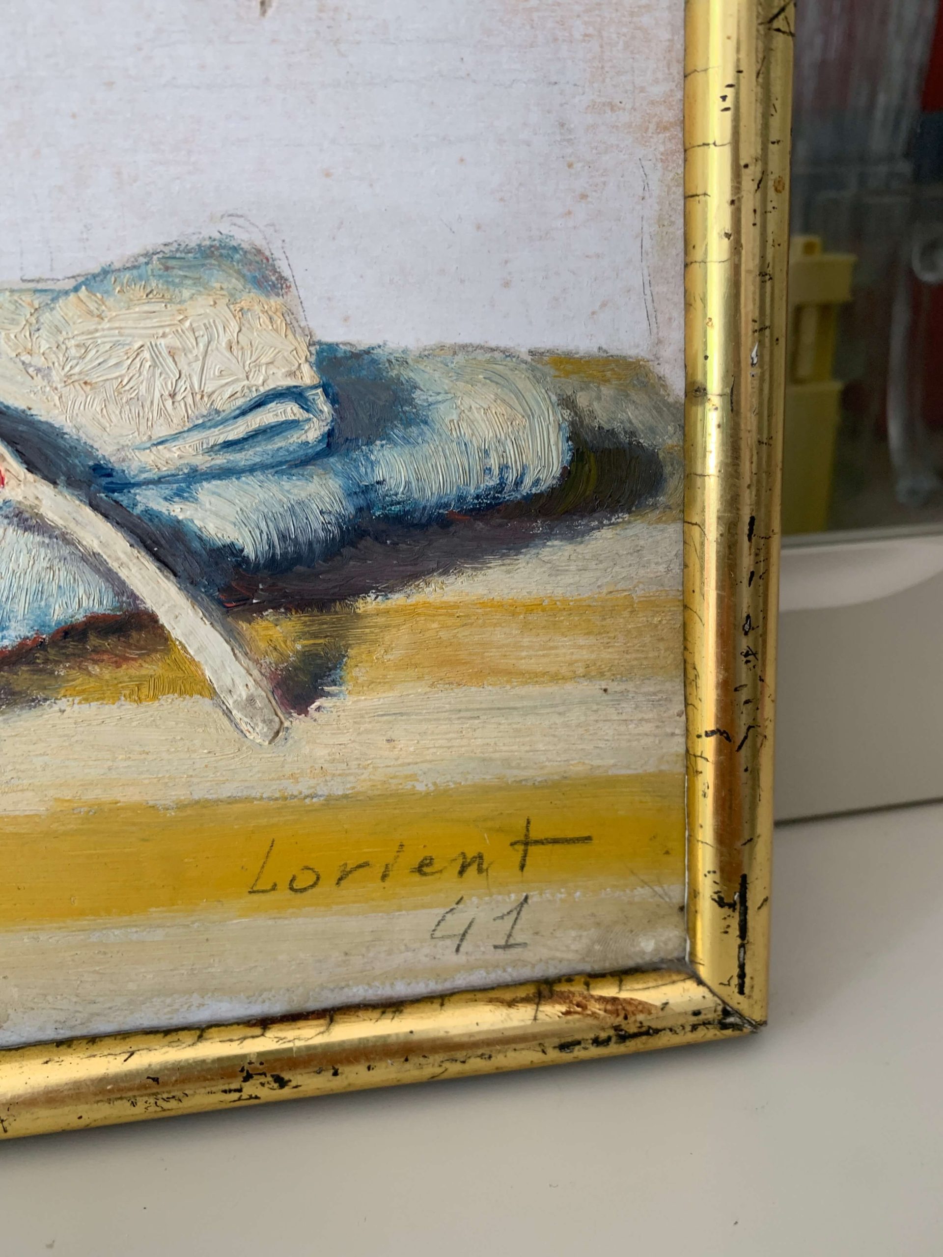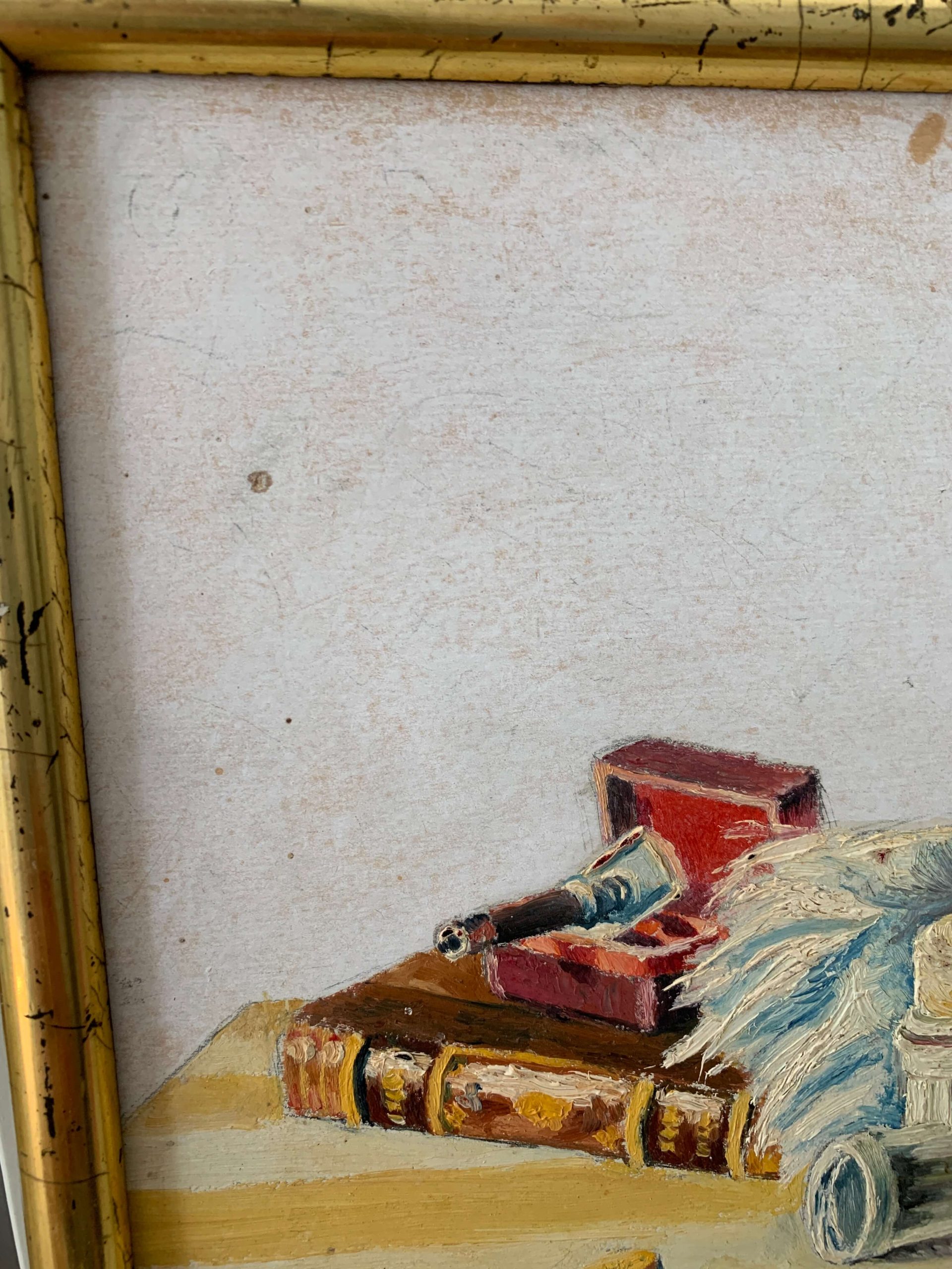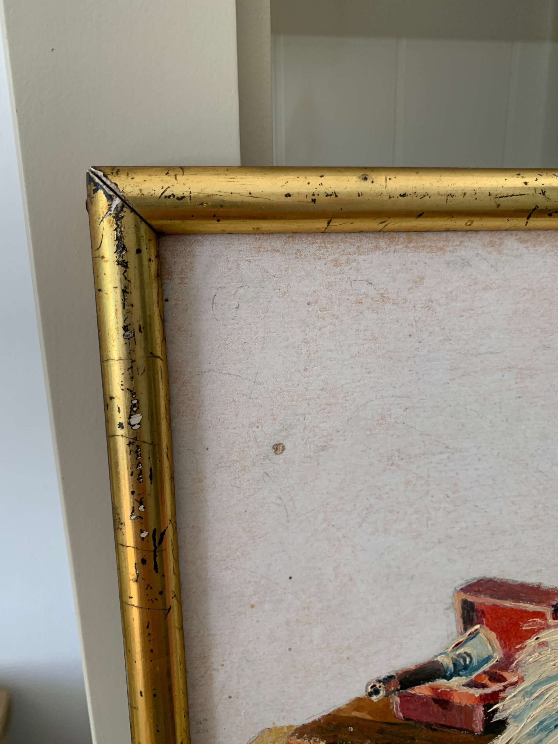 Il s’agit d’une huile sur carton encadrée dans un cadre en bois et stuc doré.