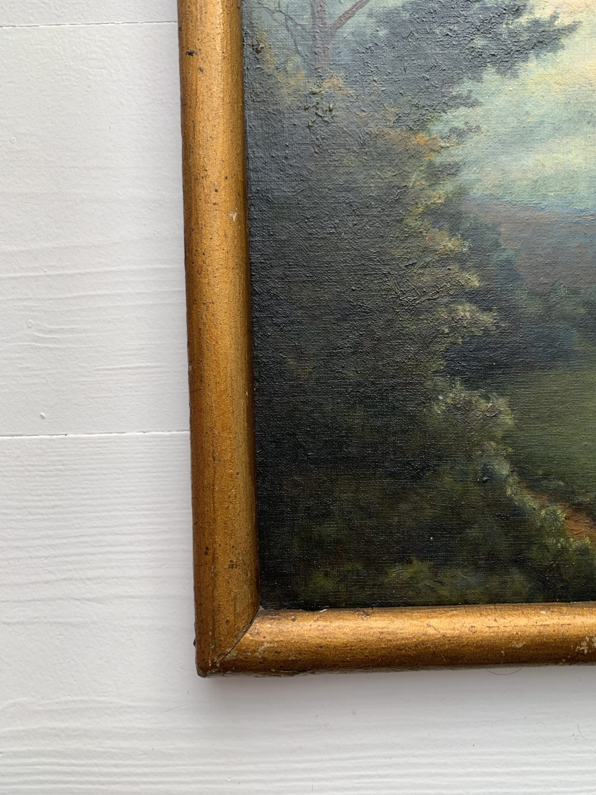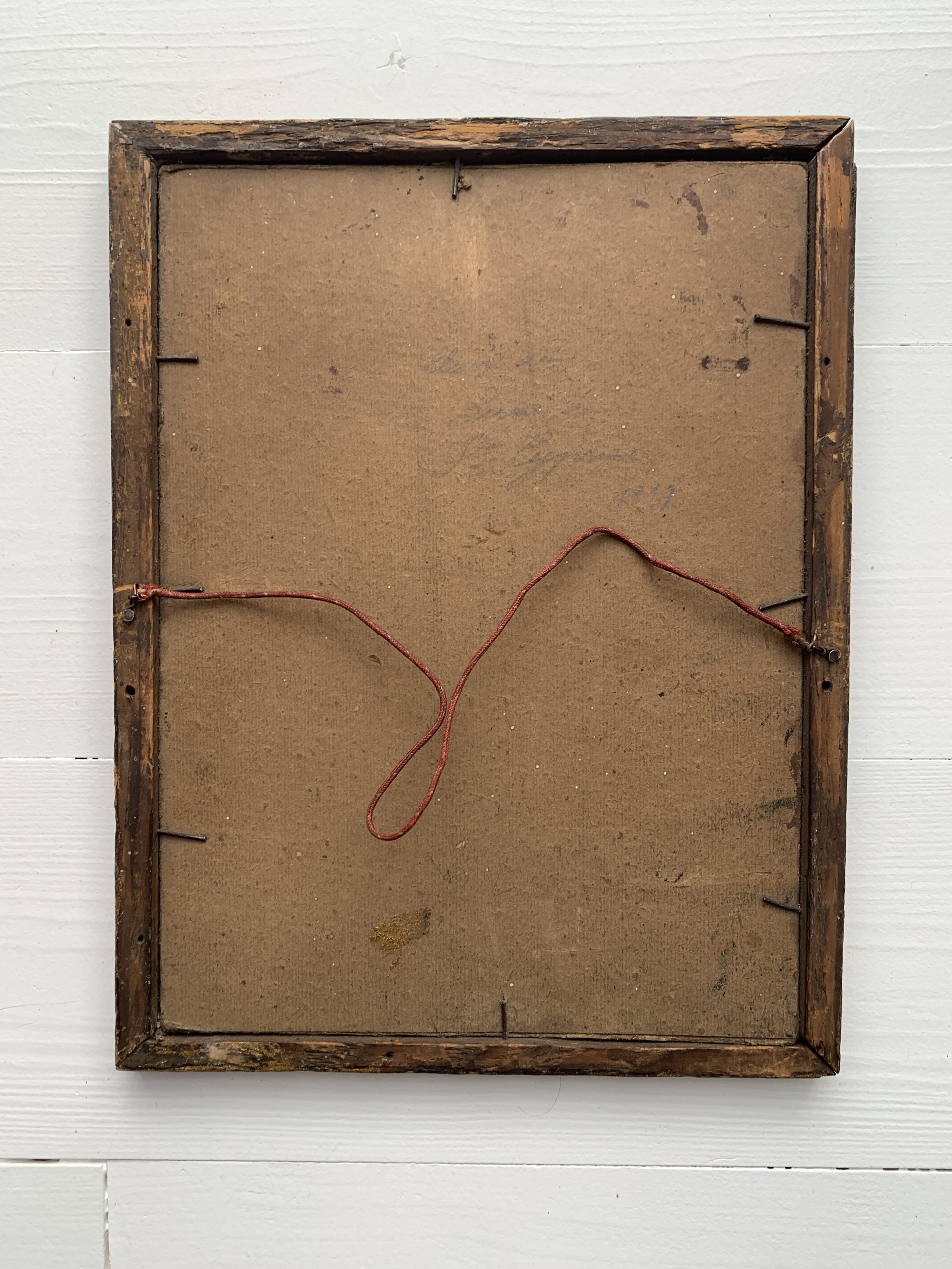 Elle est encadrée dans son cadre en bois et stuc doré datant de la même époque. La dorure du cadre est d’origine.