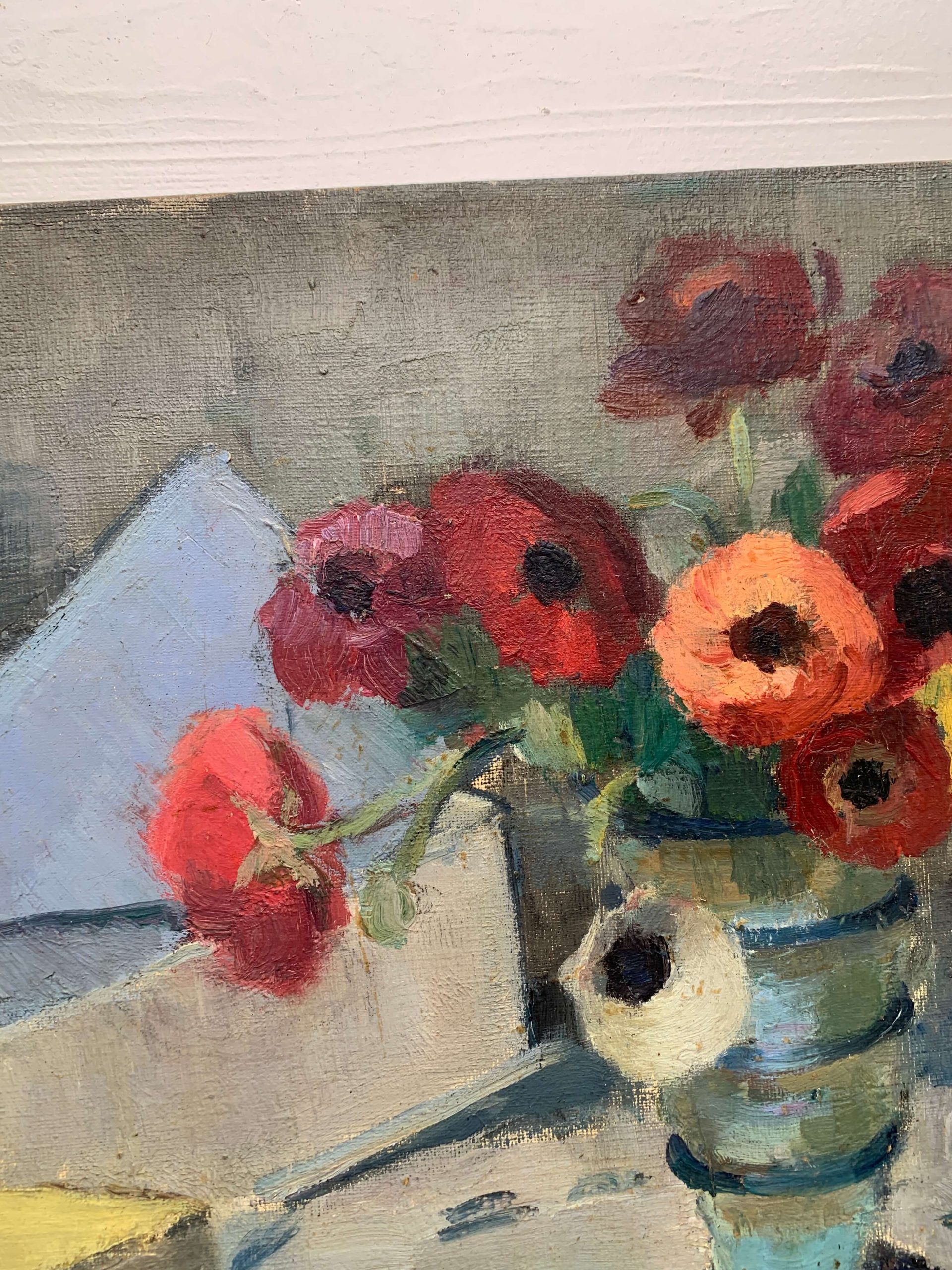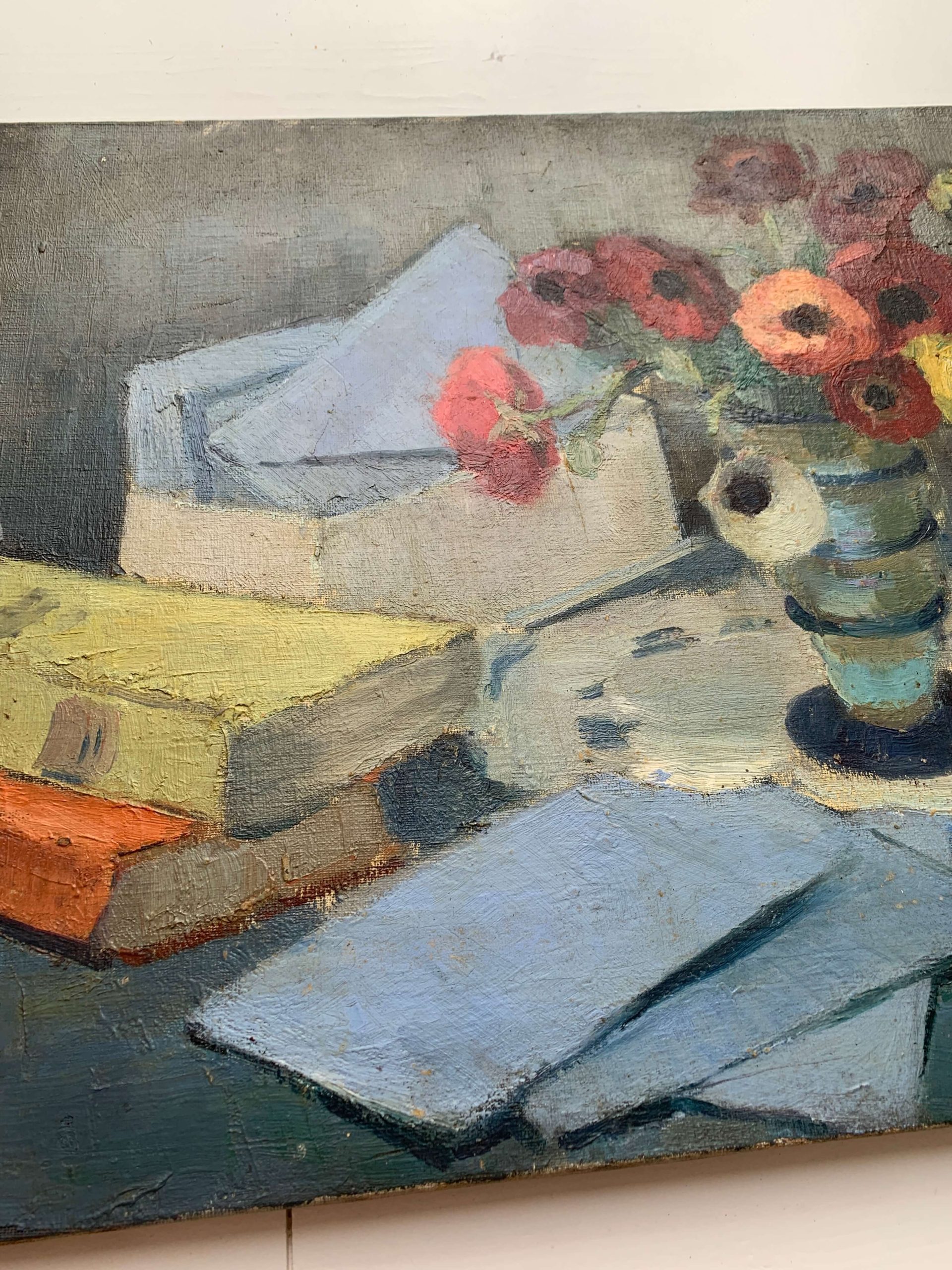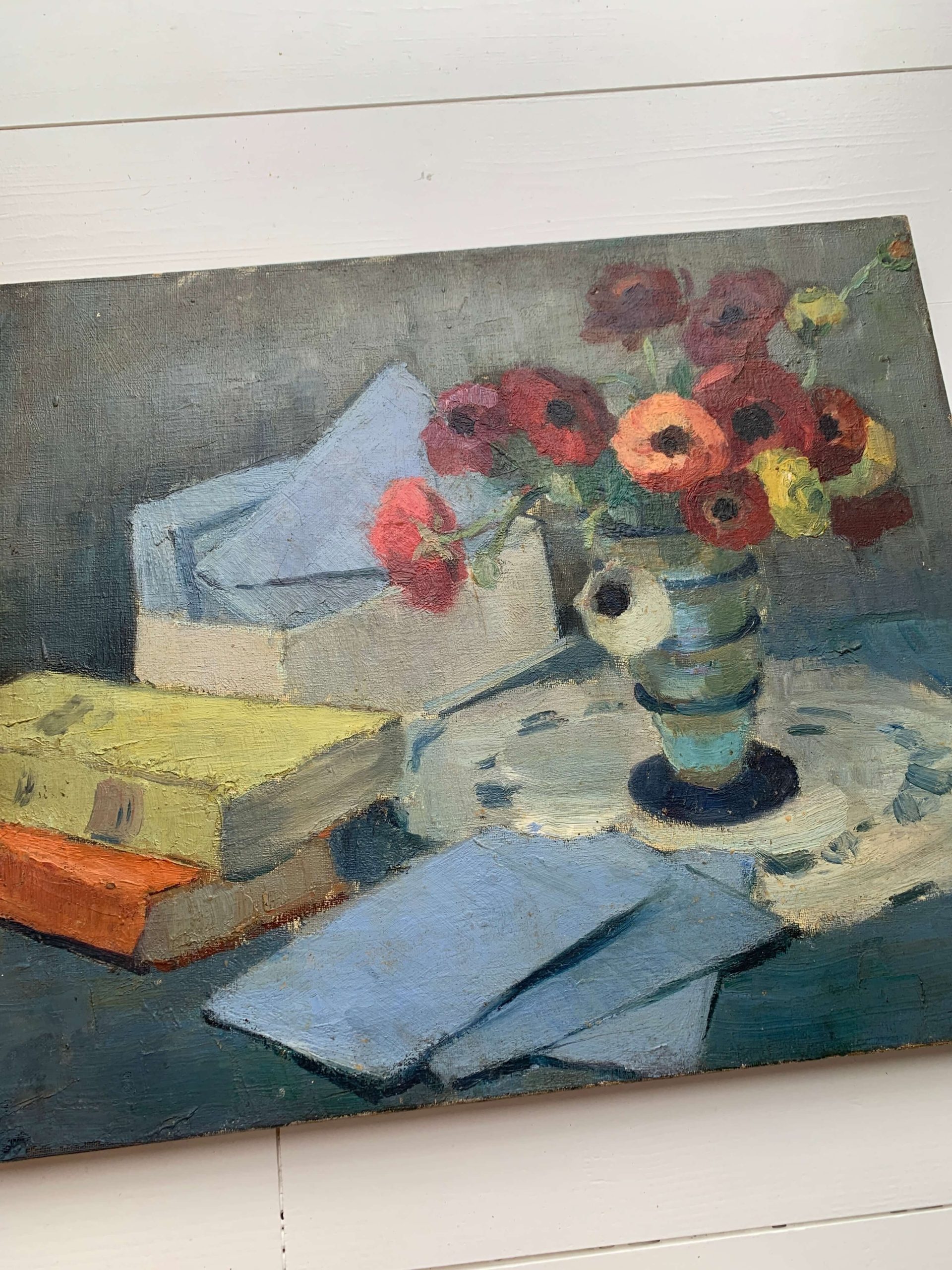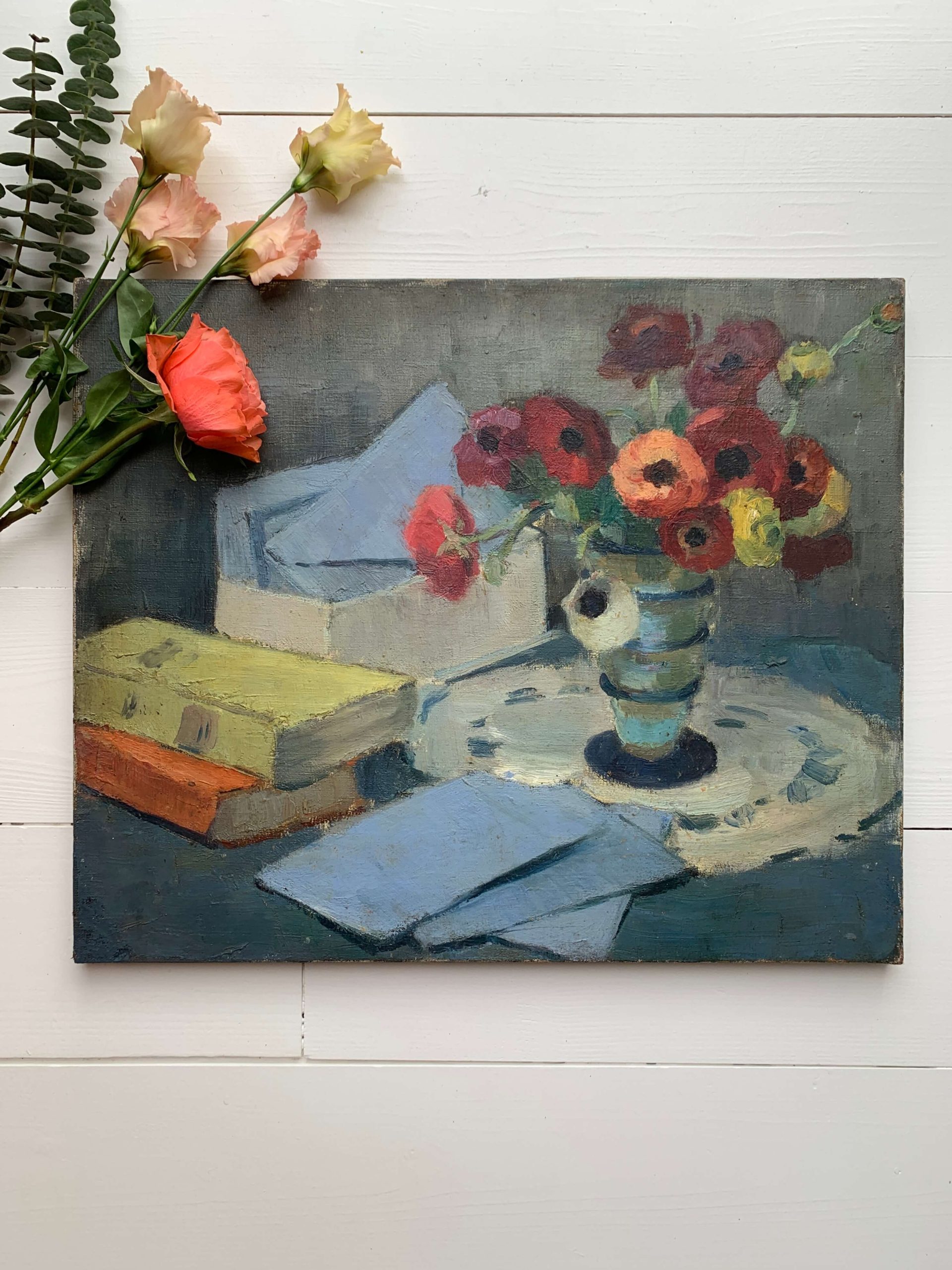 Il s’agit d’une huile sur toile représentant un bouquet d’anémones, des livres et des lettres…