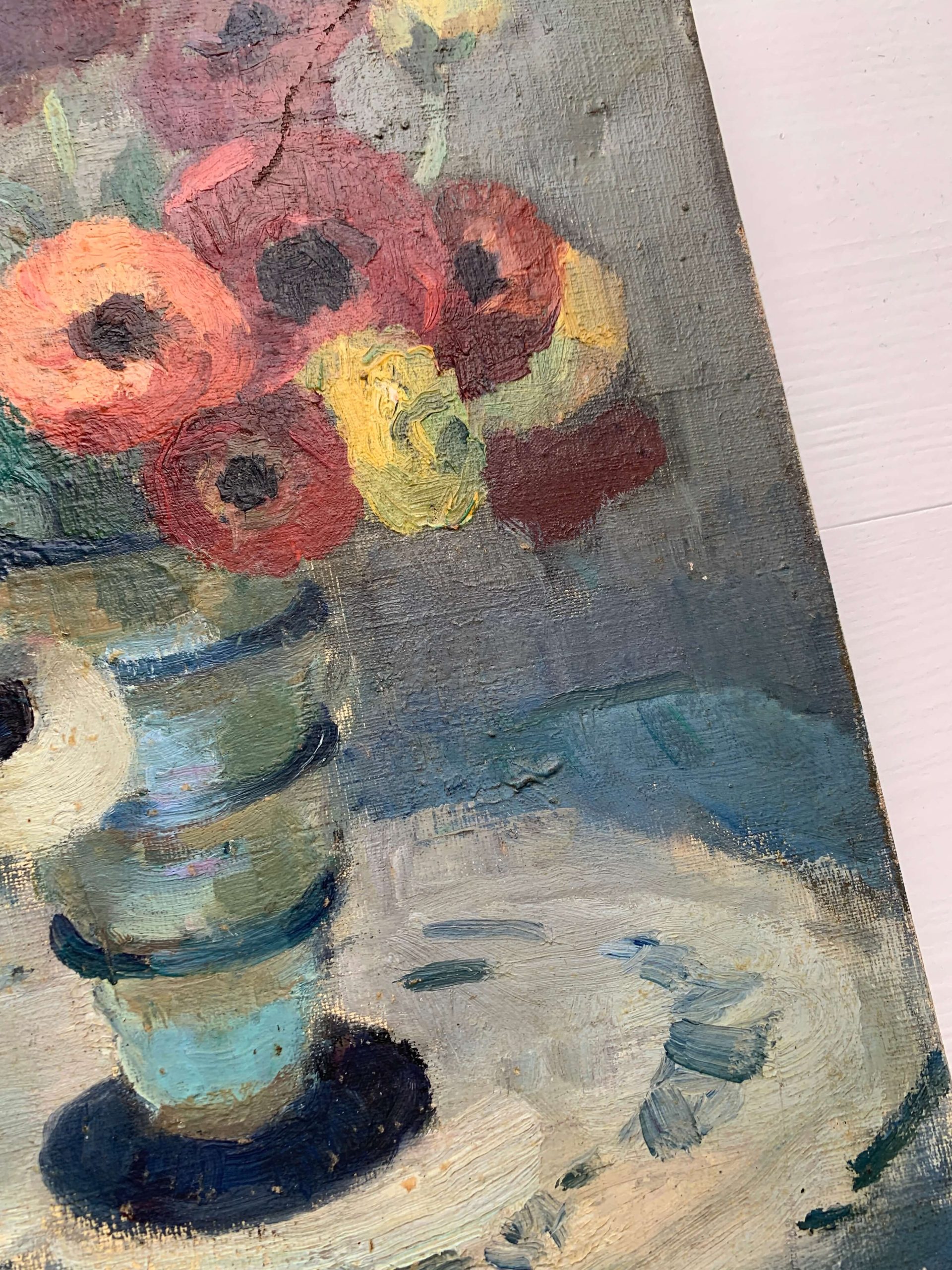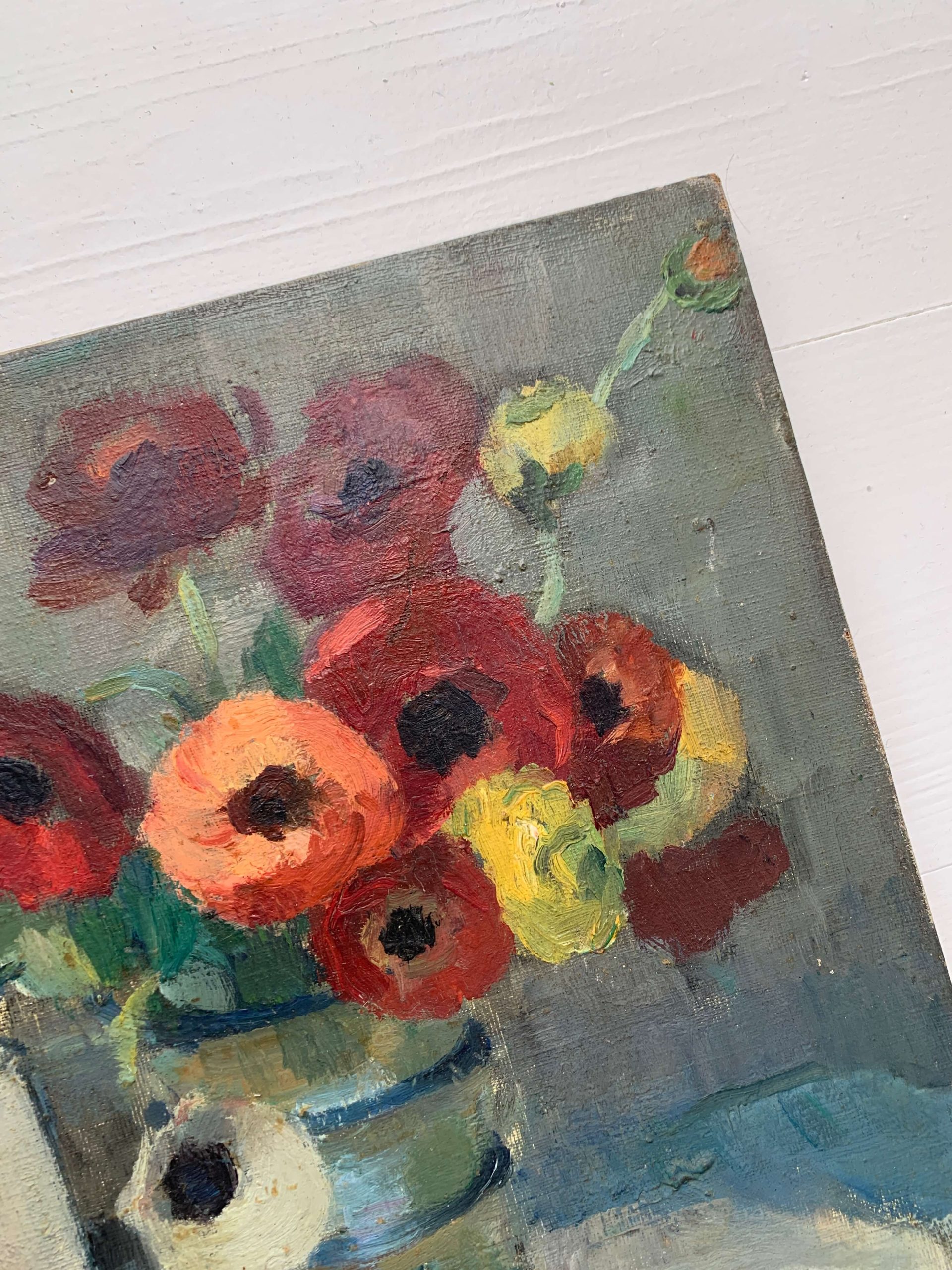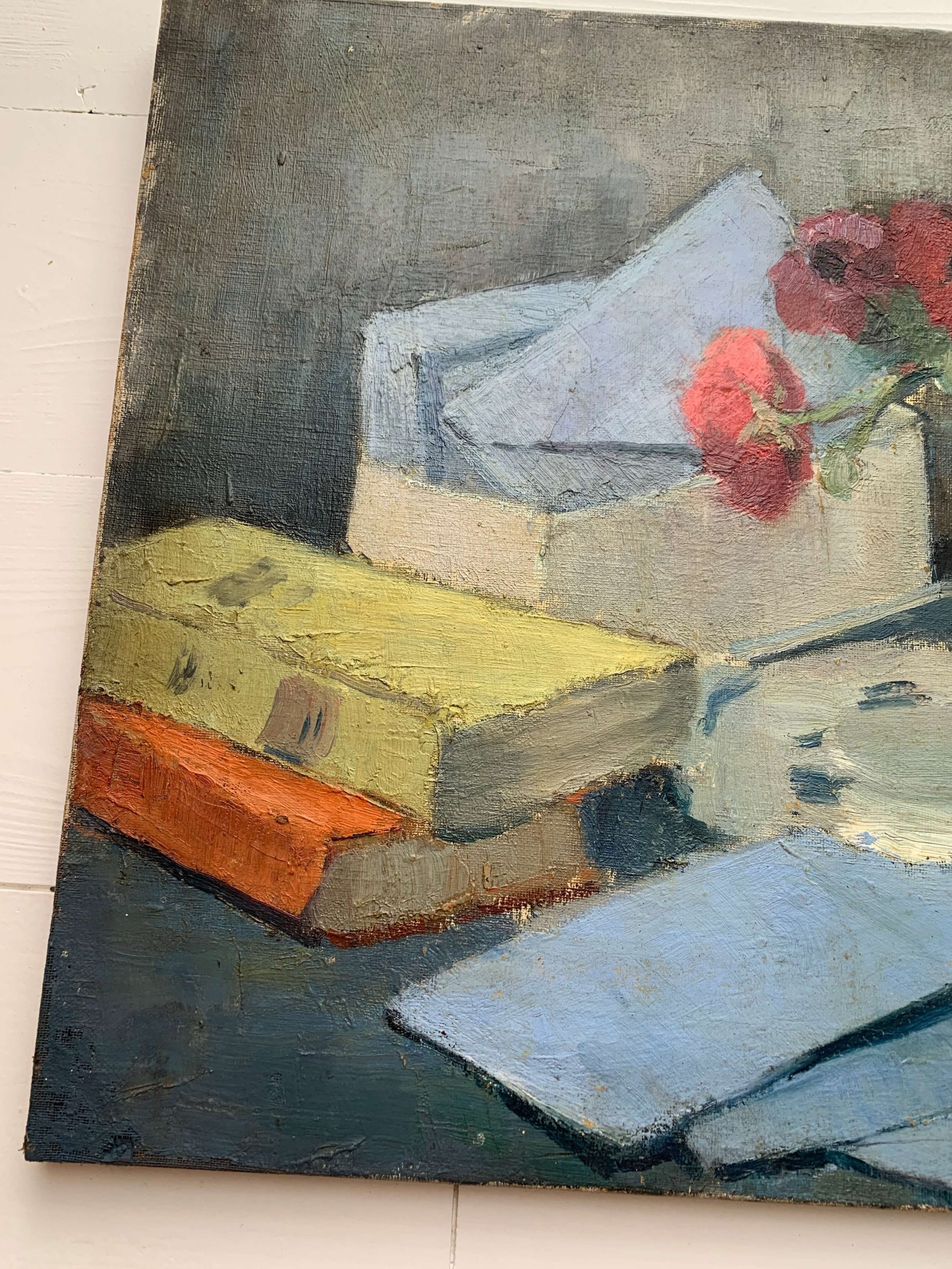 Il s’agit d’une huile sur toile représentant un bouquet d’anémones, des livres et des lettres…