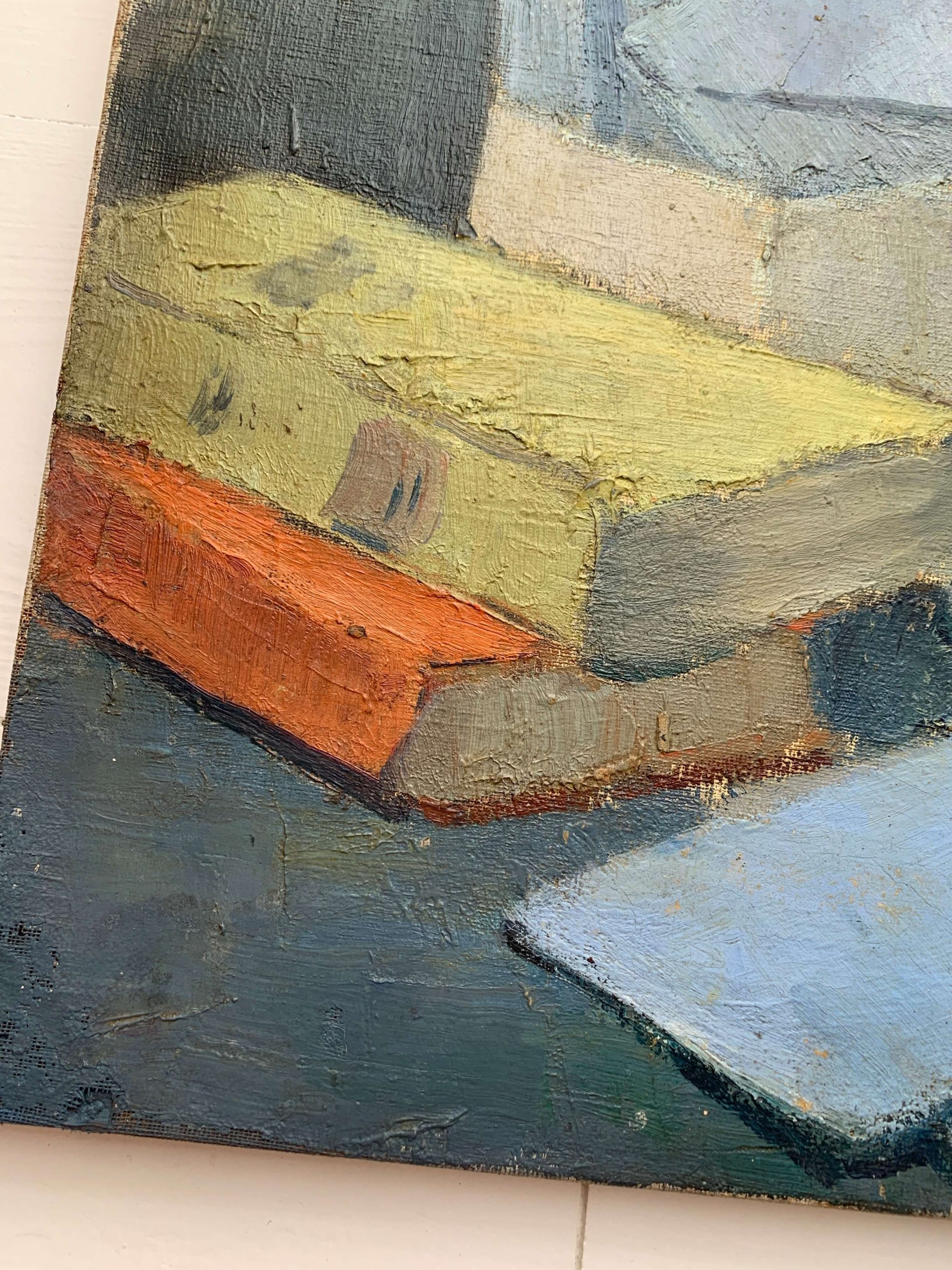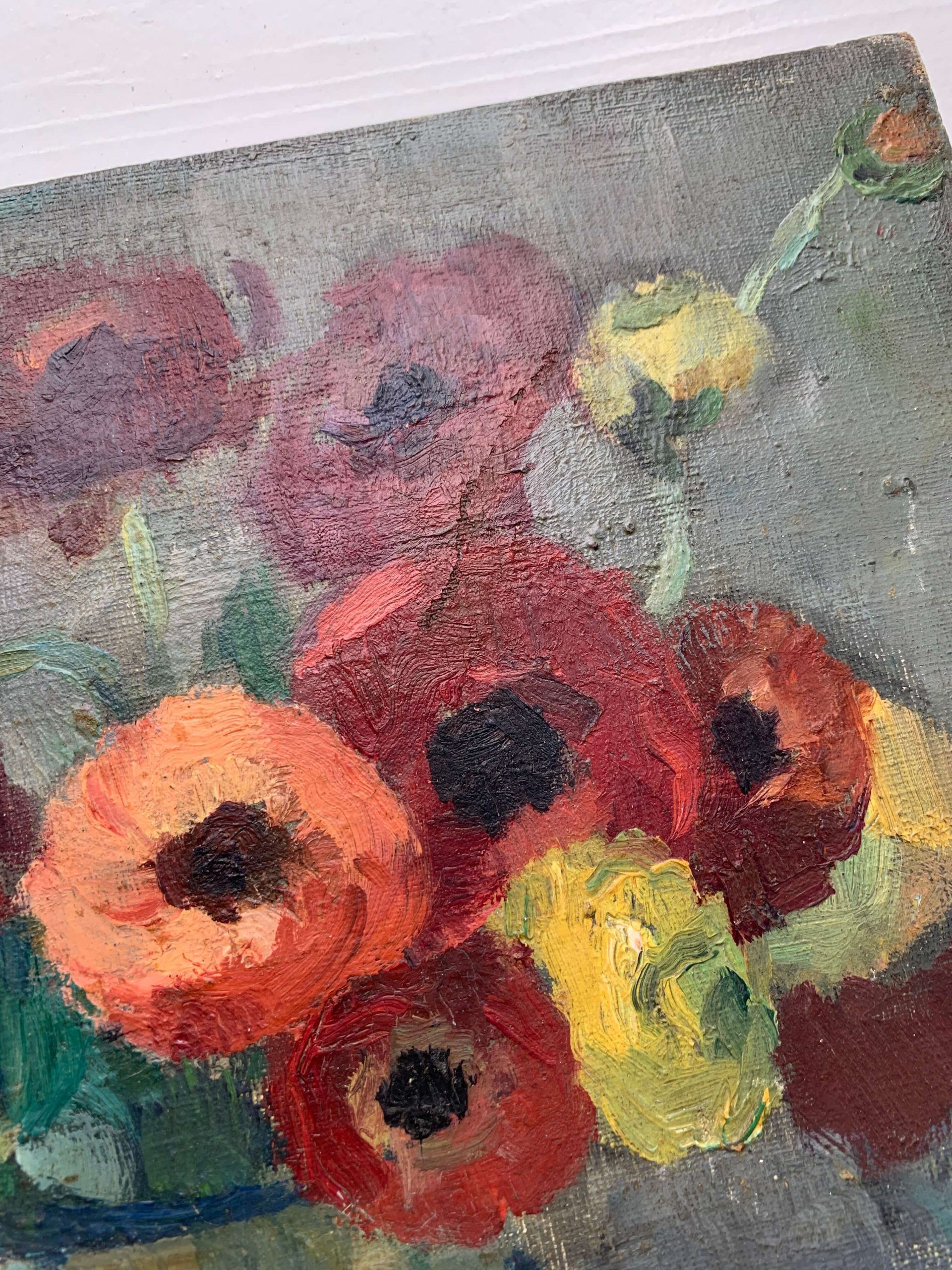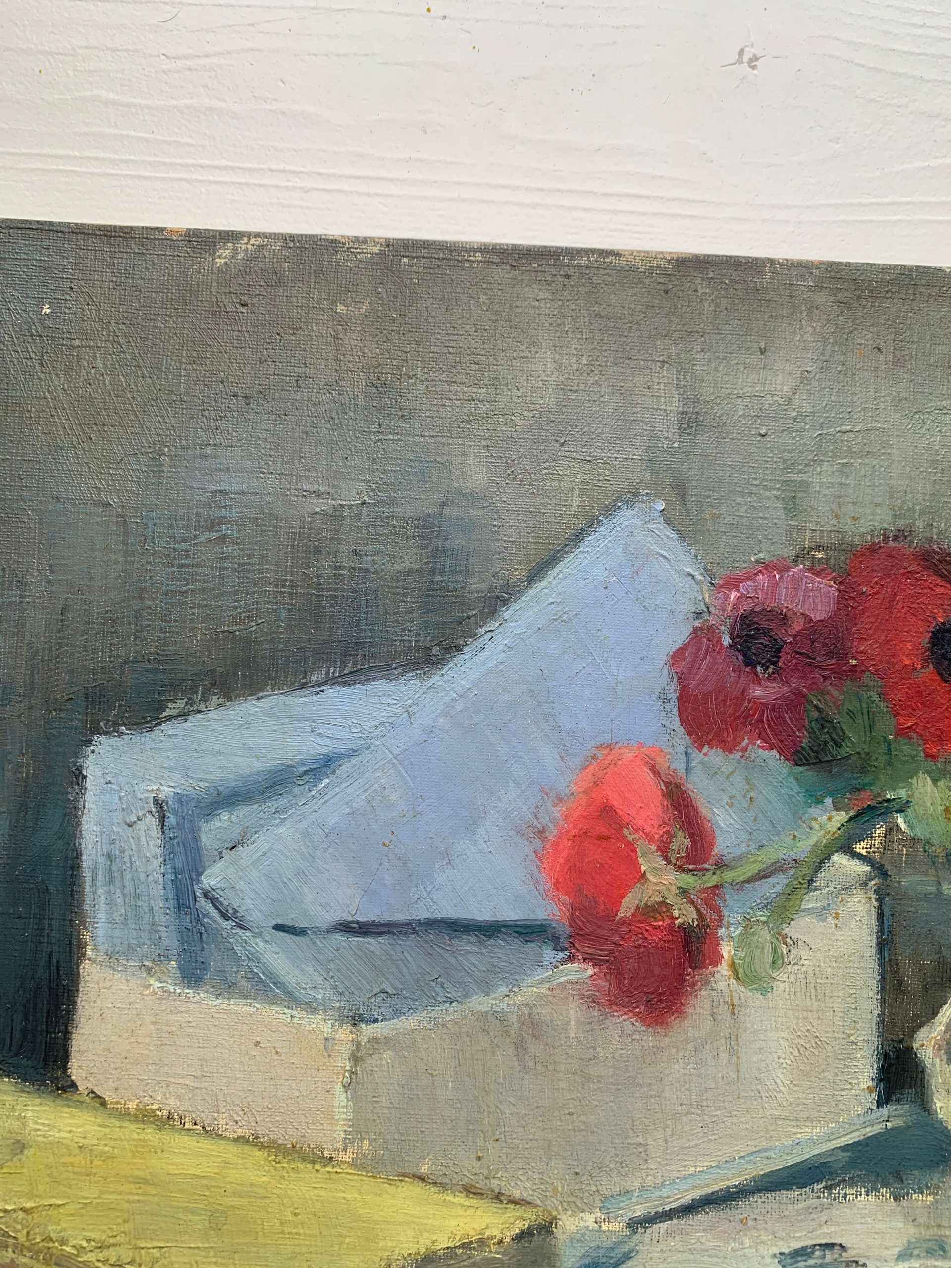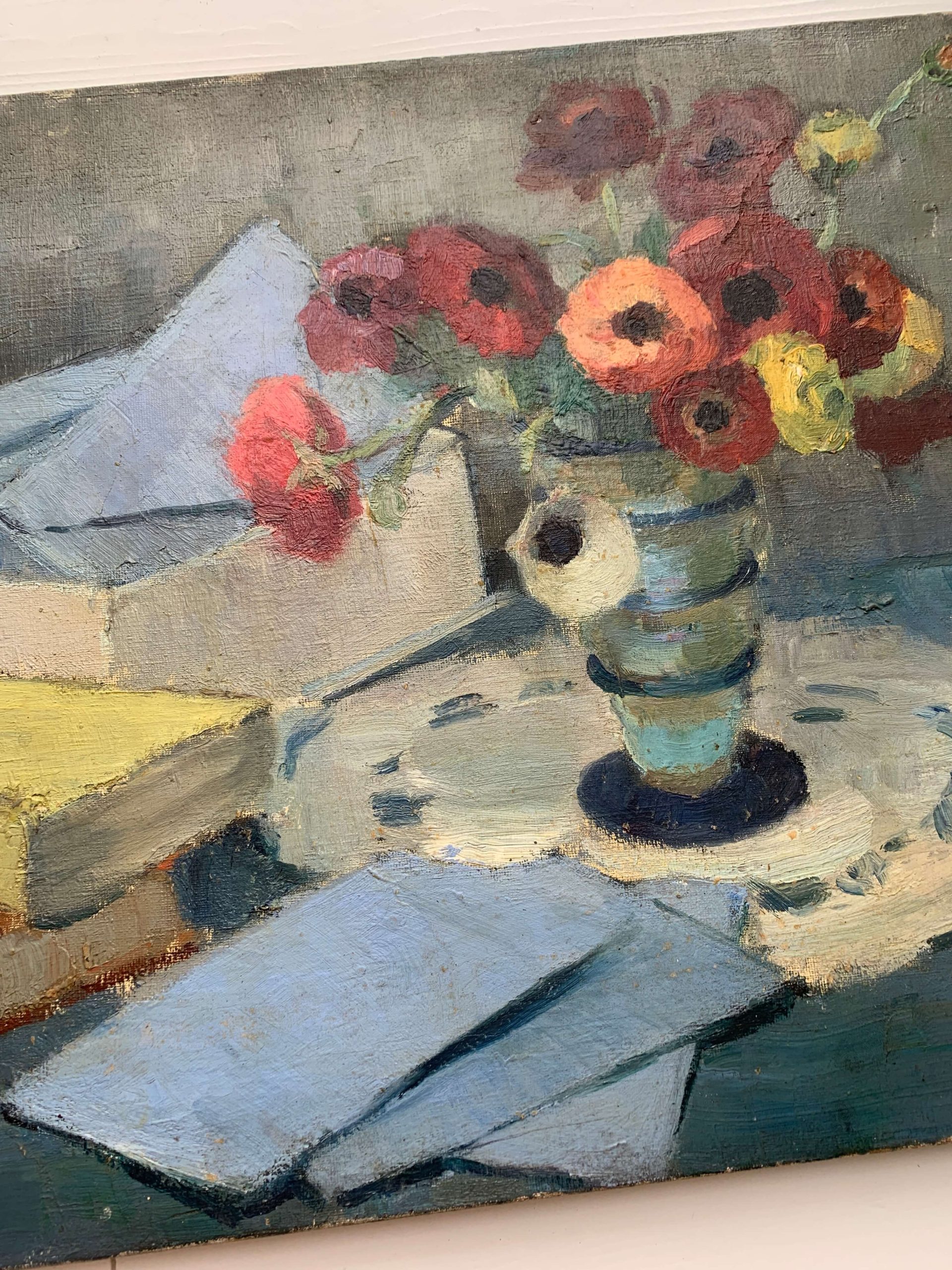 Il s’agit d’une huile sur toile représentant un bouquet d’anémones, des livres et des lettres…
