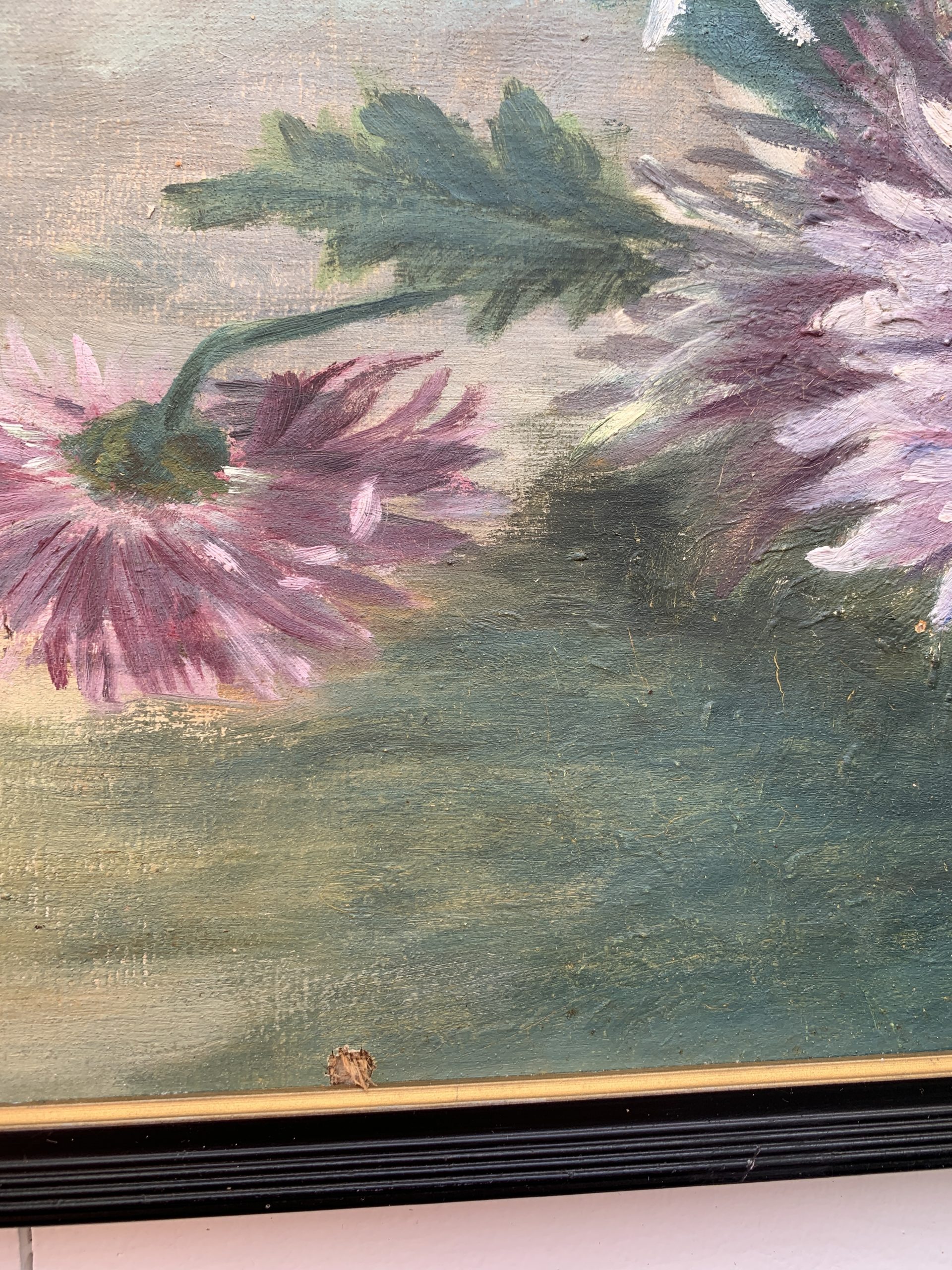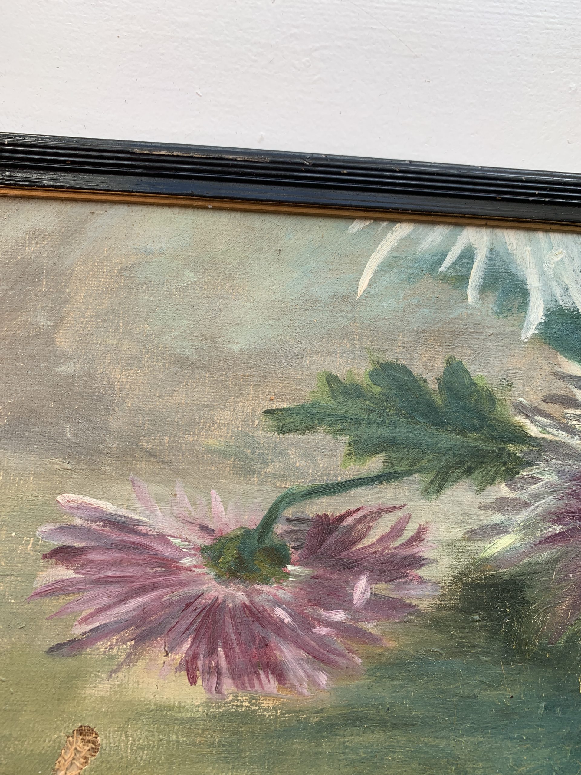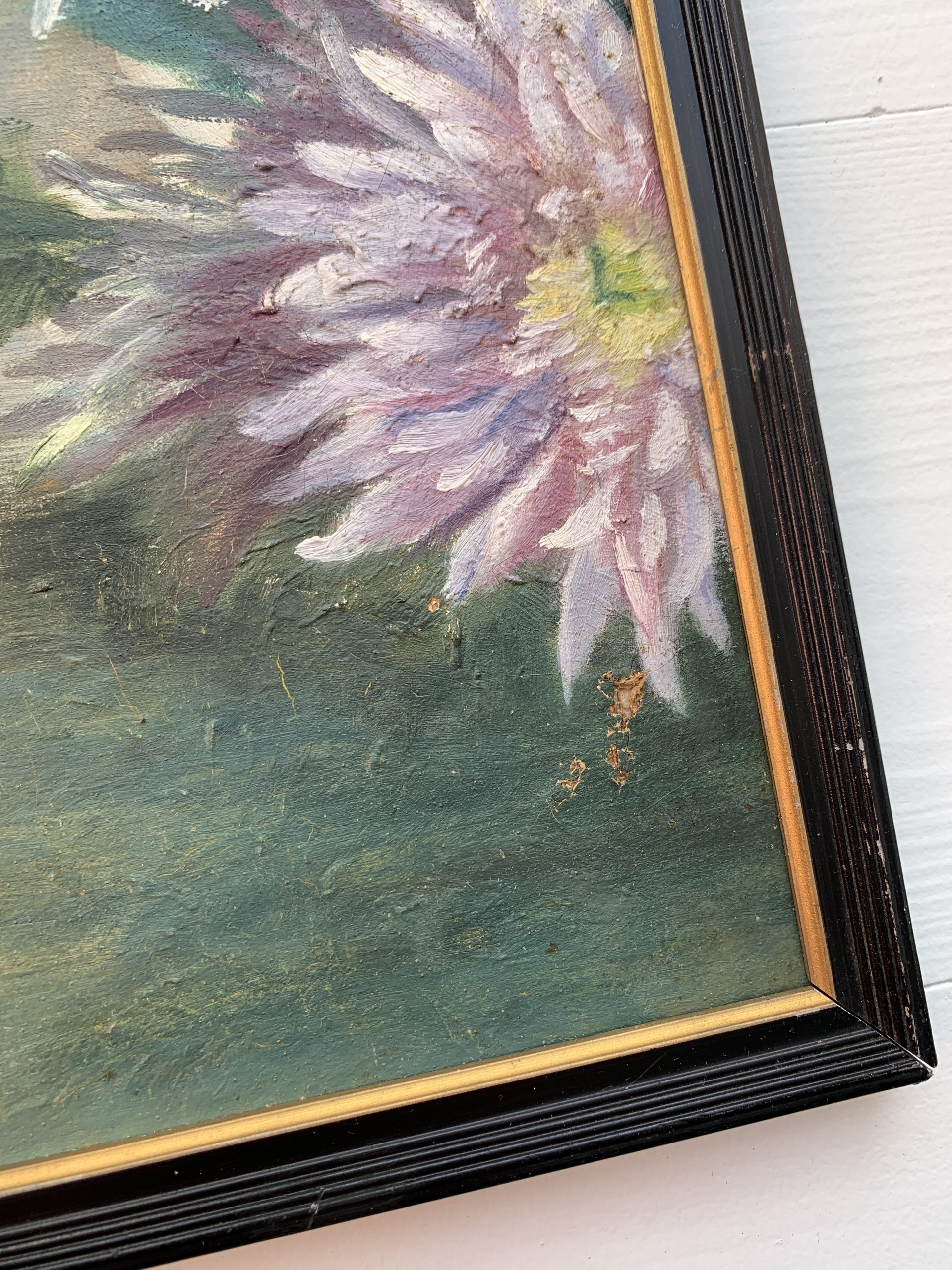 Rupture de stockAncienne huile sur toile marouflée sur carton représentant des dahlias vers 1900.