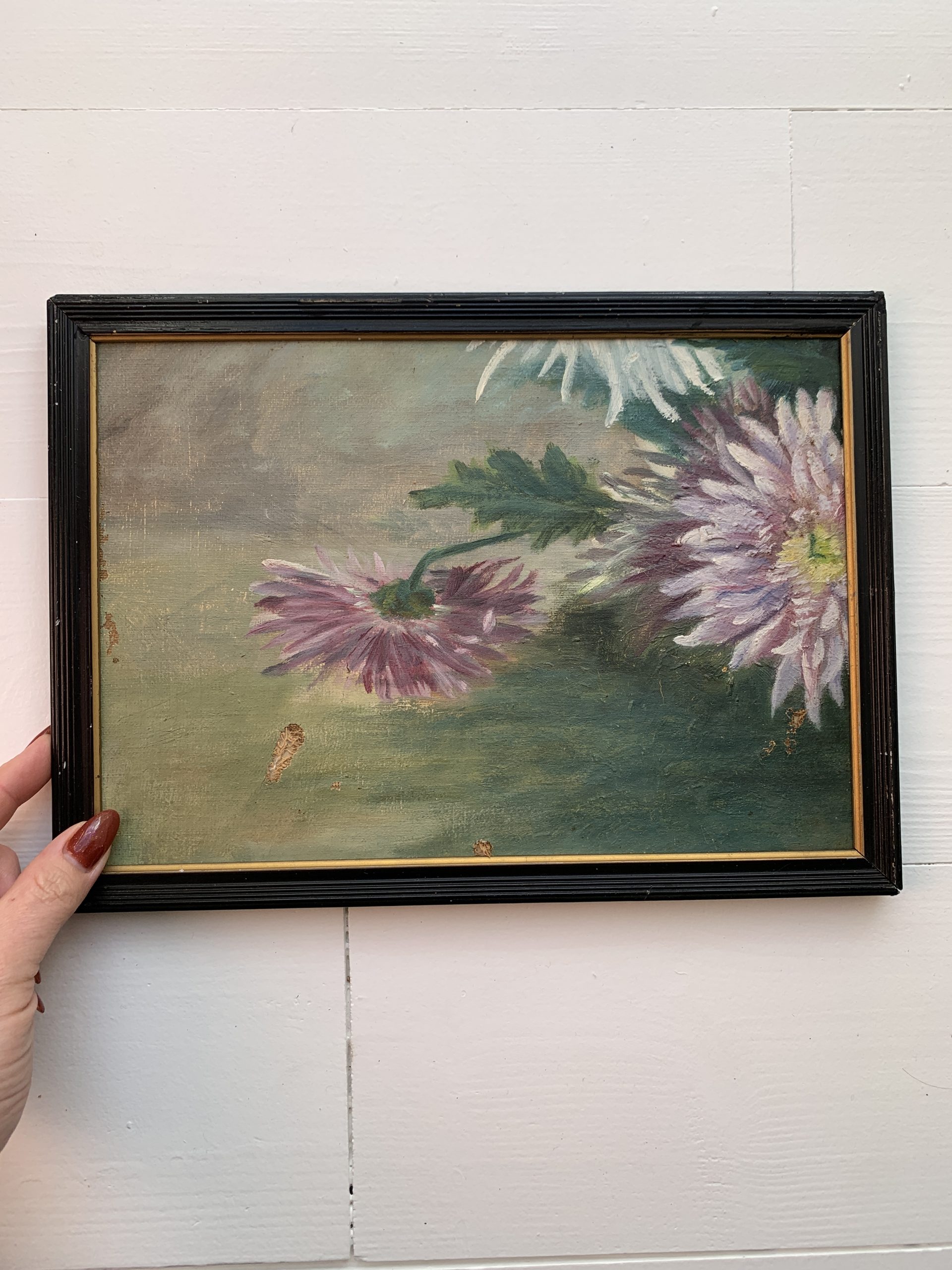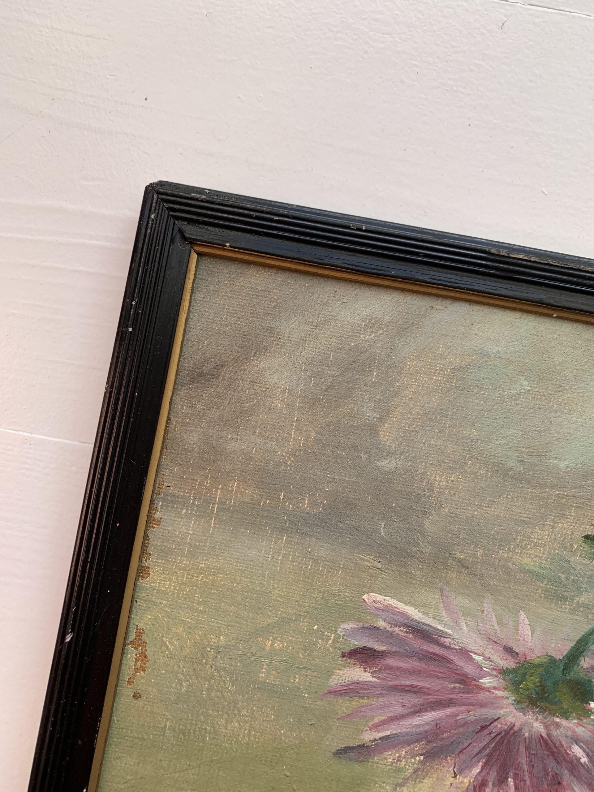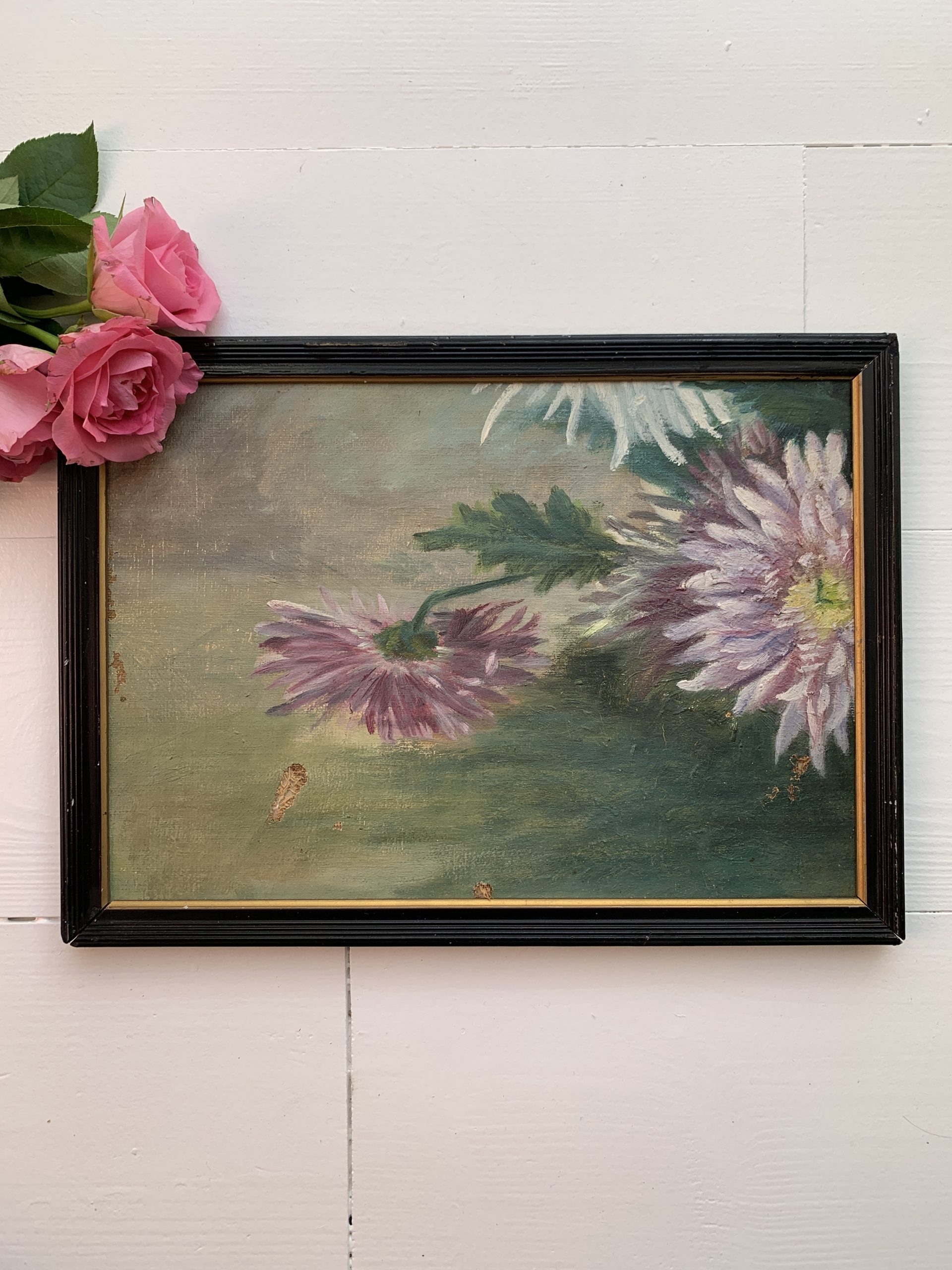 Rupture de stockAncienne huile sur toile marouflée sur carton représentant des dahlias vers 1900.