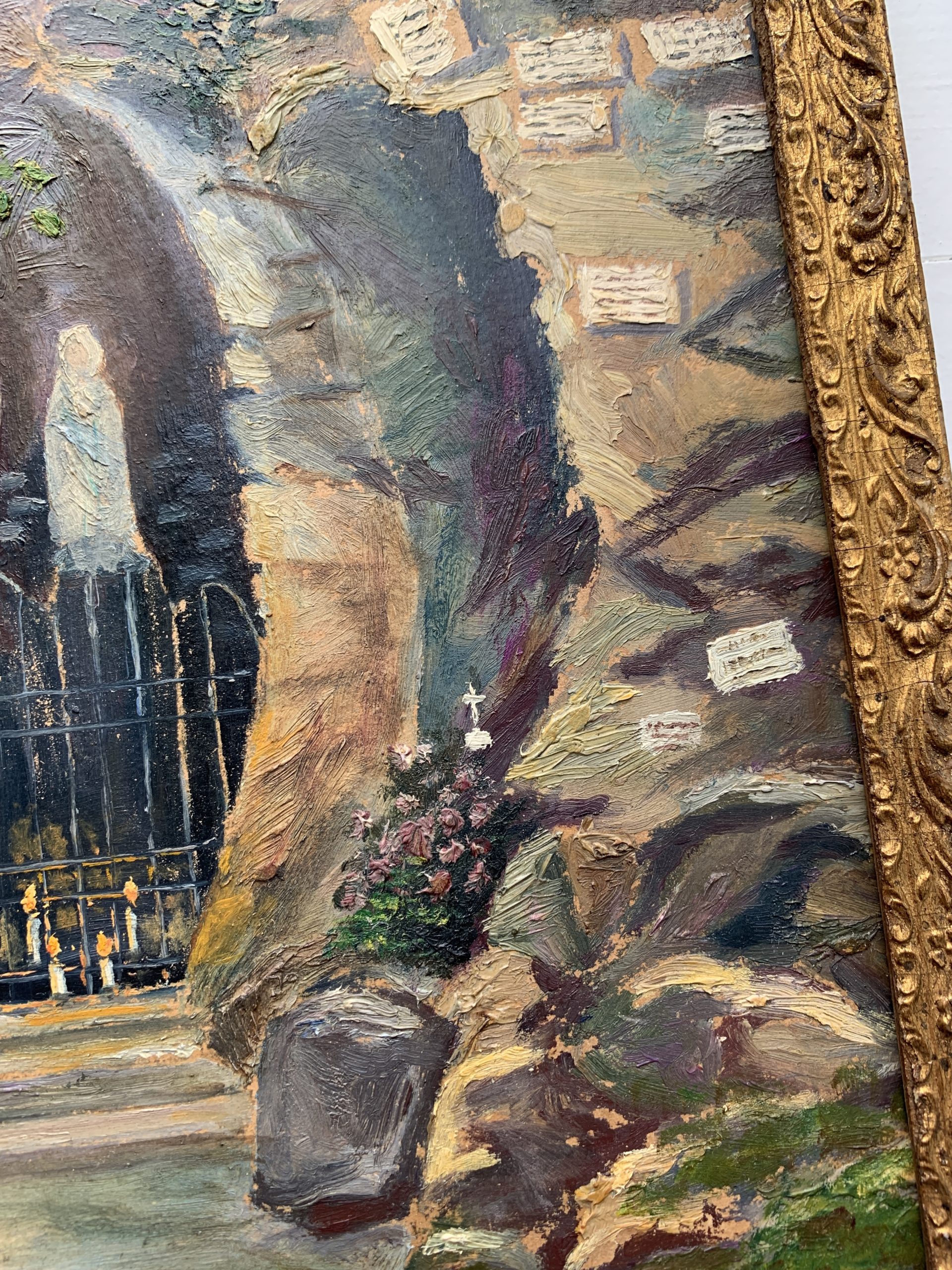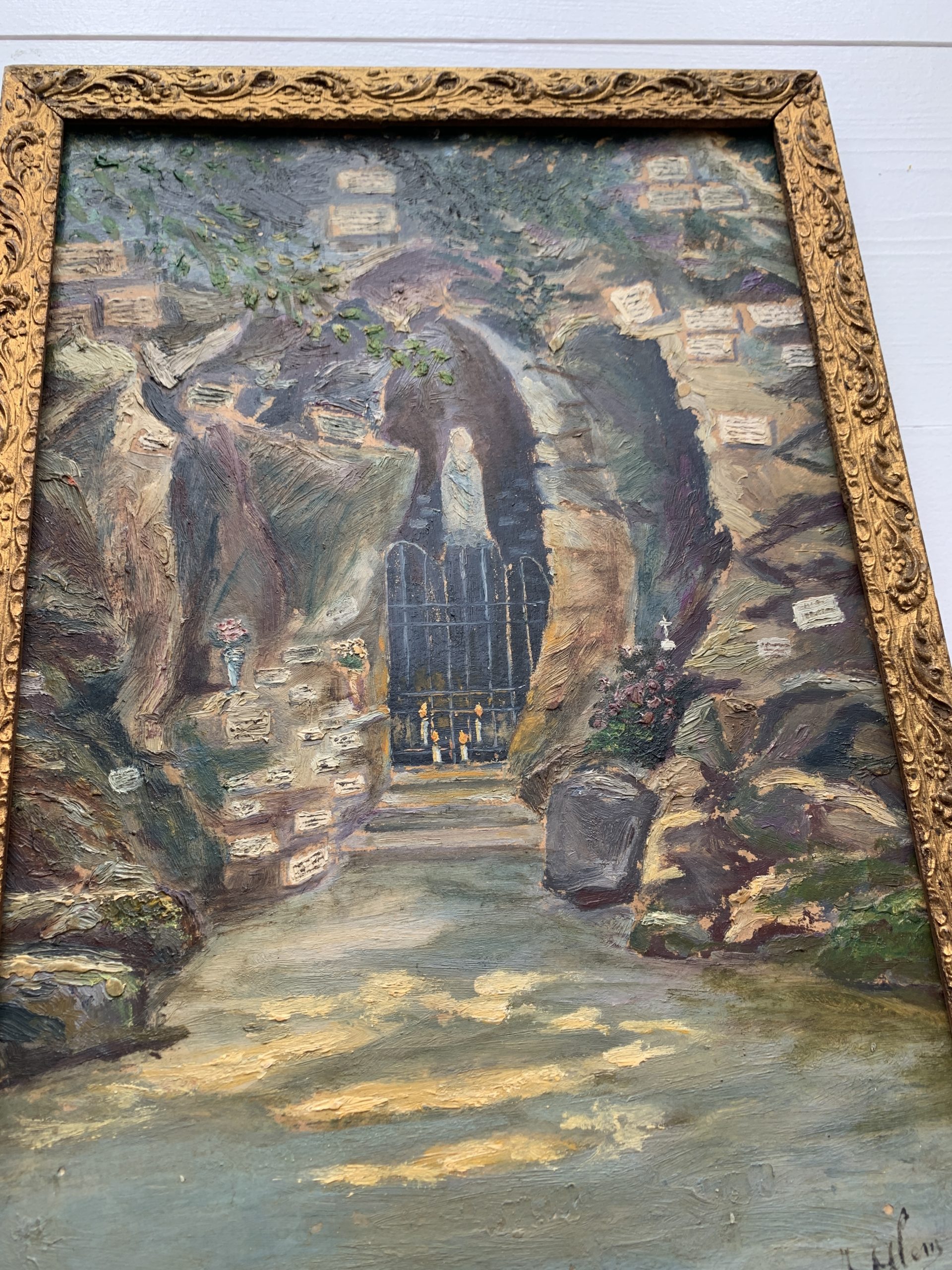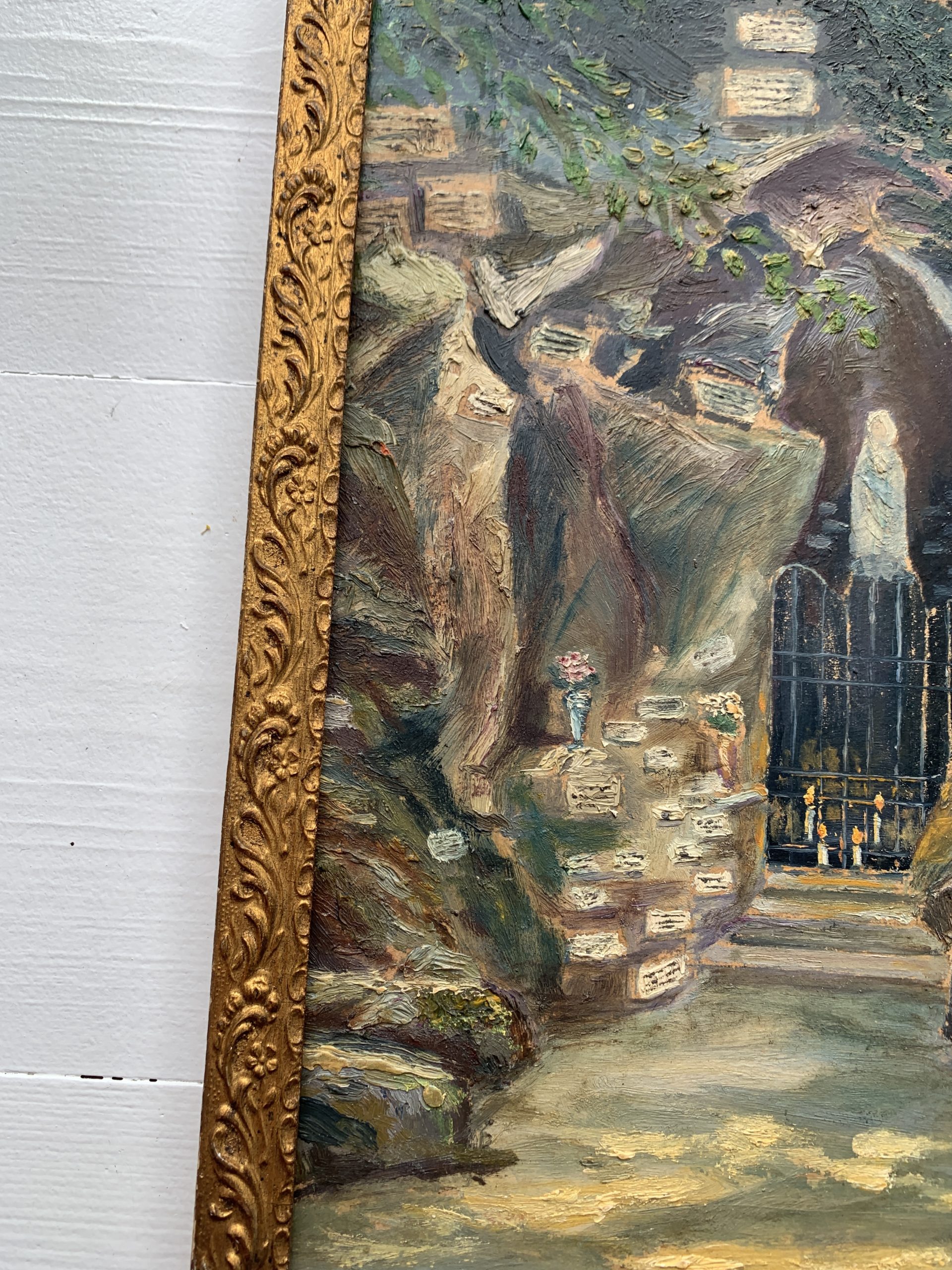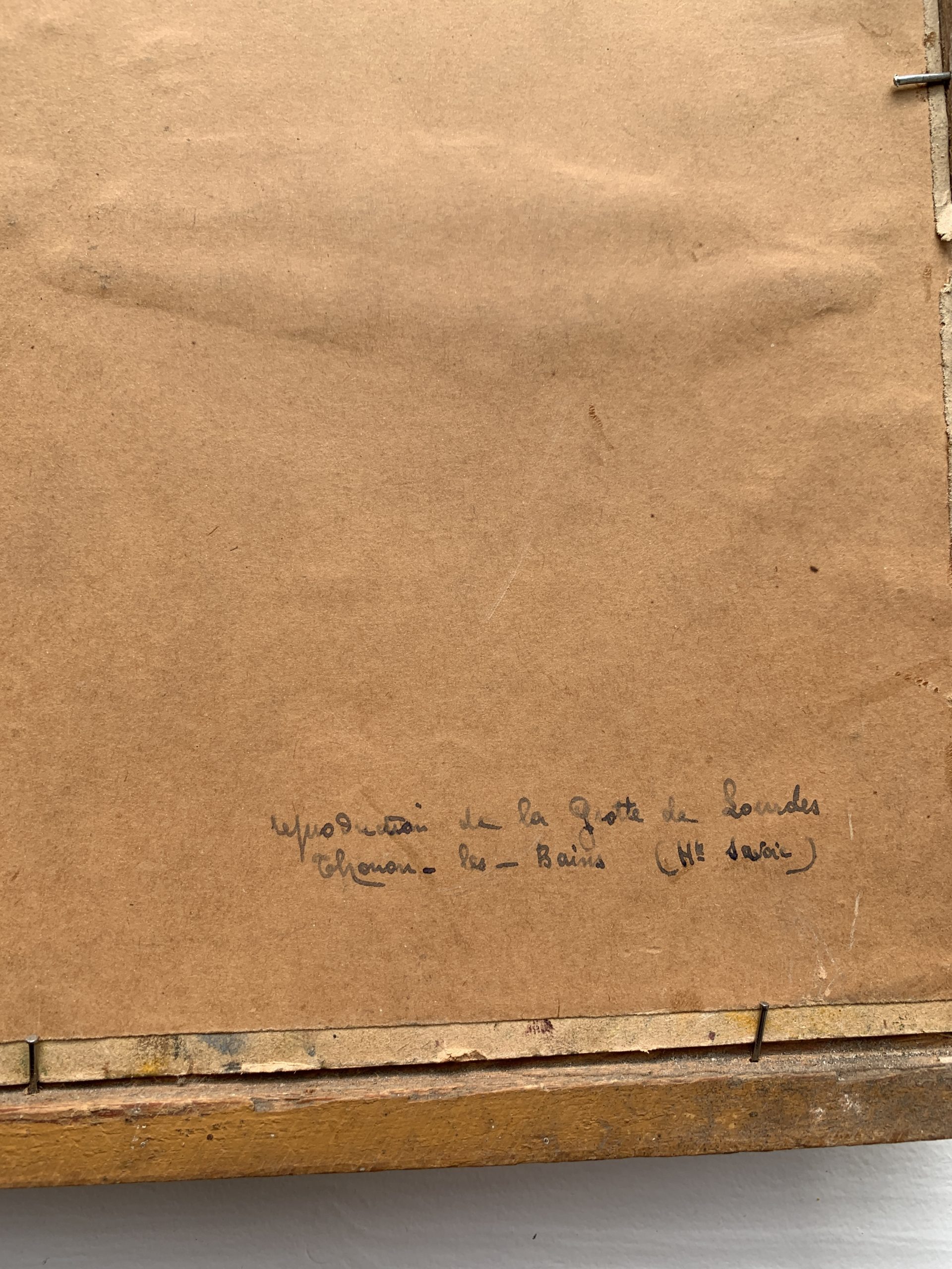 Rupture de stockHuile sur carton ancienne représentant une reproduction de la grotte de Lourdes à Thonon les bains.