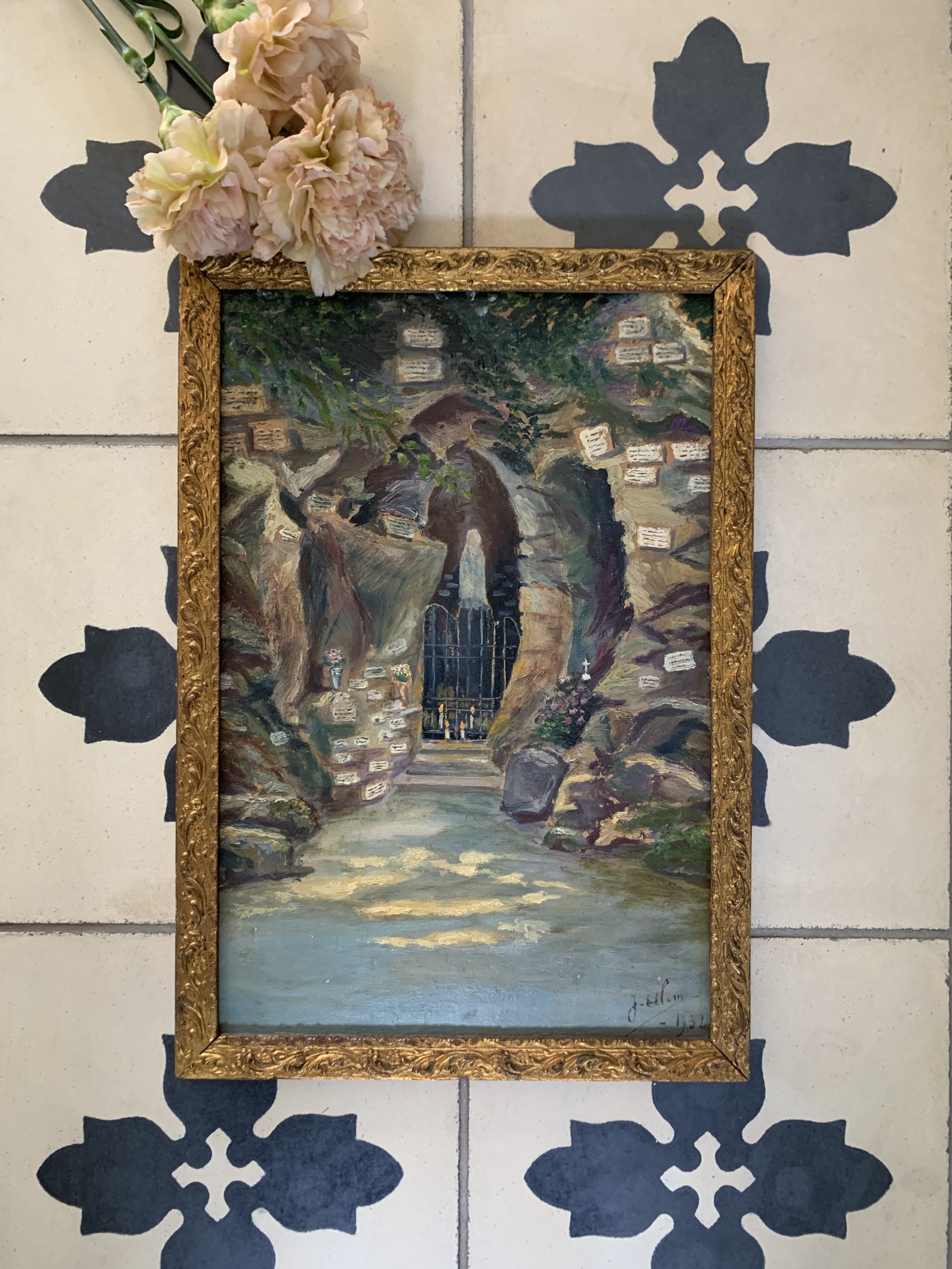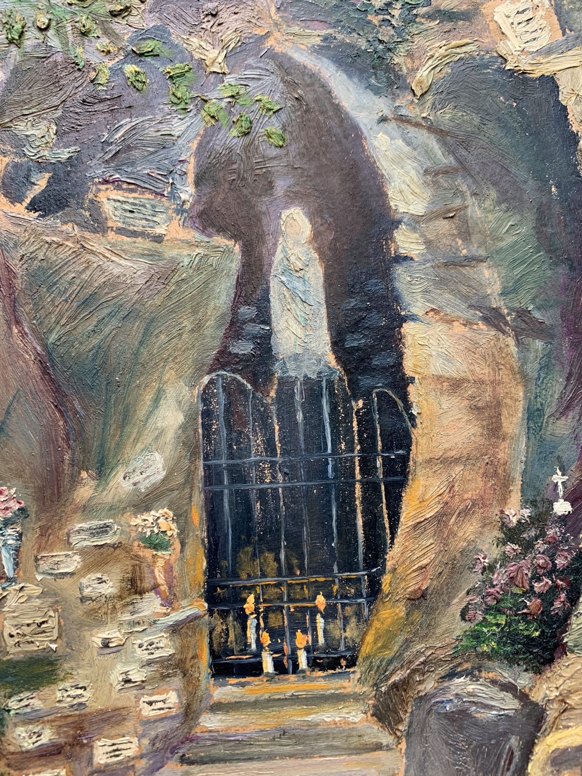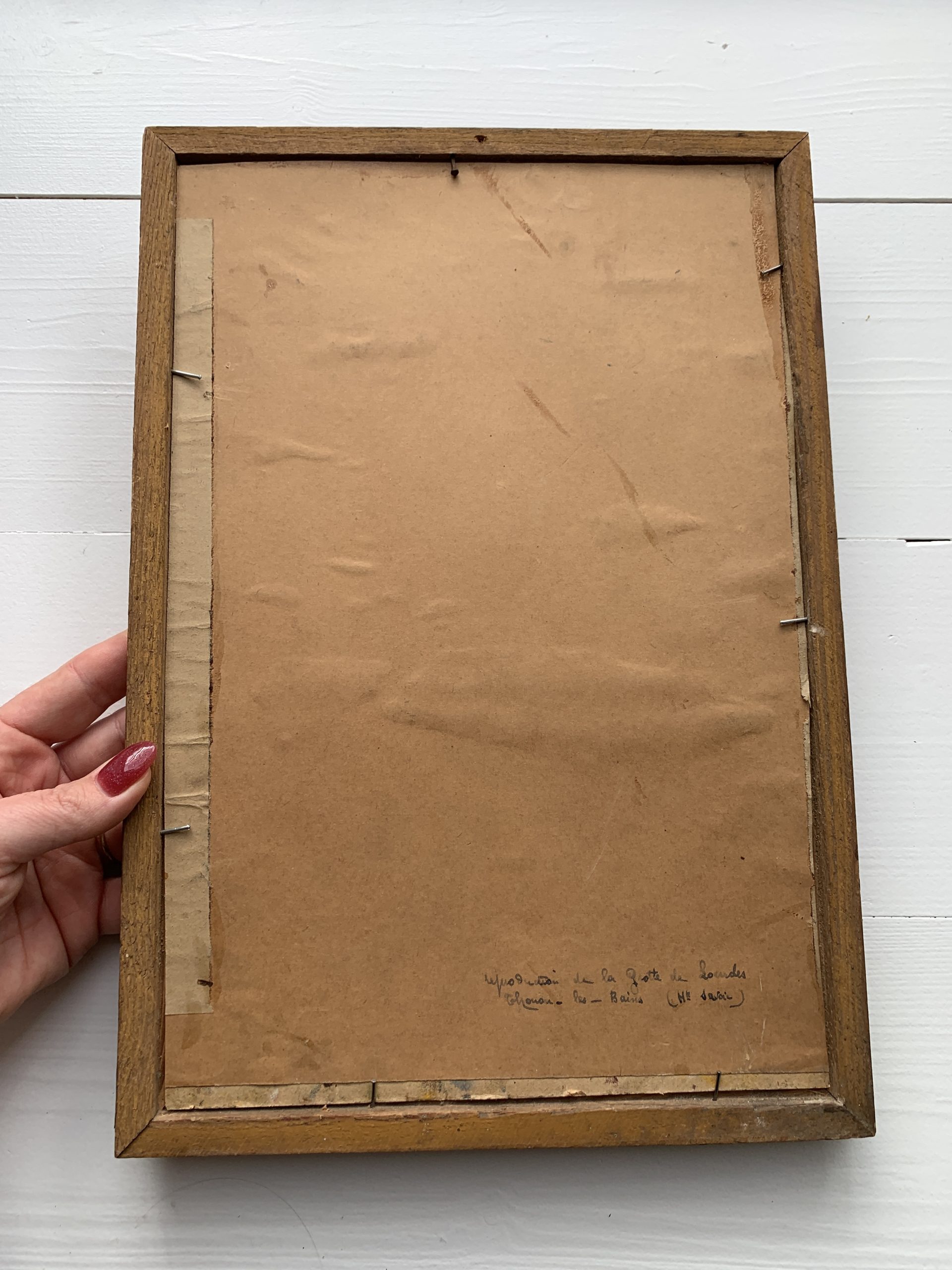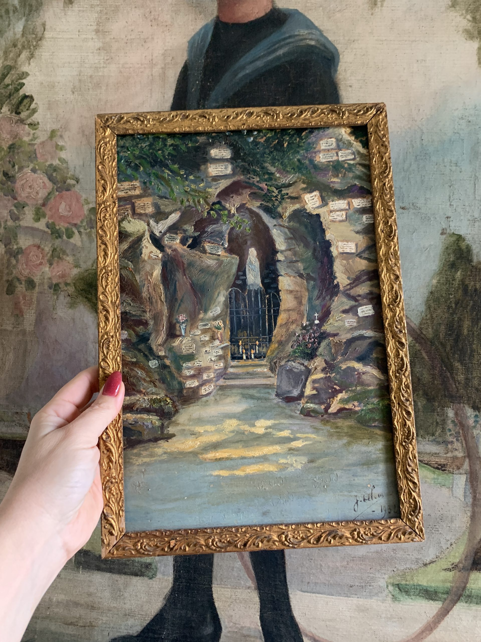 Rupture de stockHuile sur carton ancienne représentant une reproduction de la grotte de Lourdes à Thonon les bains.