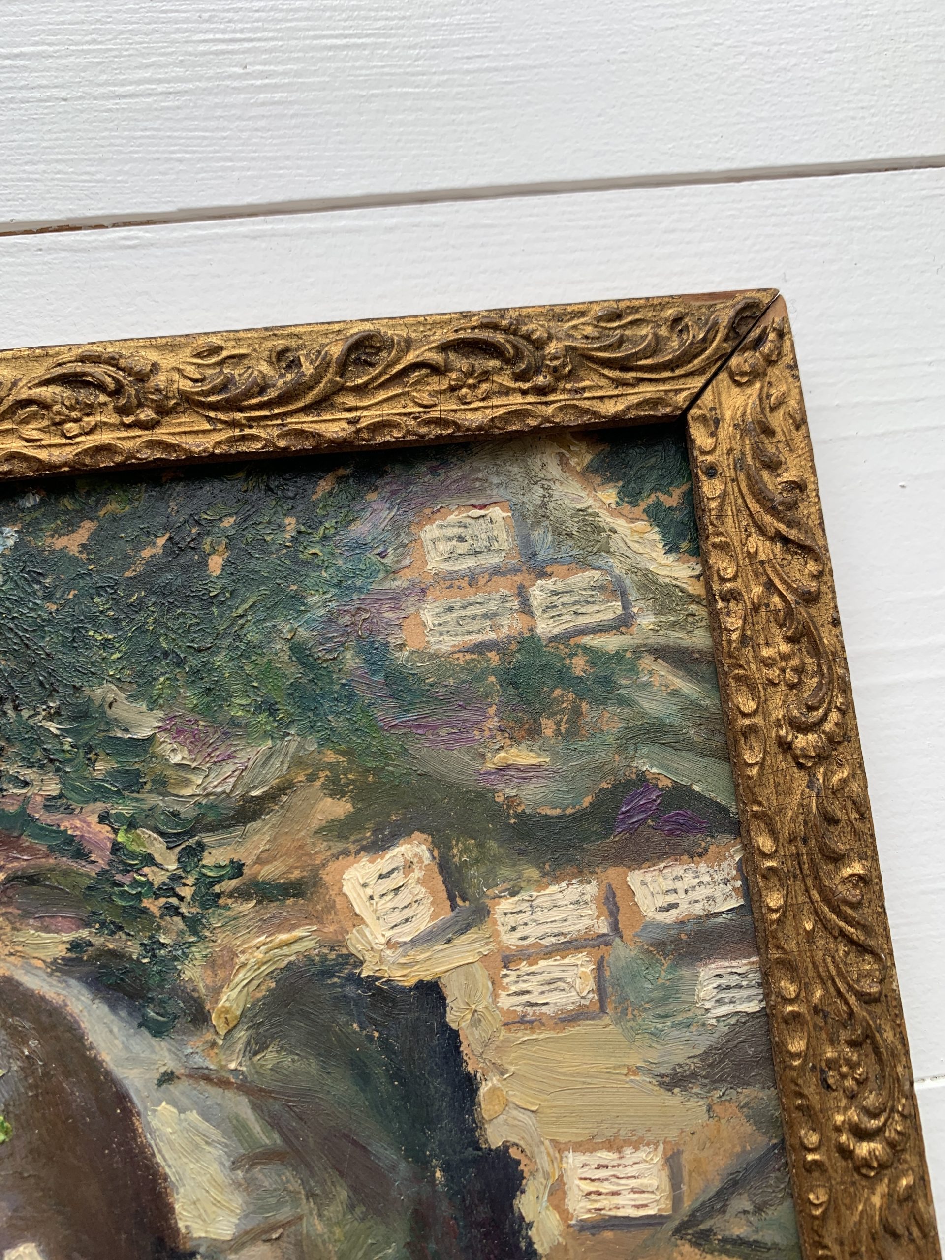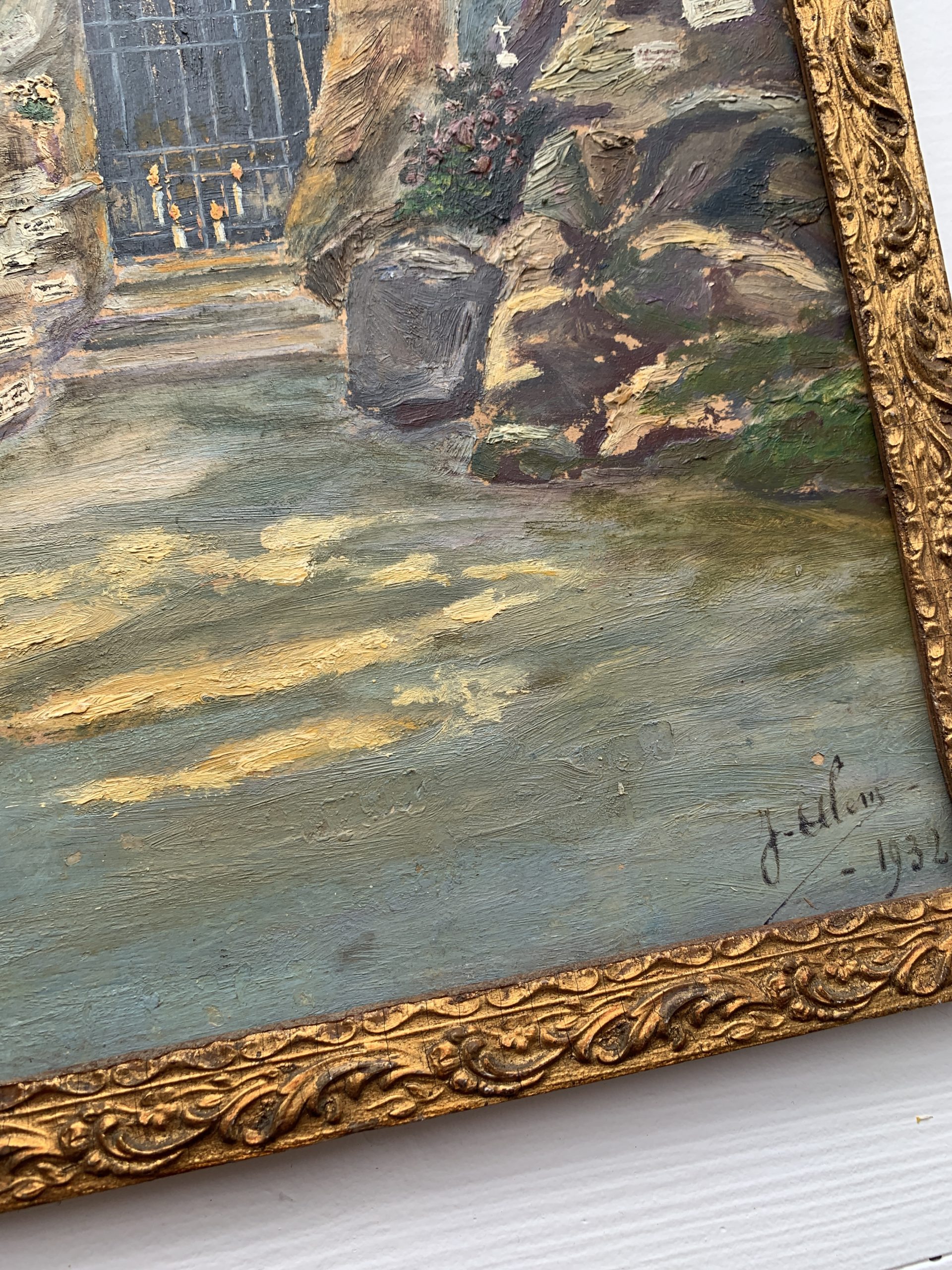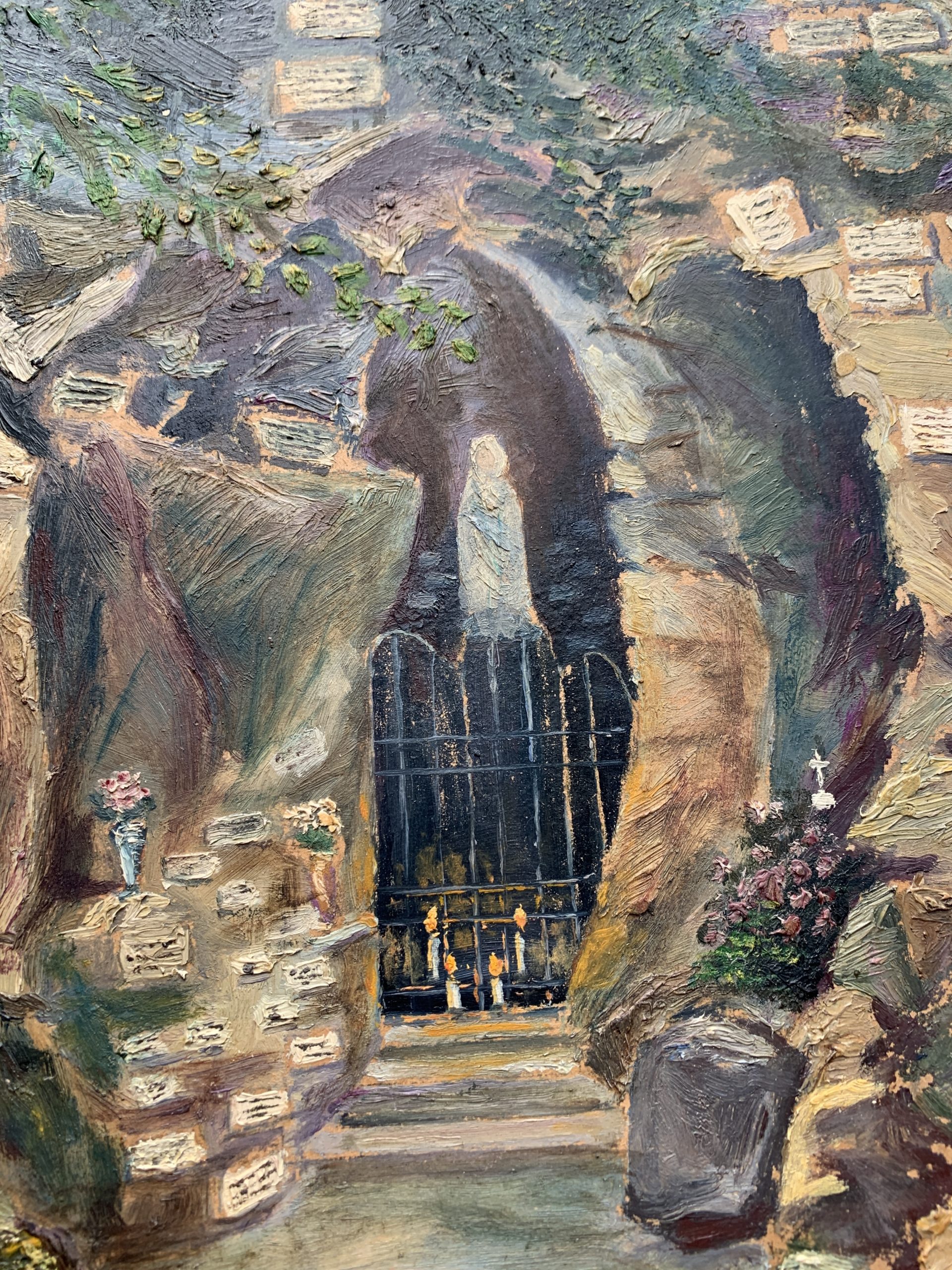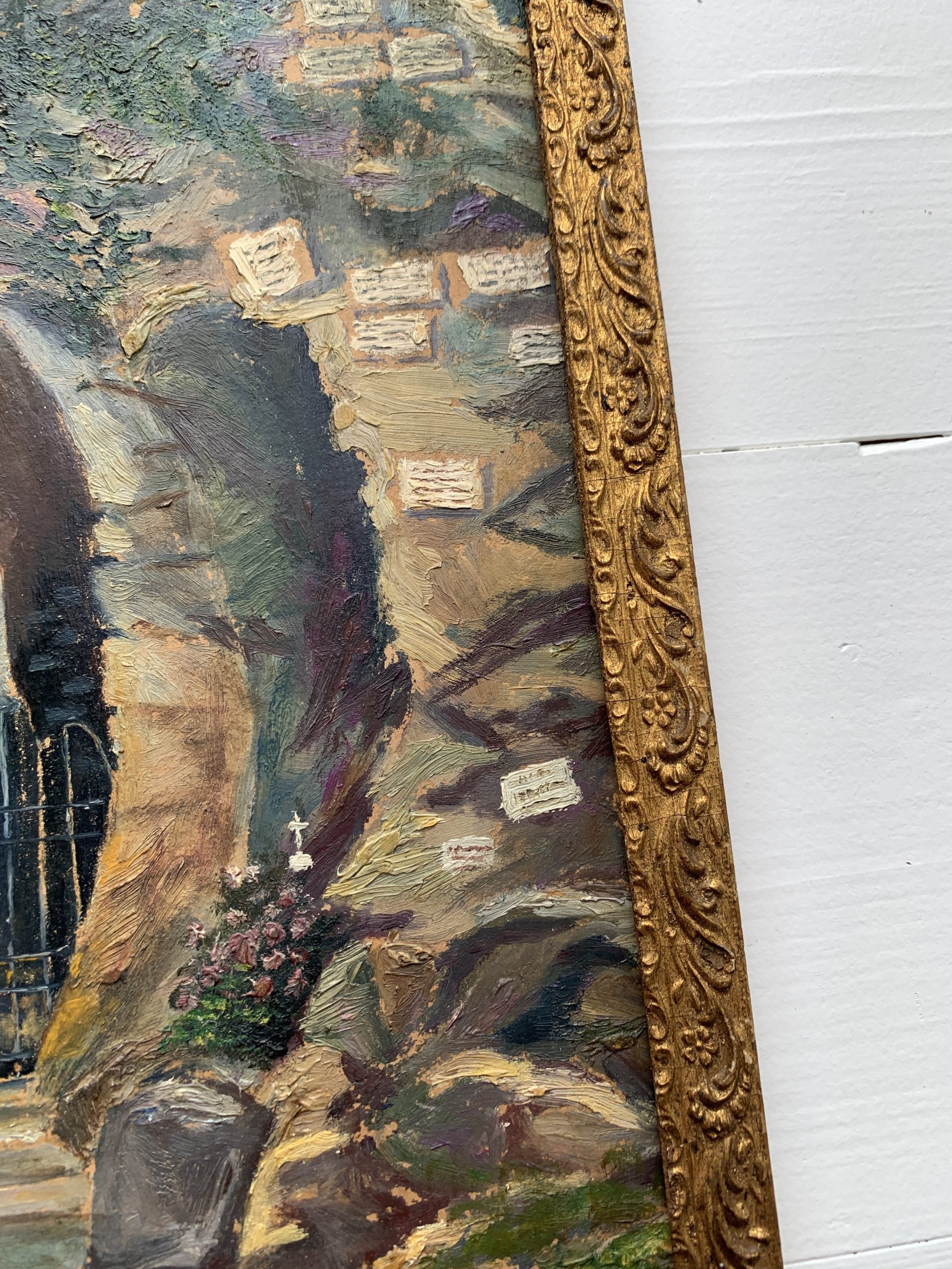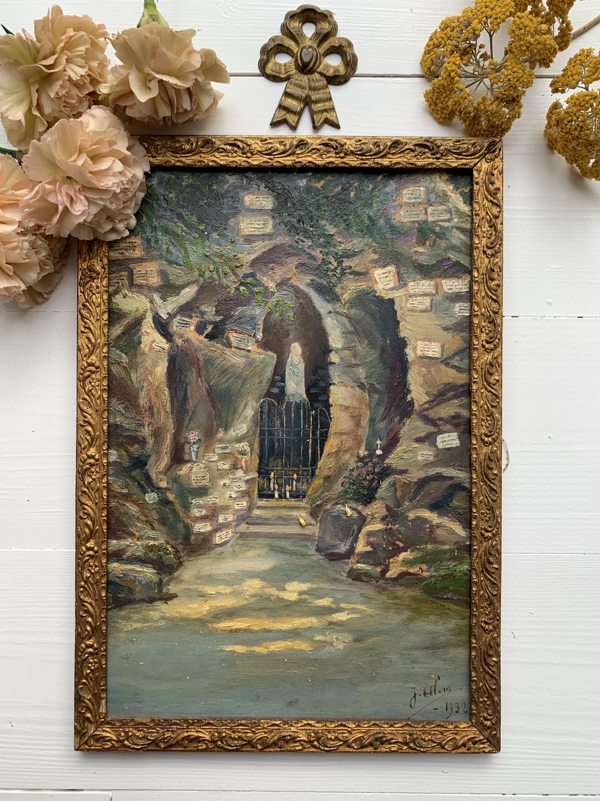 Rupture de stockHuile sur carton ancienne représentant une reproduction de la grotte de Lourdes à Thonon les bains.