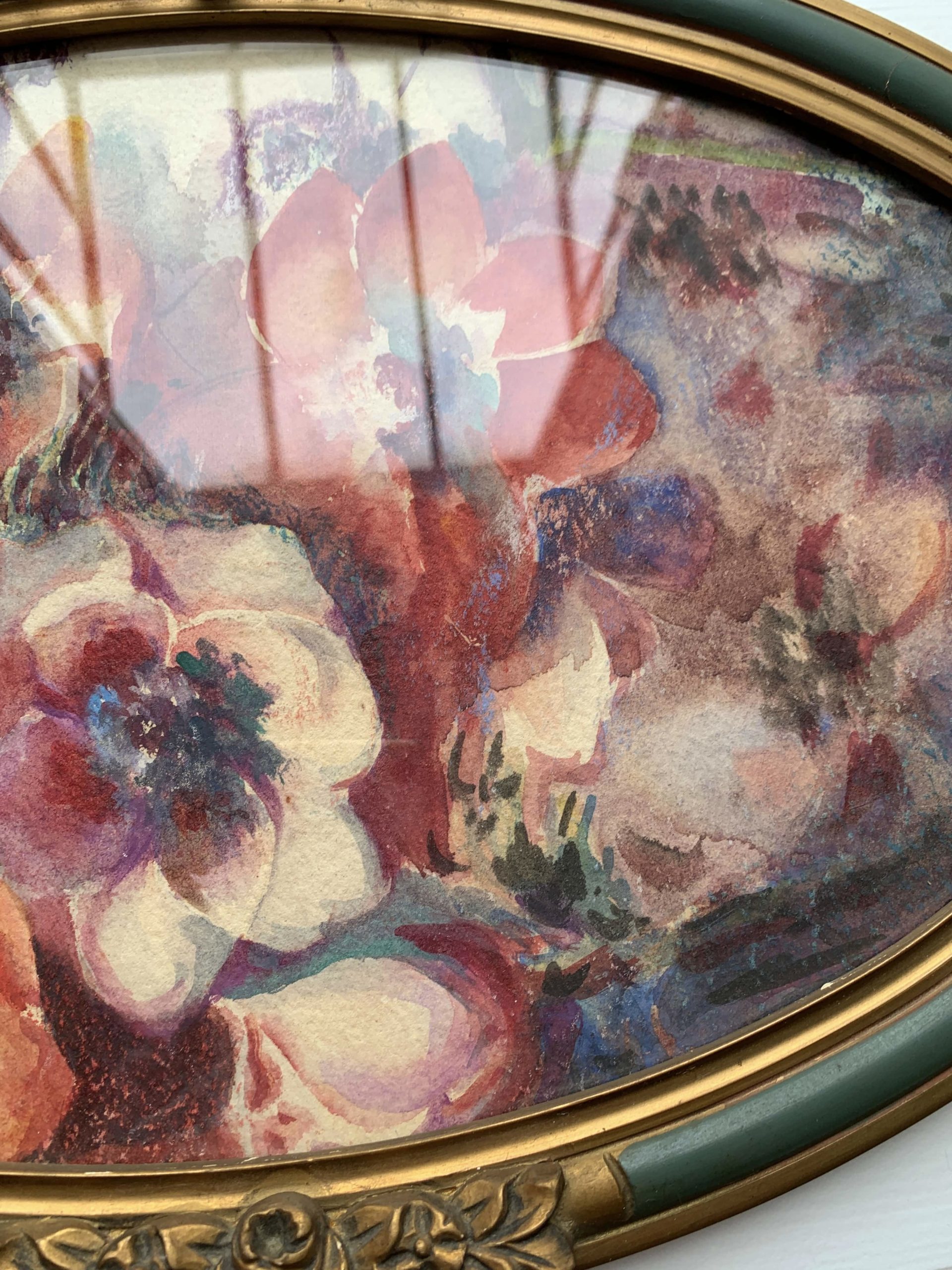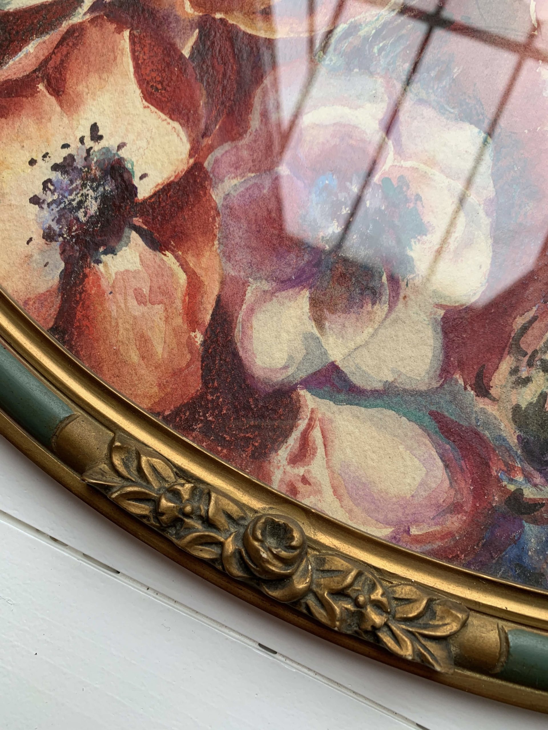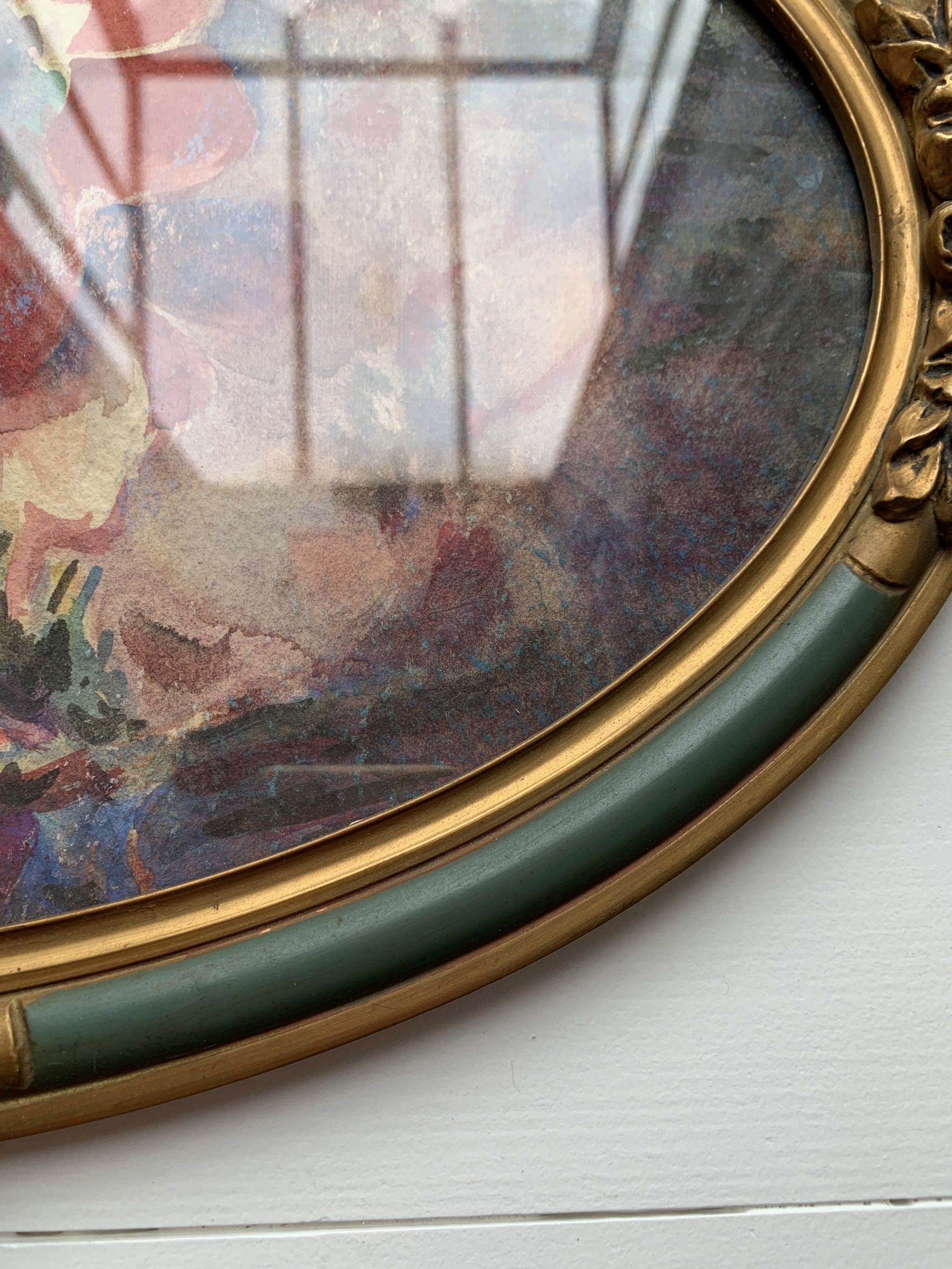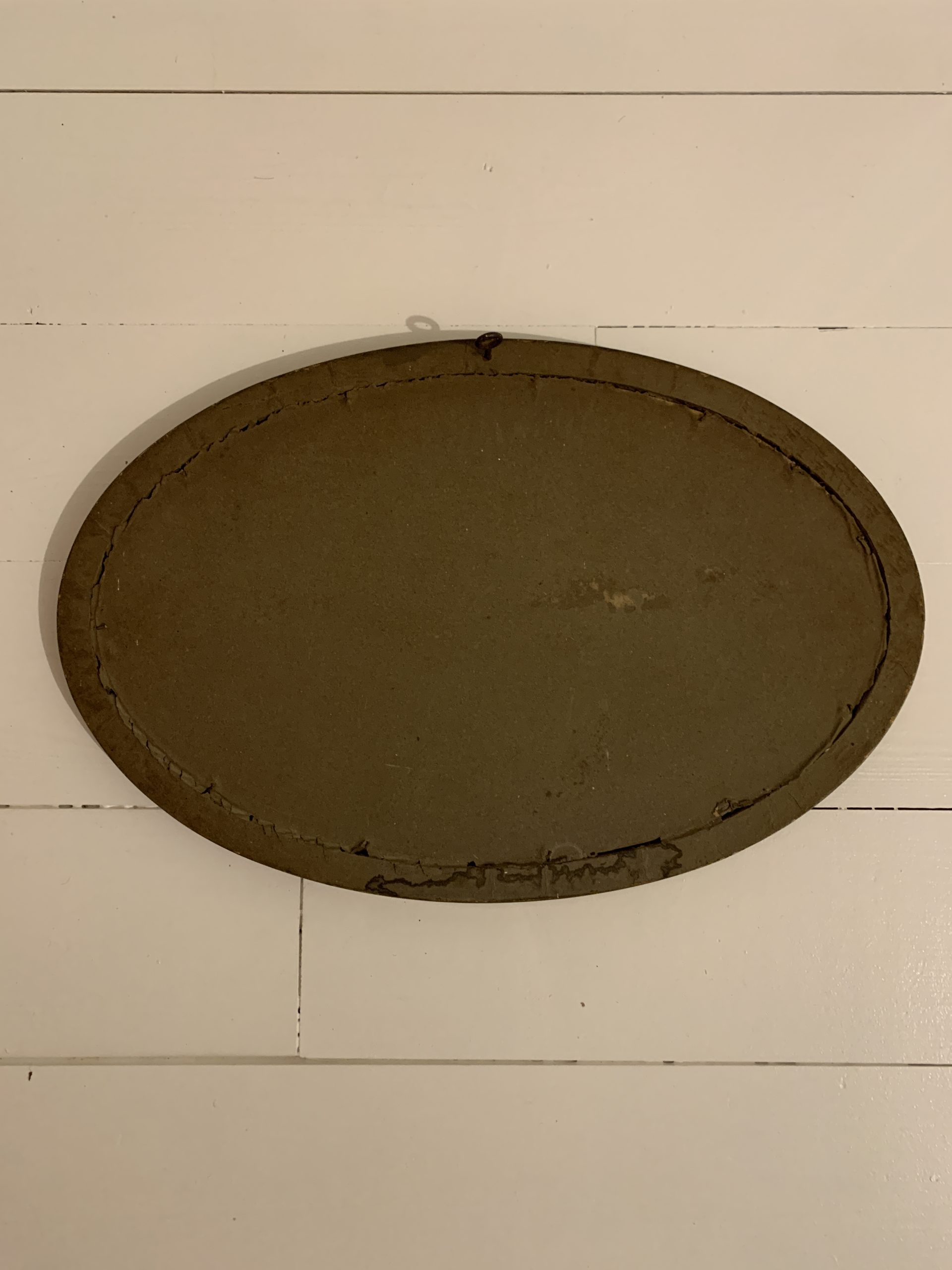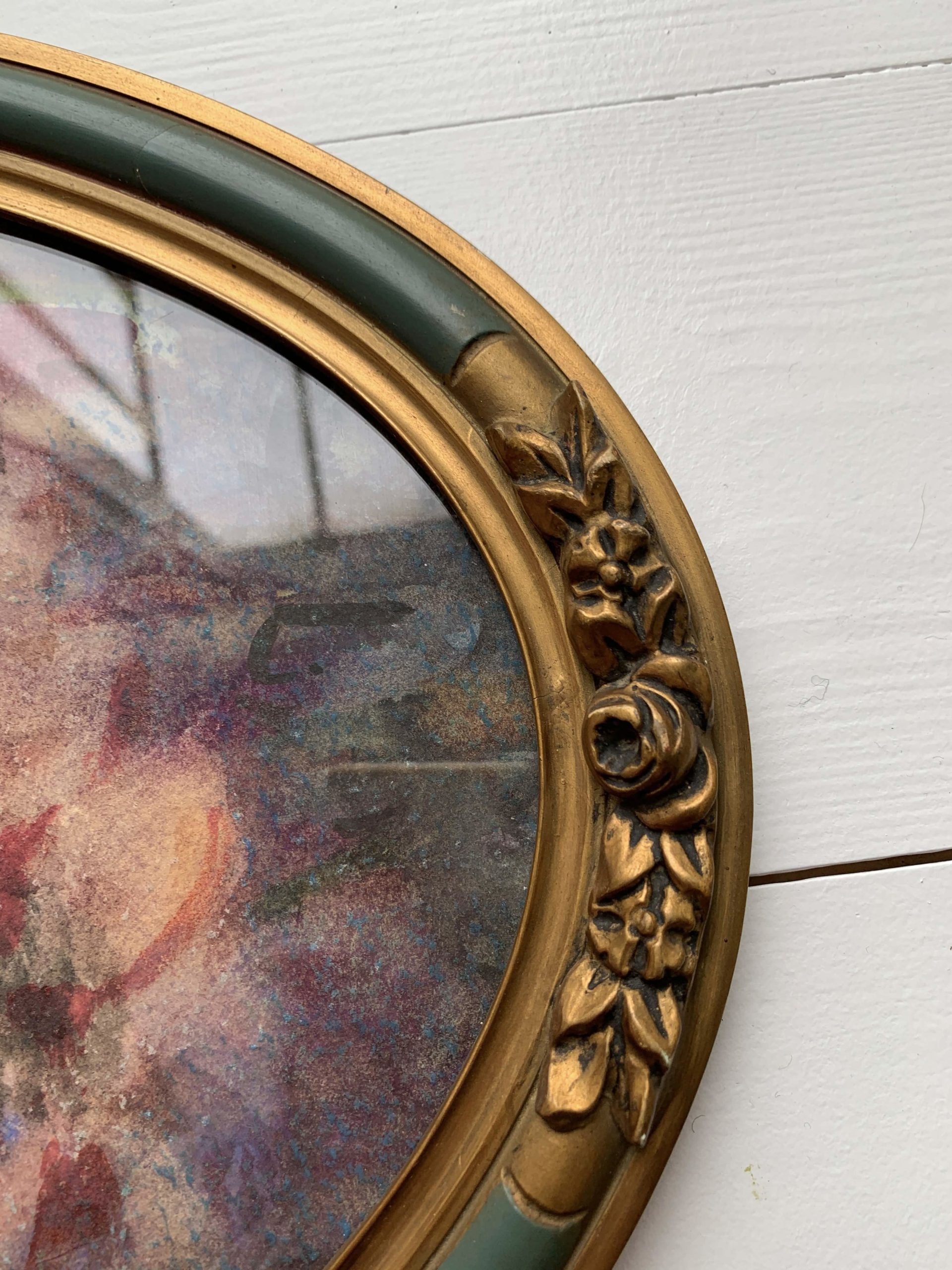 Elle est encadrée dans son cadre en bois et stuc ovale. Le cadre est vitré.