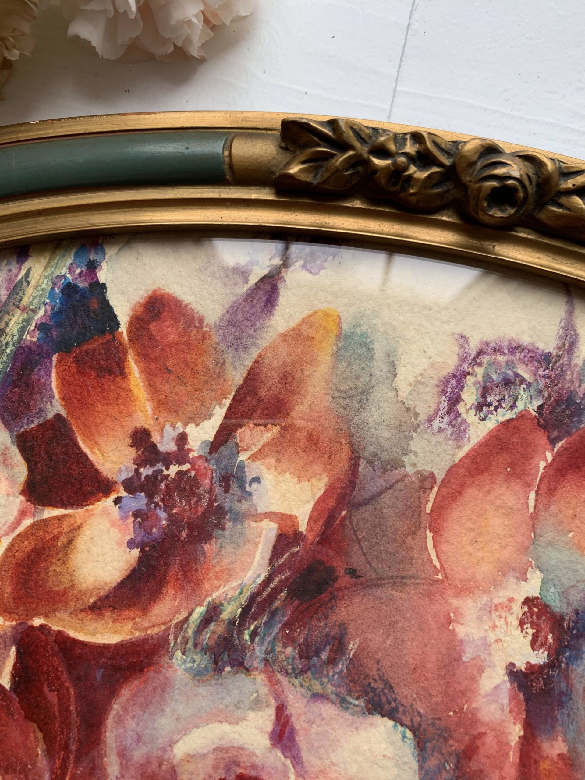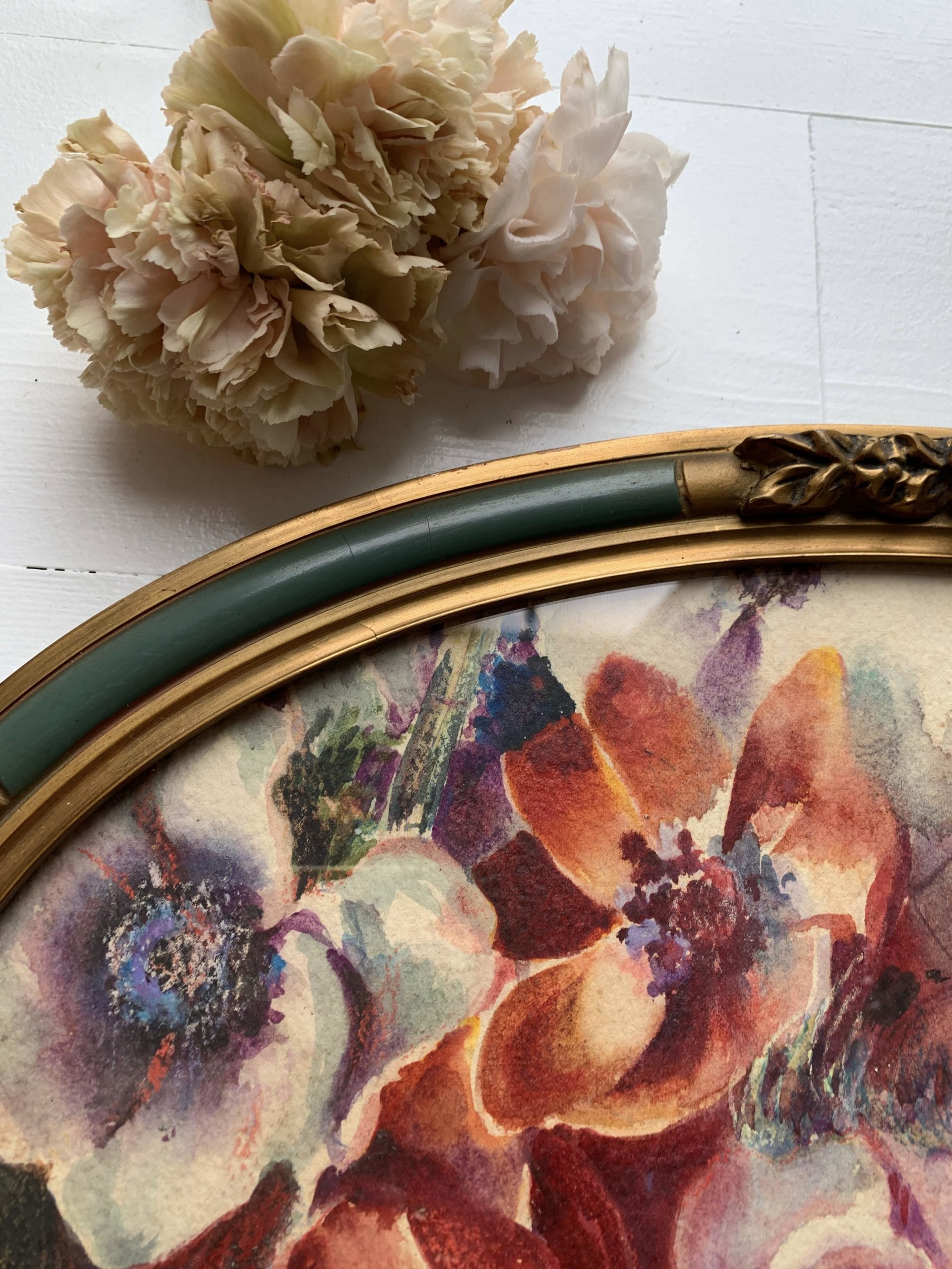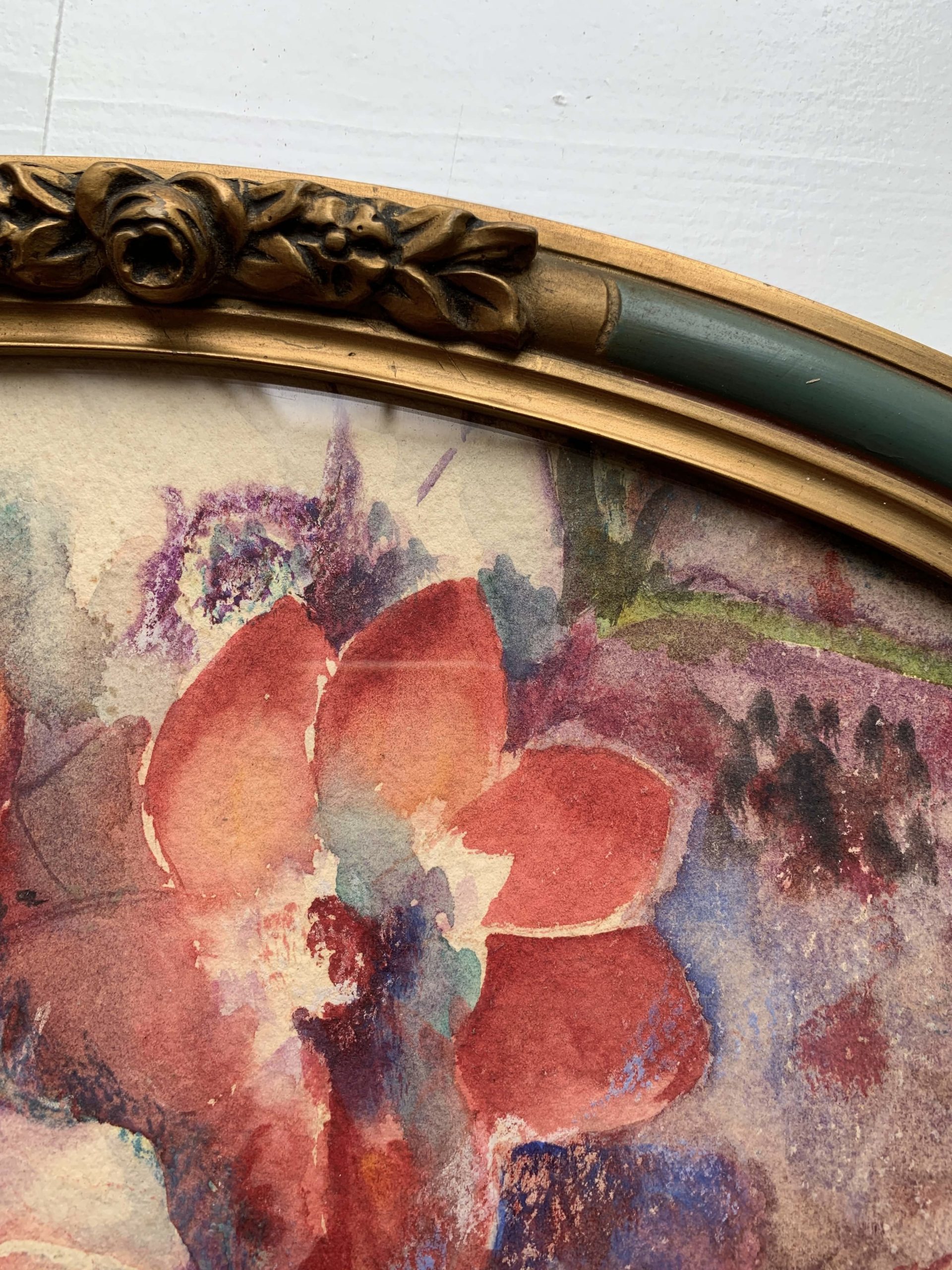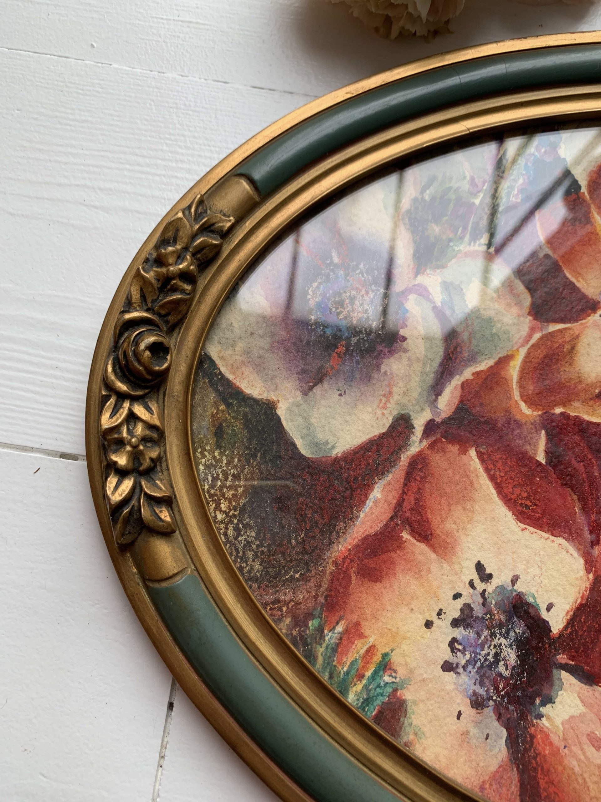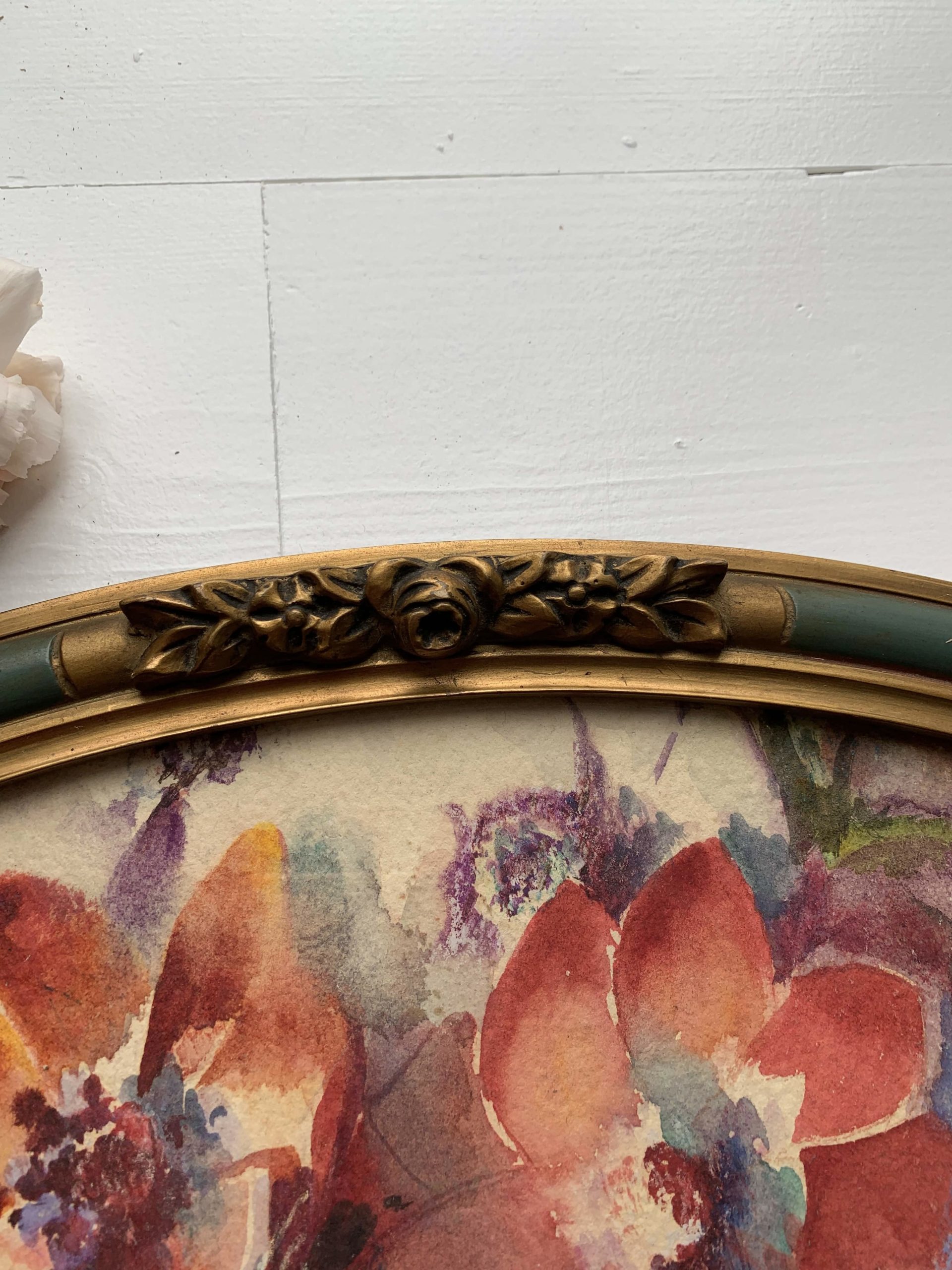 Elle est encadrée dans son cadre en bois et stuc ovale. Le cadre est vitré.