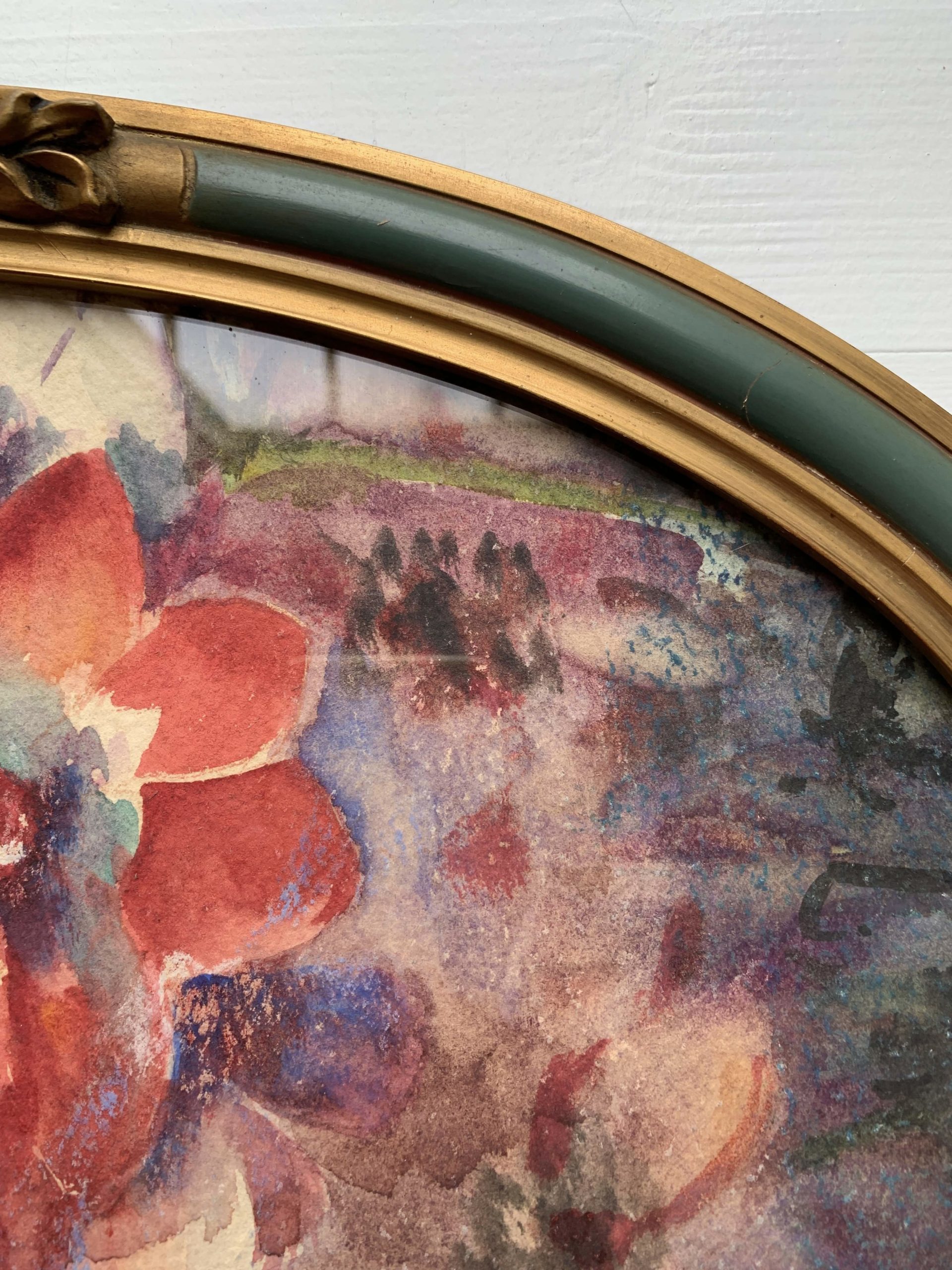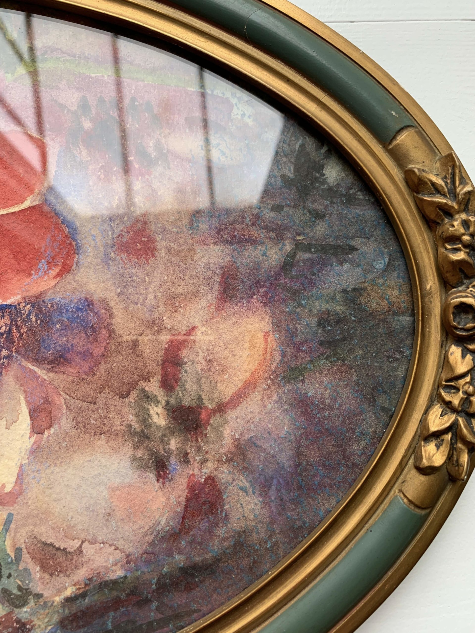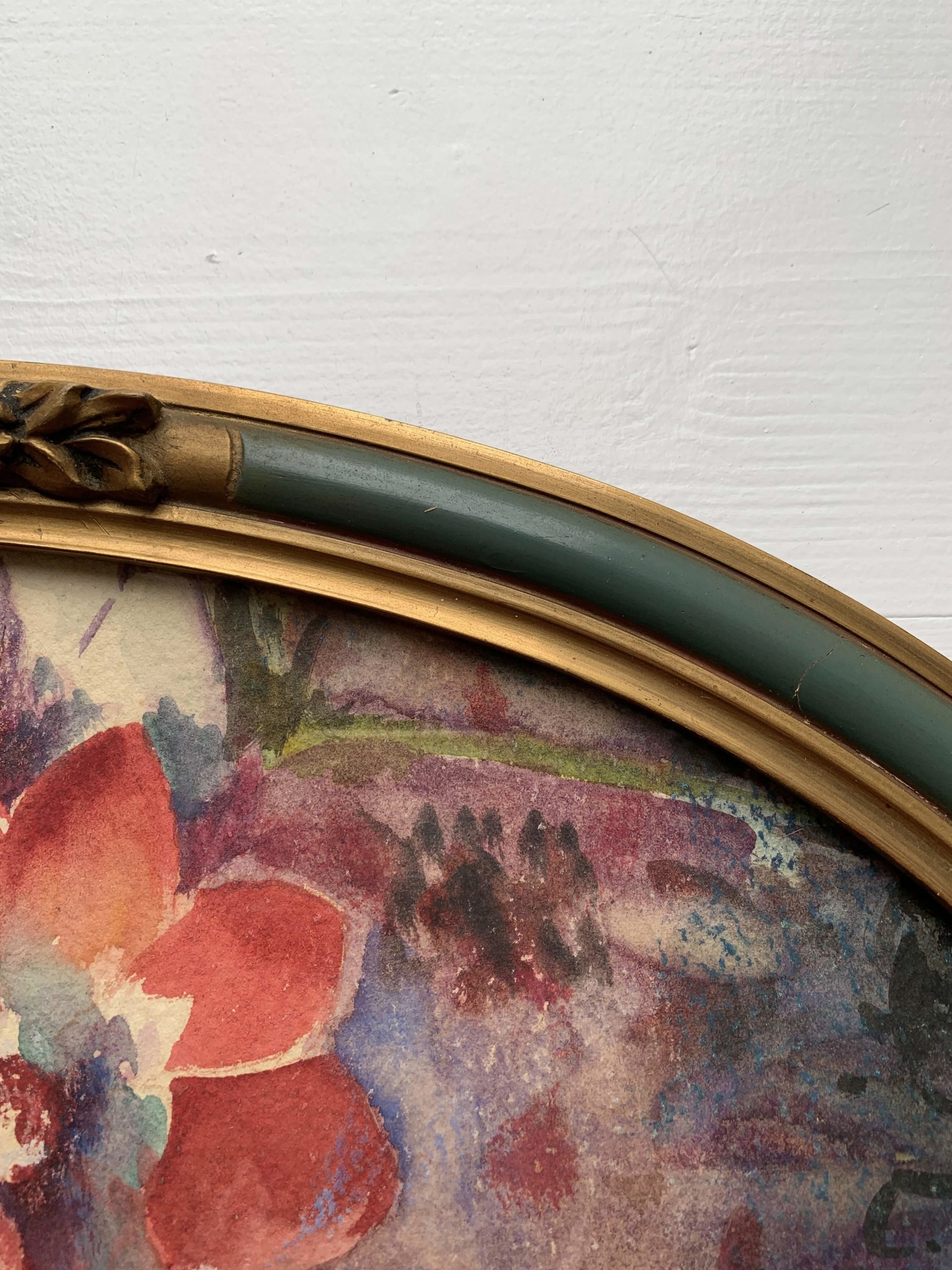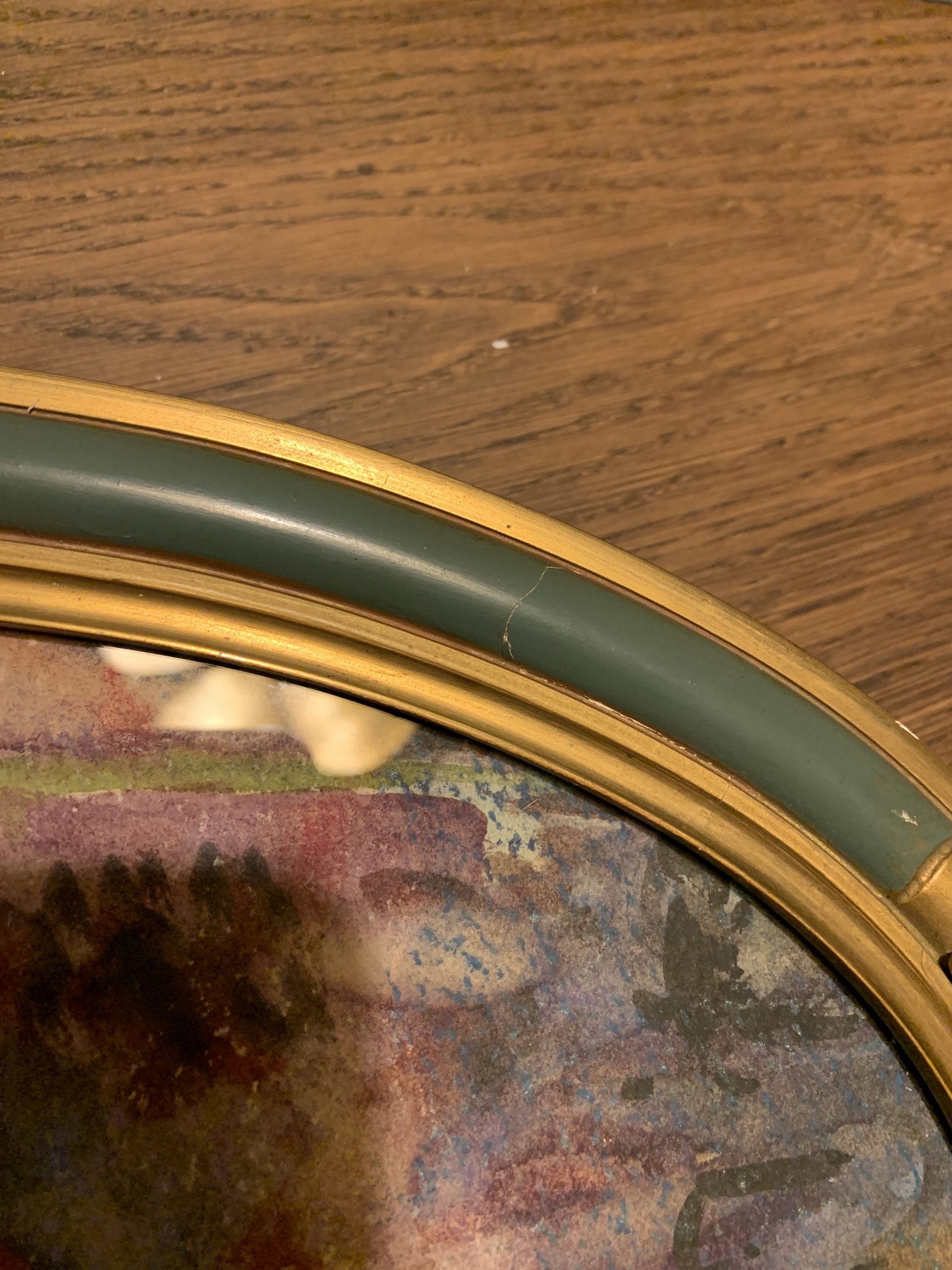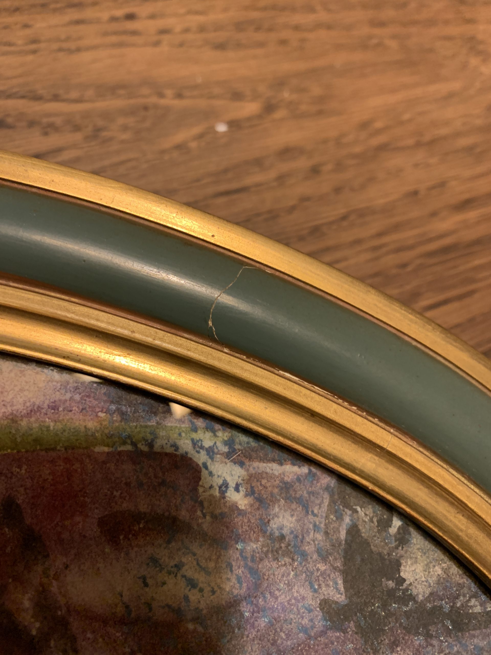 Traces du temps visibles. (Traces, taches, manques, une petite fissure discrète sur le cadre…)