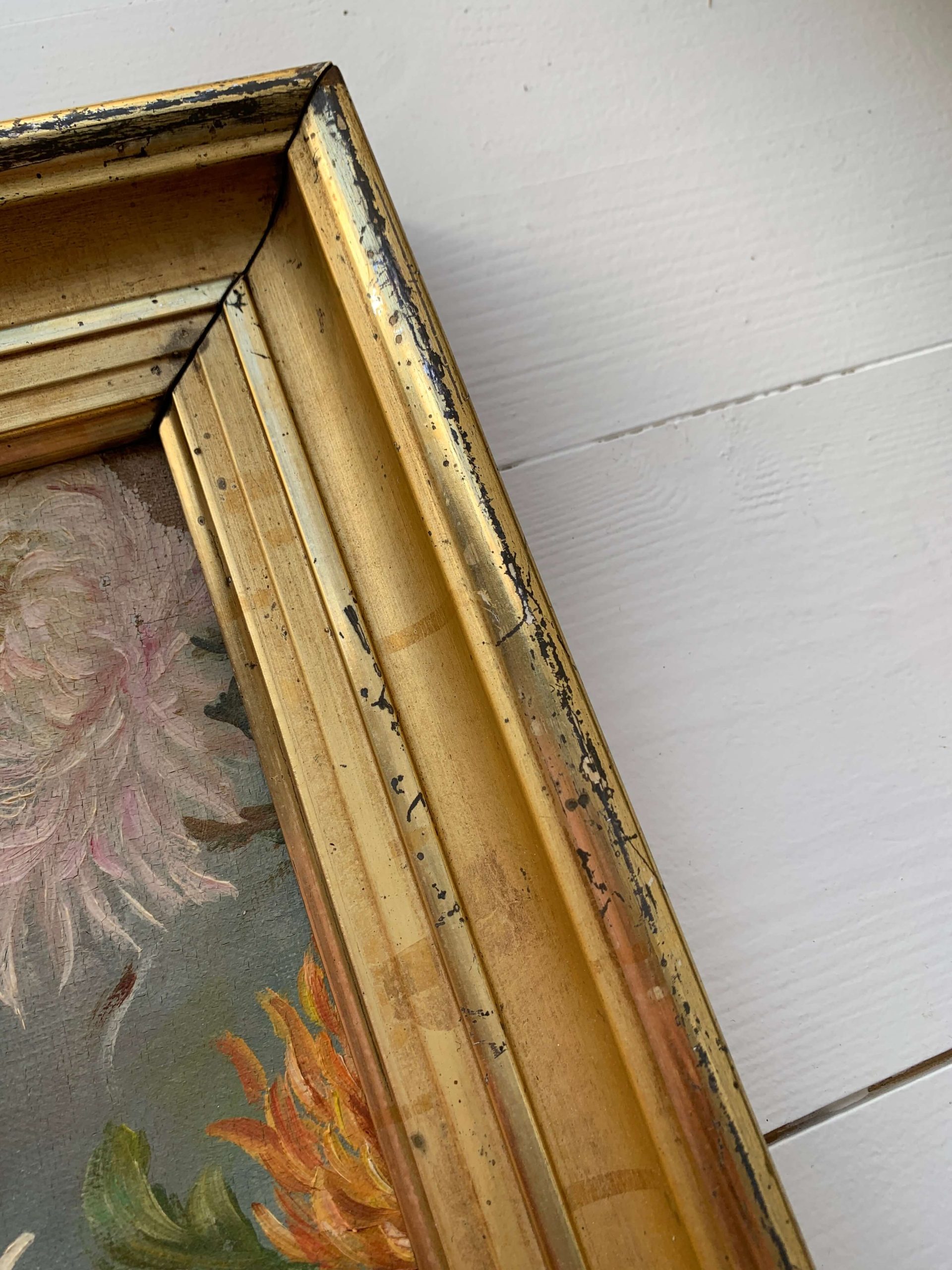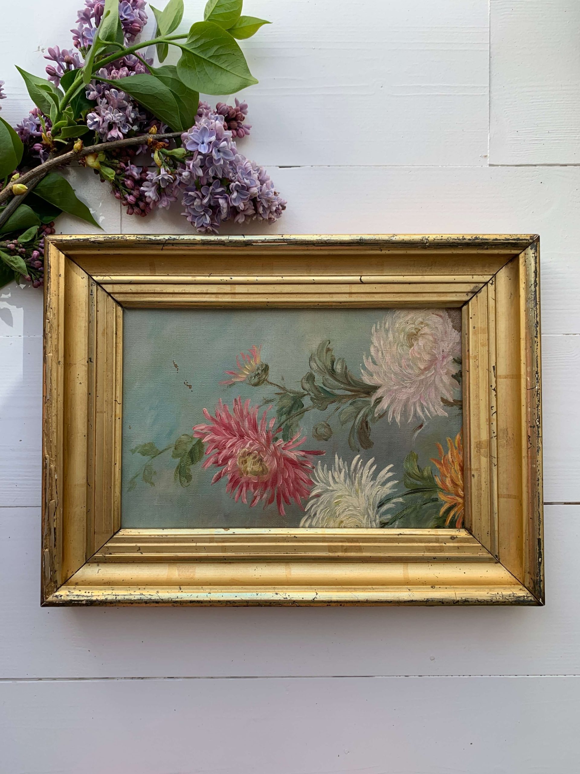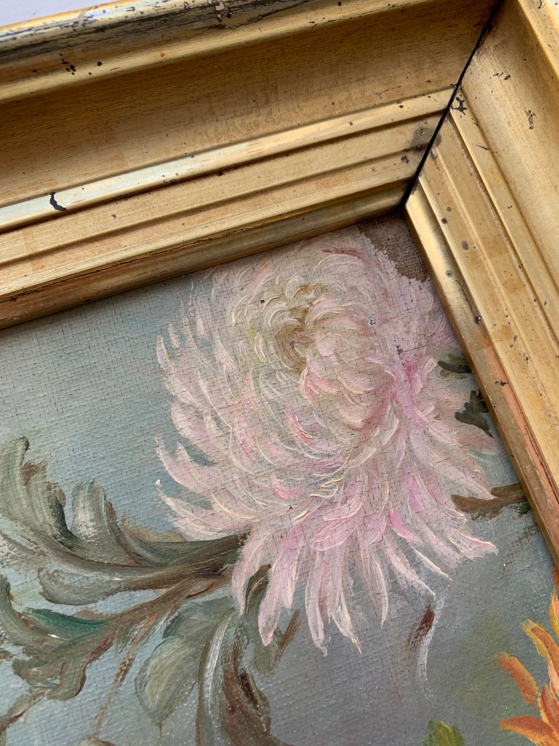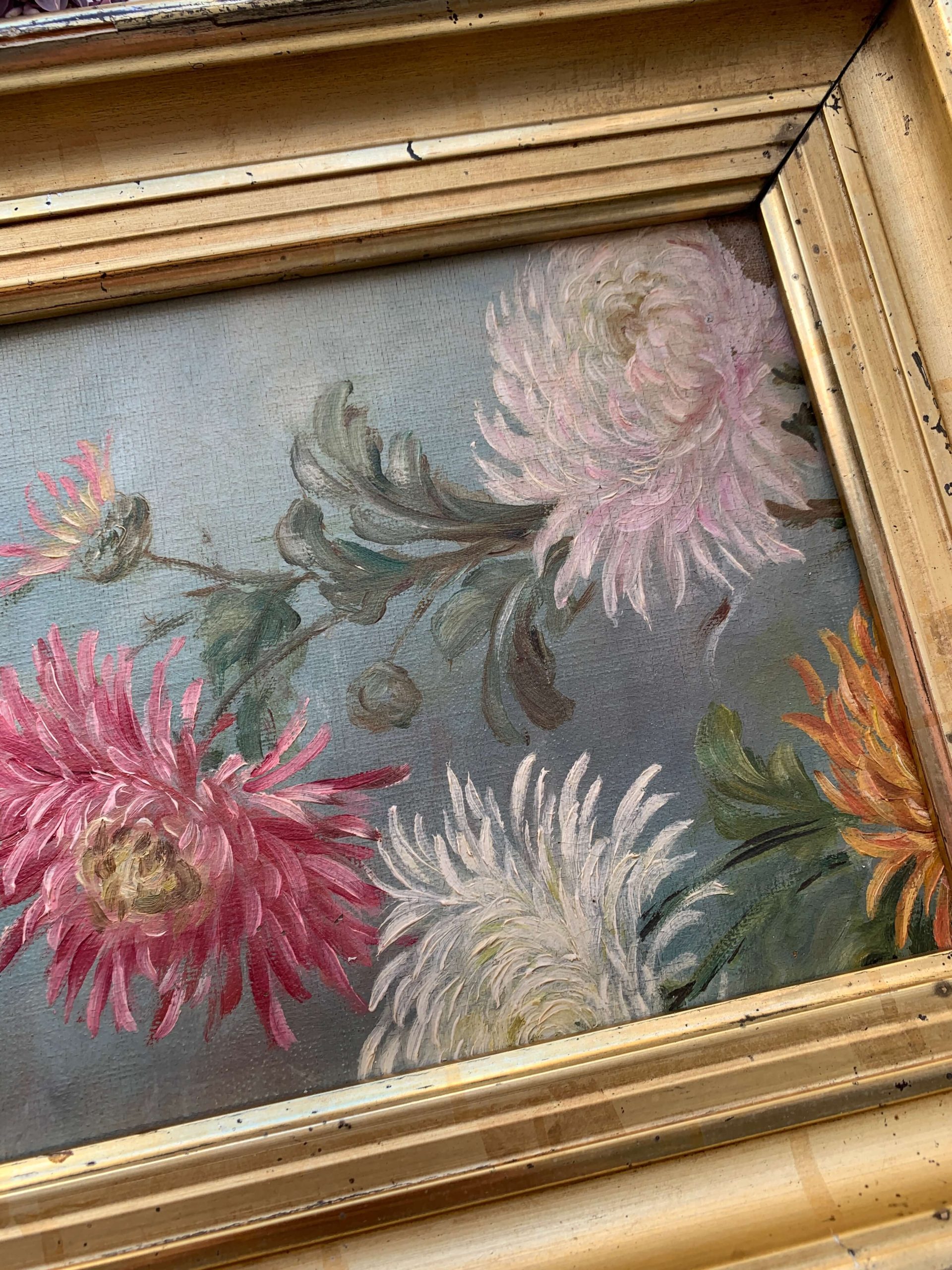 Rupture de stockAncienne huile sur toile marouflée sur carton représentant des chrysanthèmes. Vers 1900.
