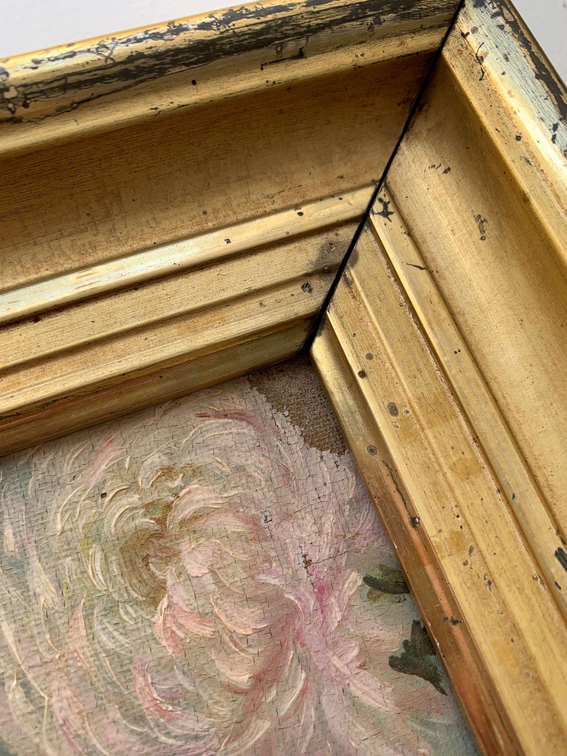 Traces du temps visibles. (Traces, taches, manques sur la peinture et le cadre…)