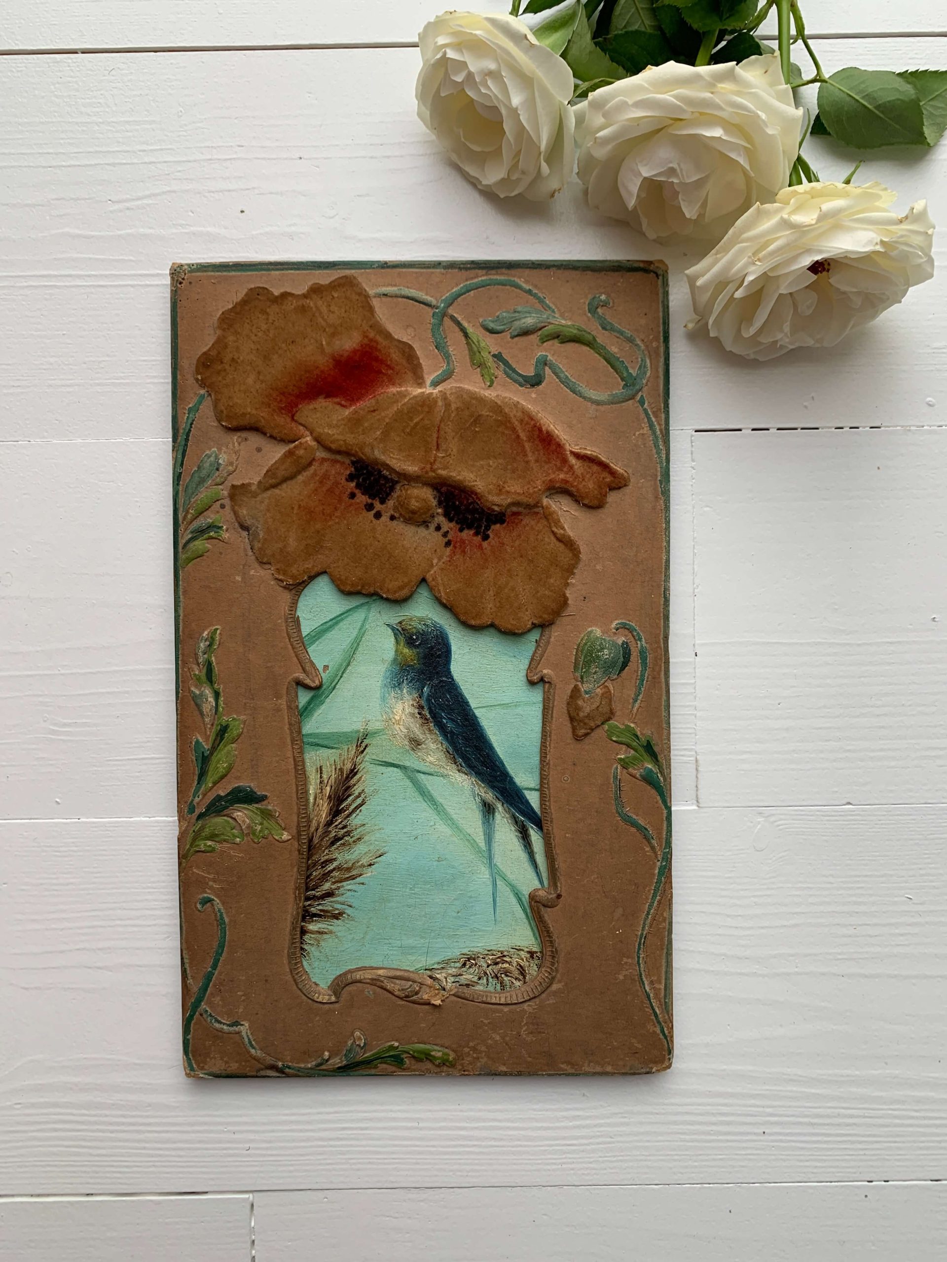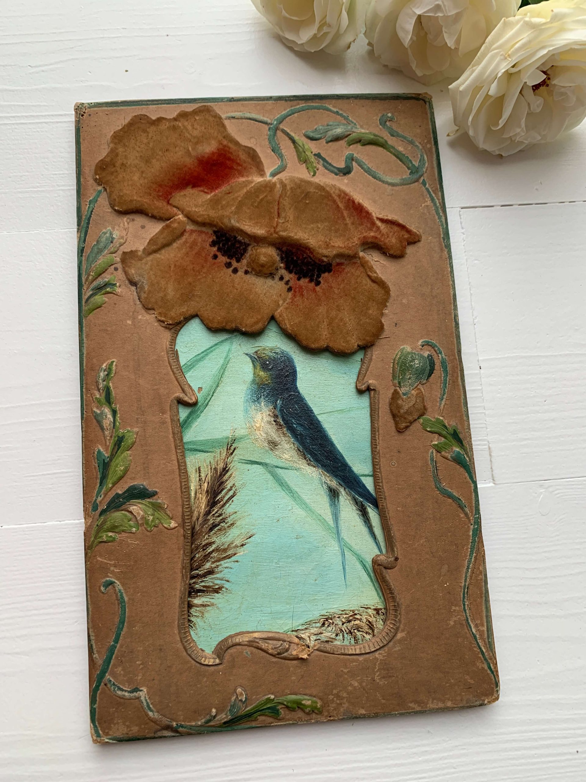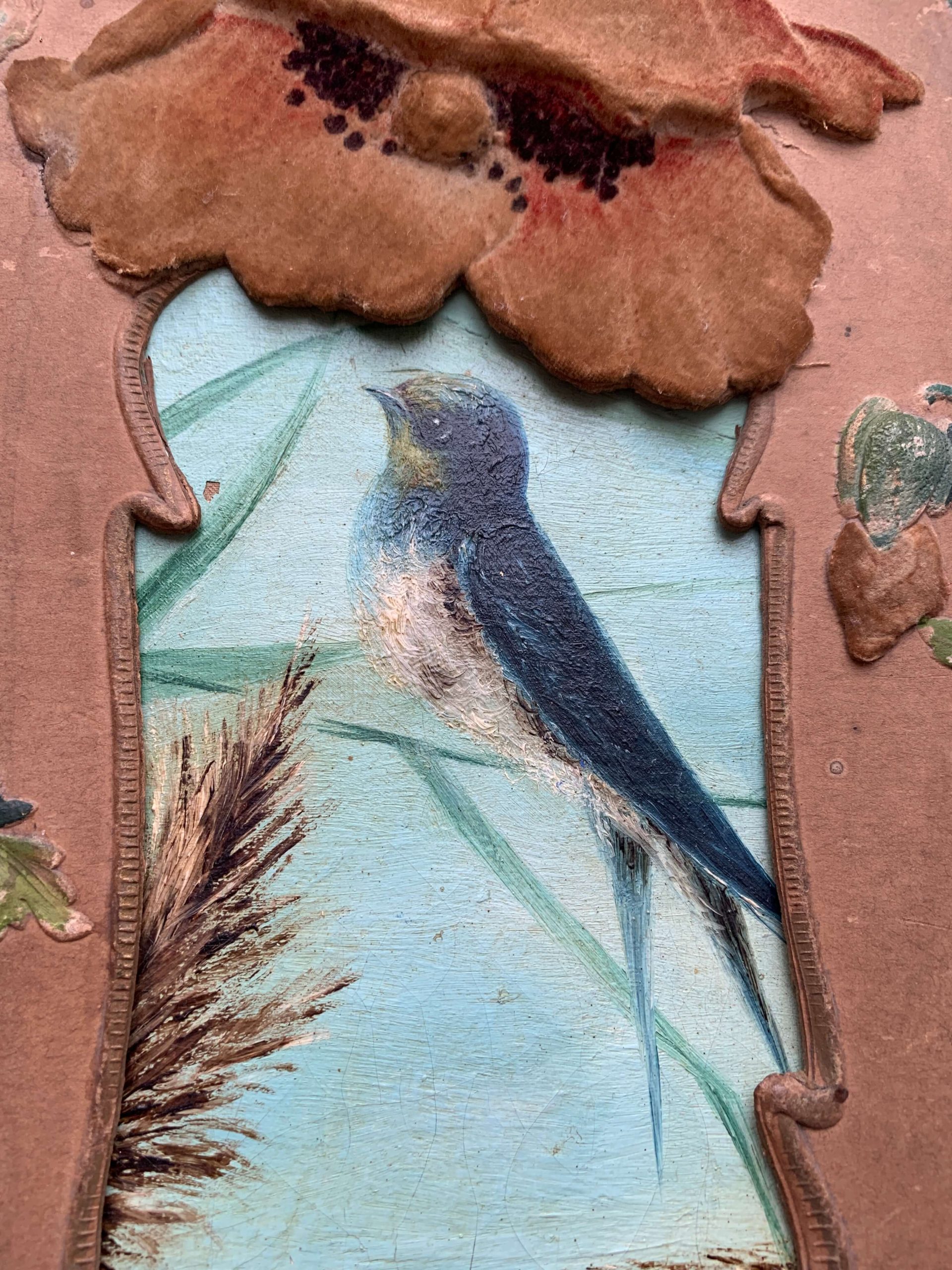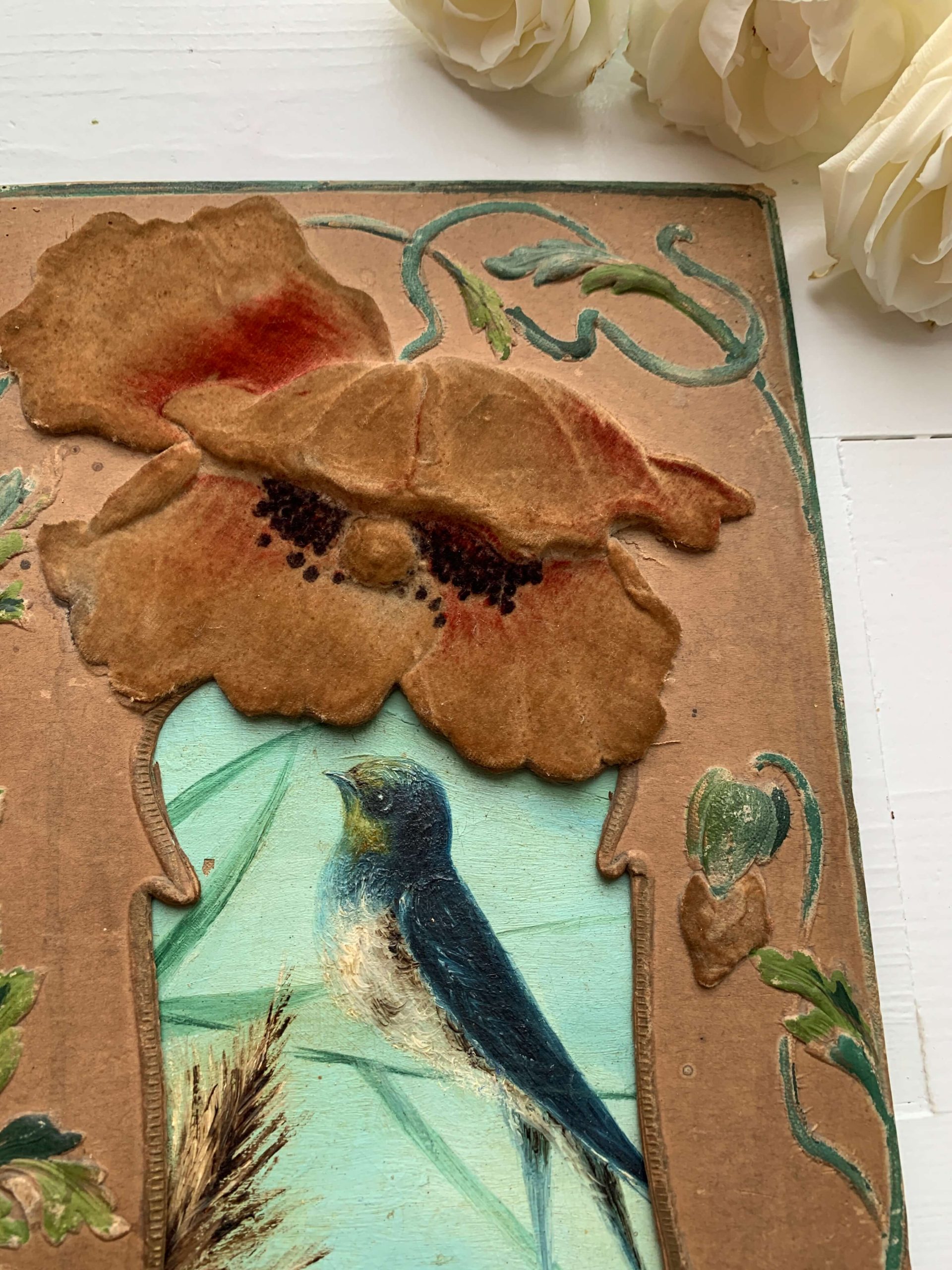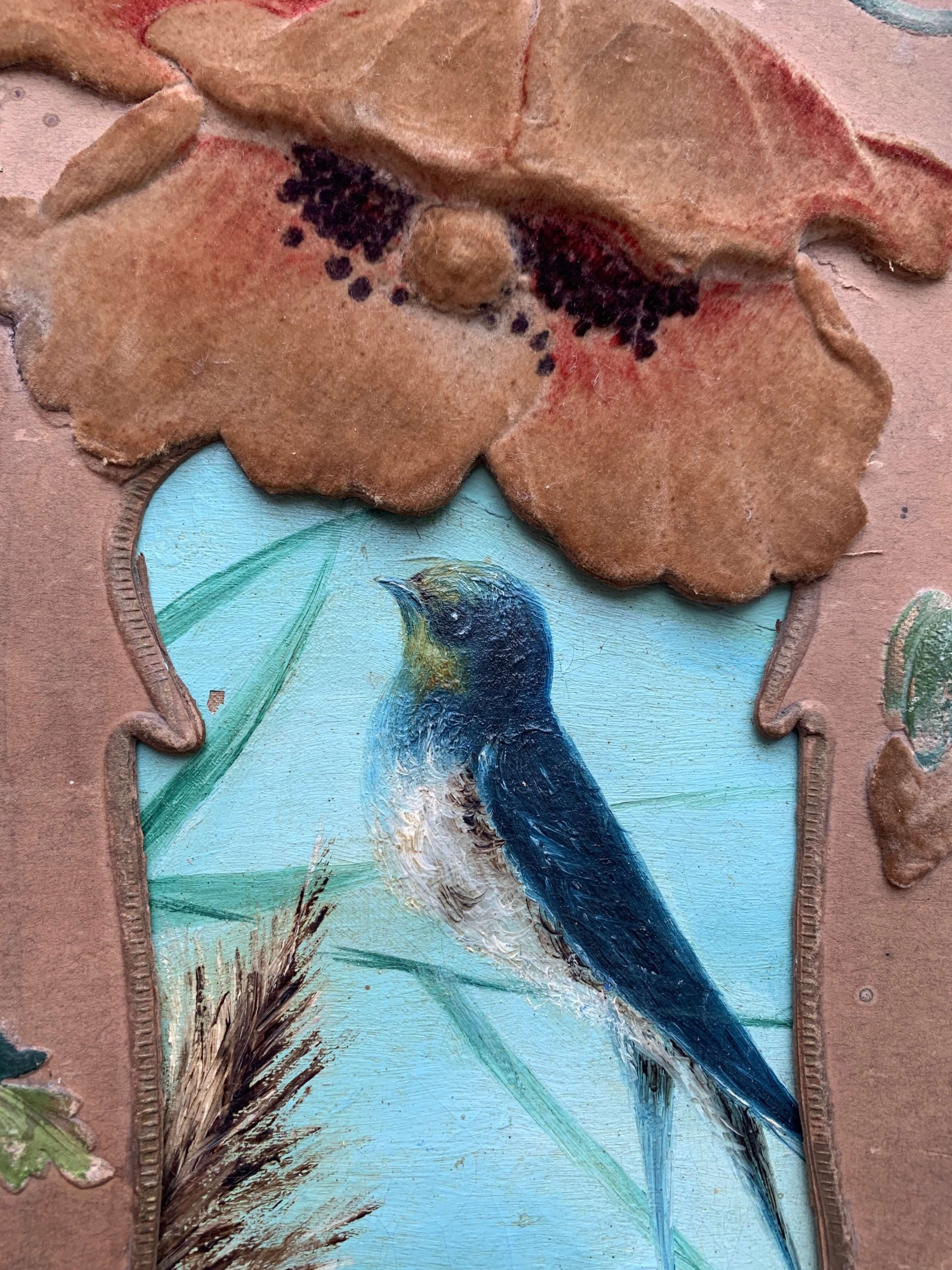 Elle est encadrée dans un superbe cadre art nouveau en carton épais aux décors de coquelicots recouverts d’un velours. Les décors en reliefs sont peints à la main.