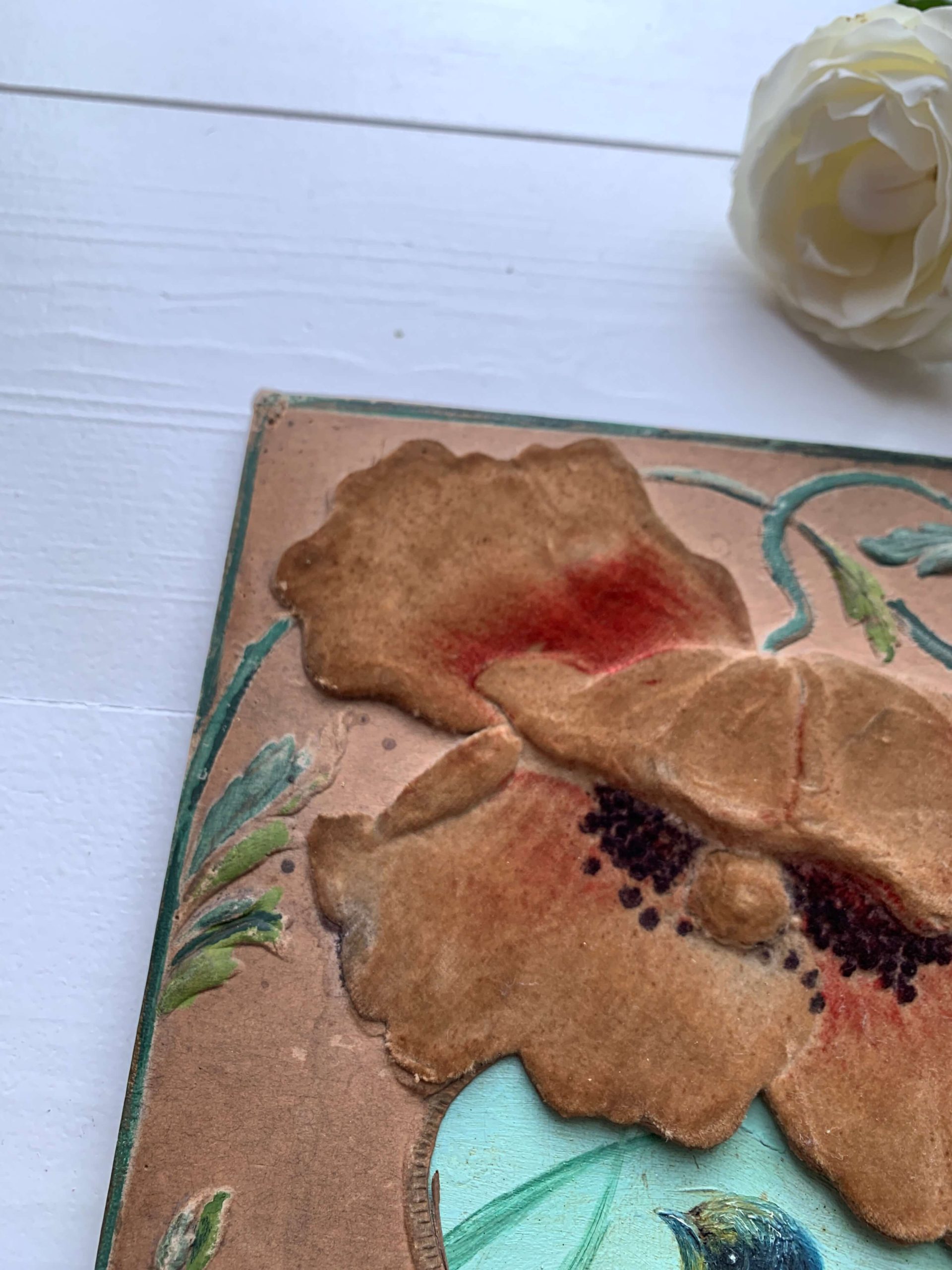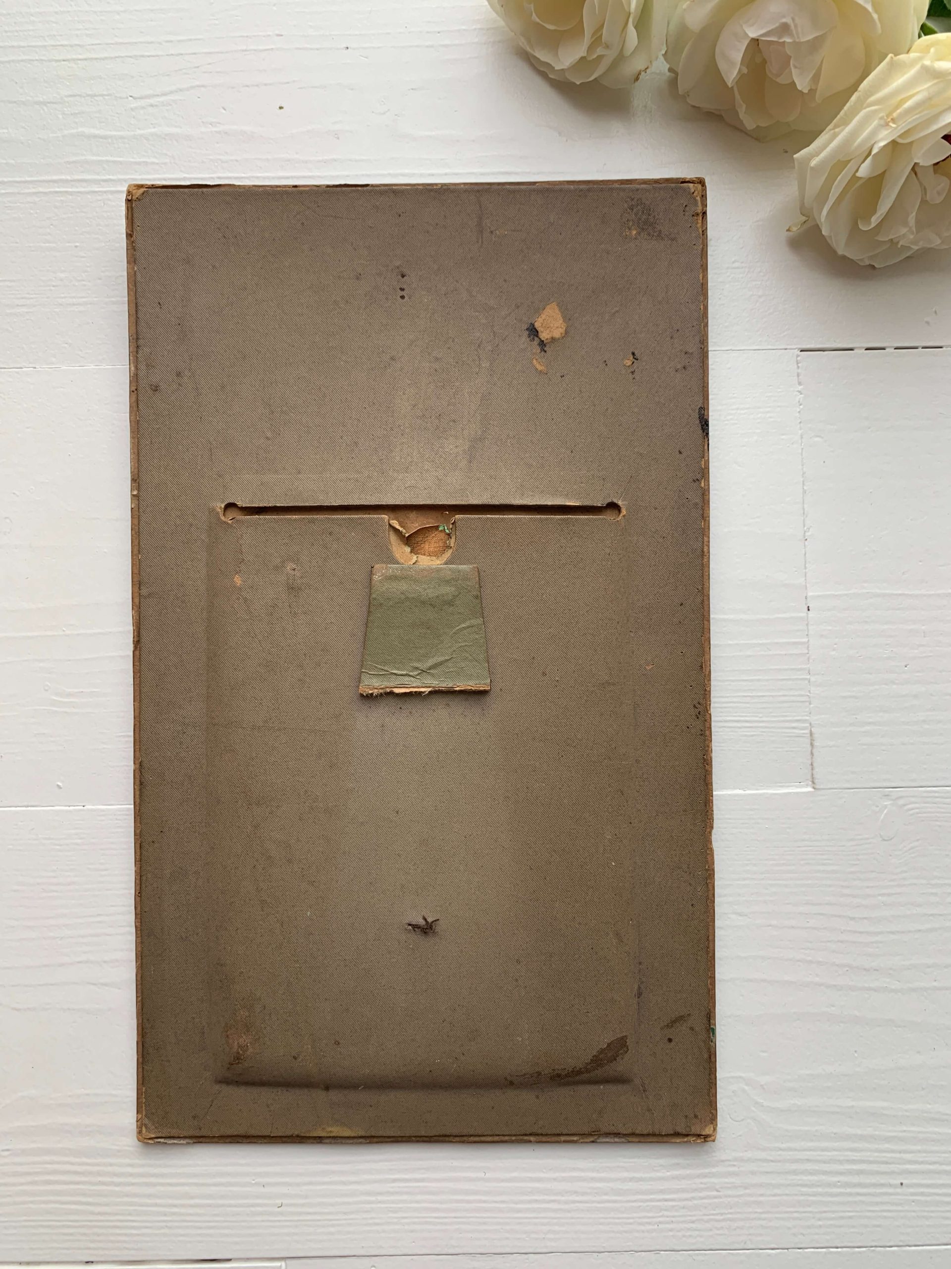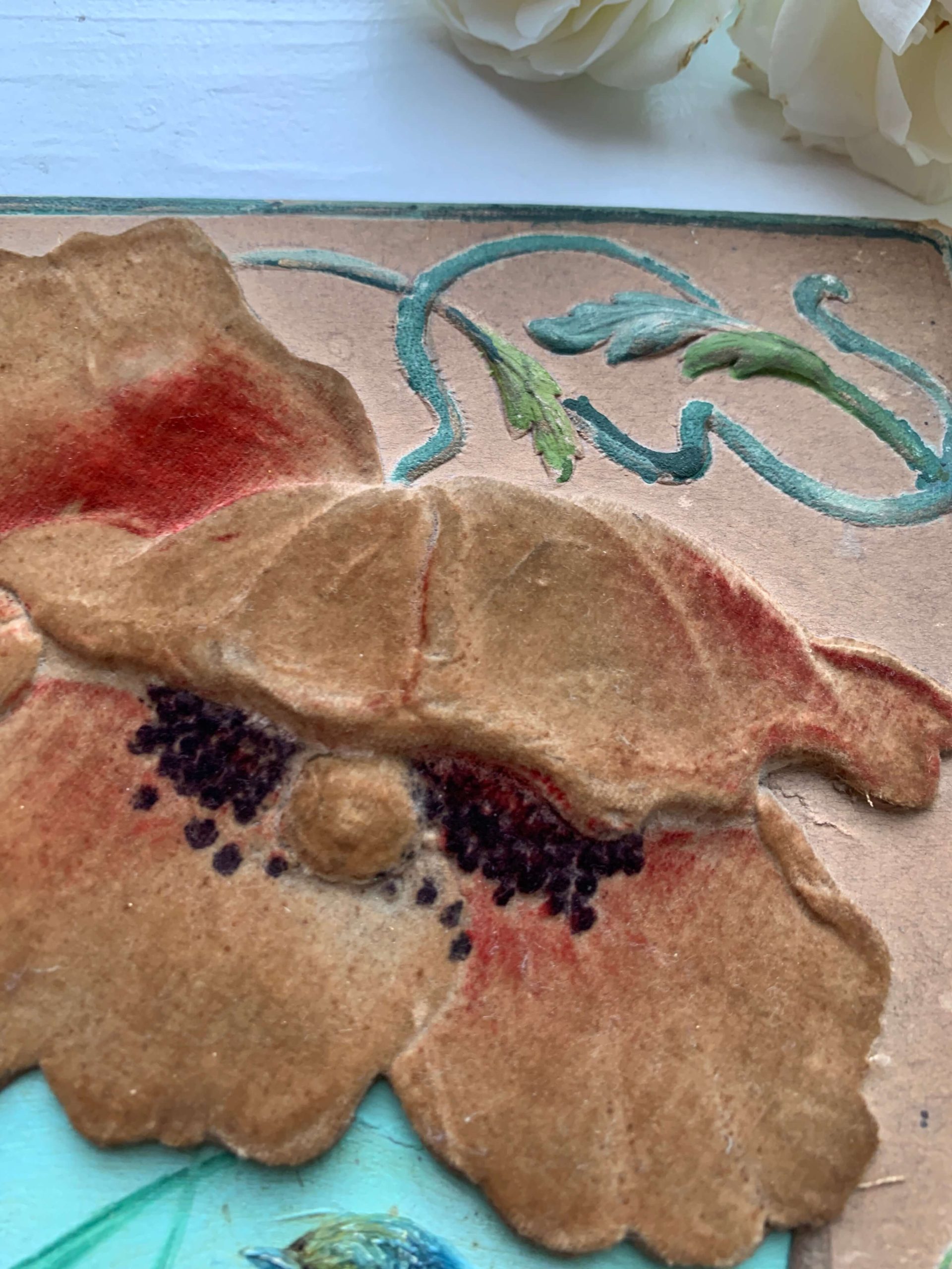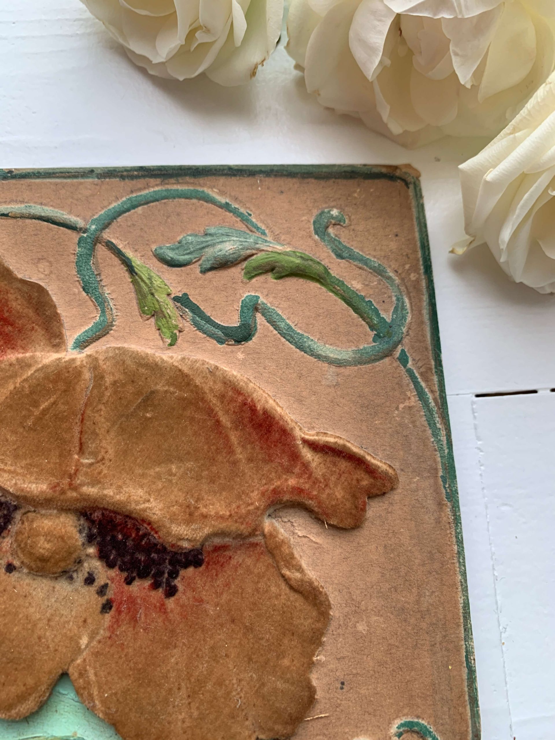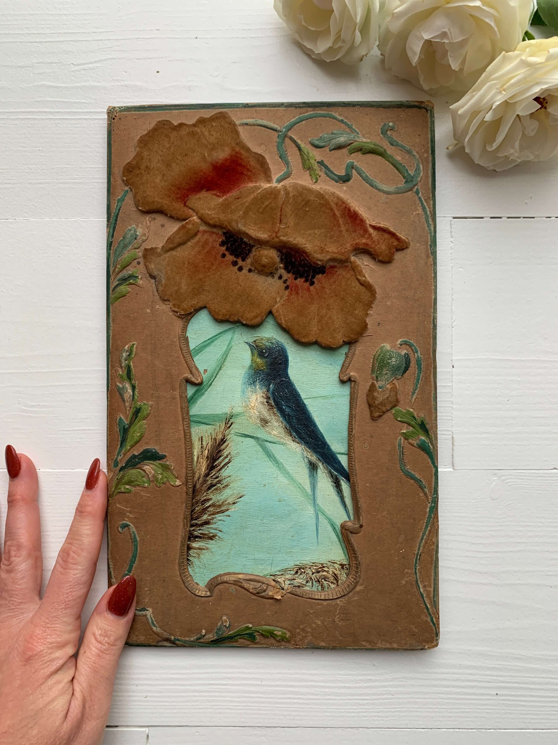 Elle est encadrée dans un superbe cadre art nouveau en carton épais aux décors de coquelicots recouverts d’un velours. Les décors en reliefs sont peints à la main.